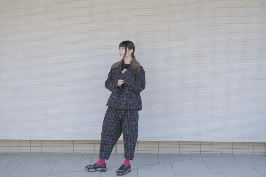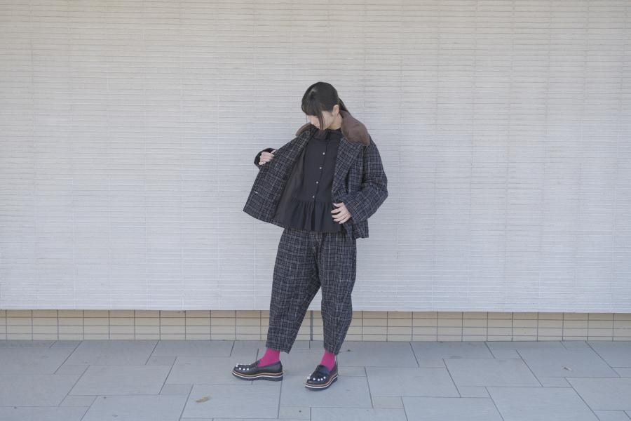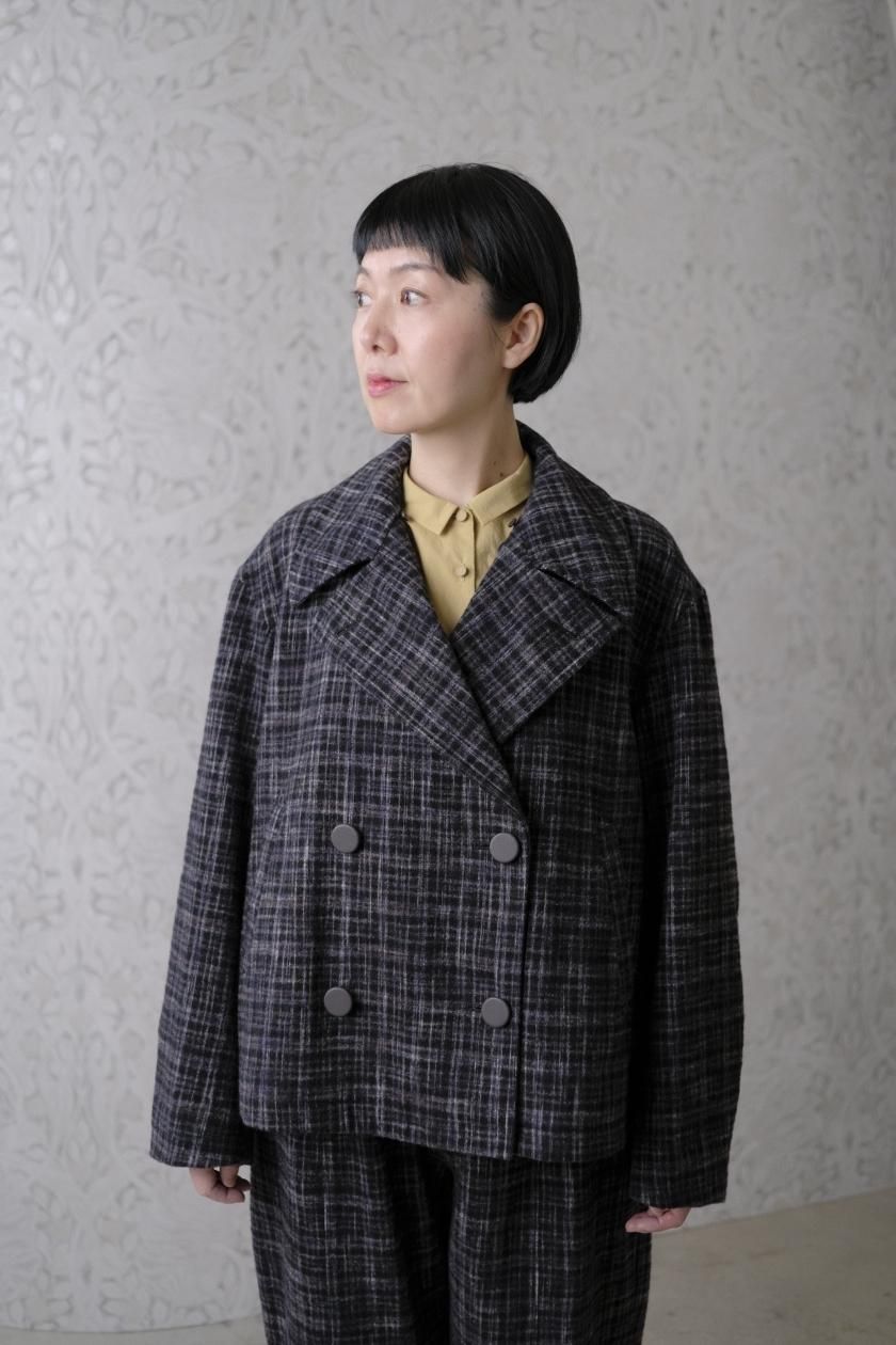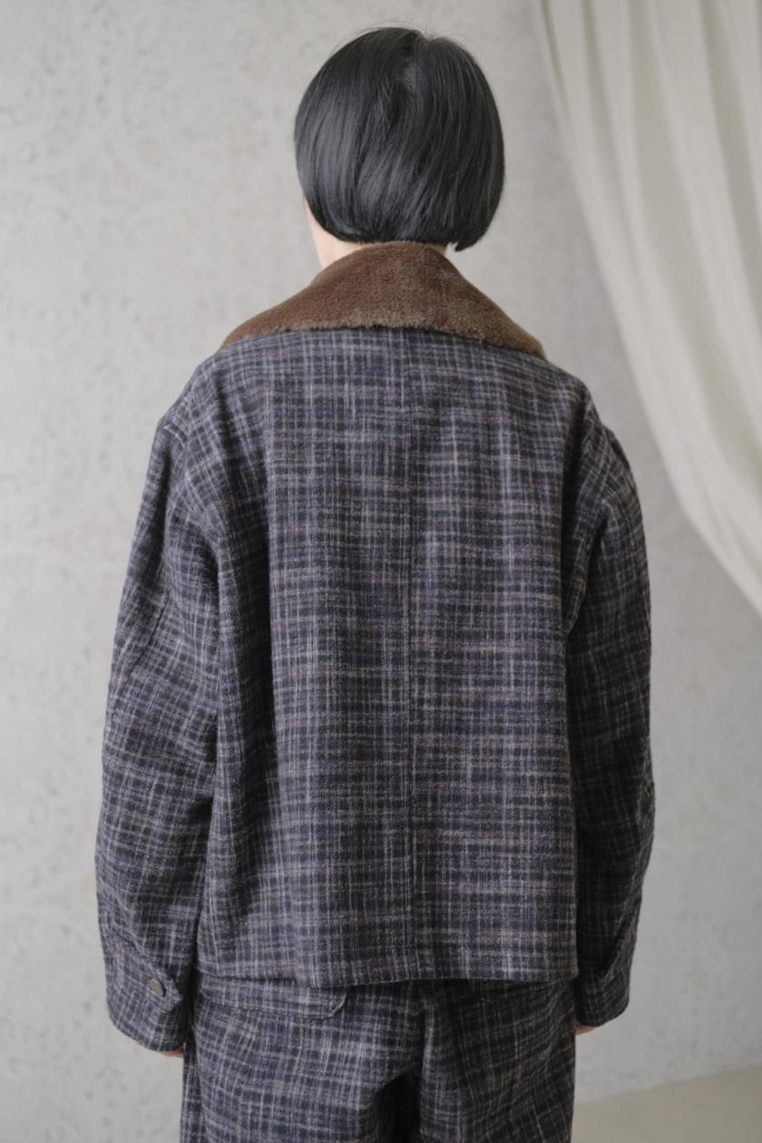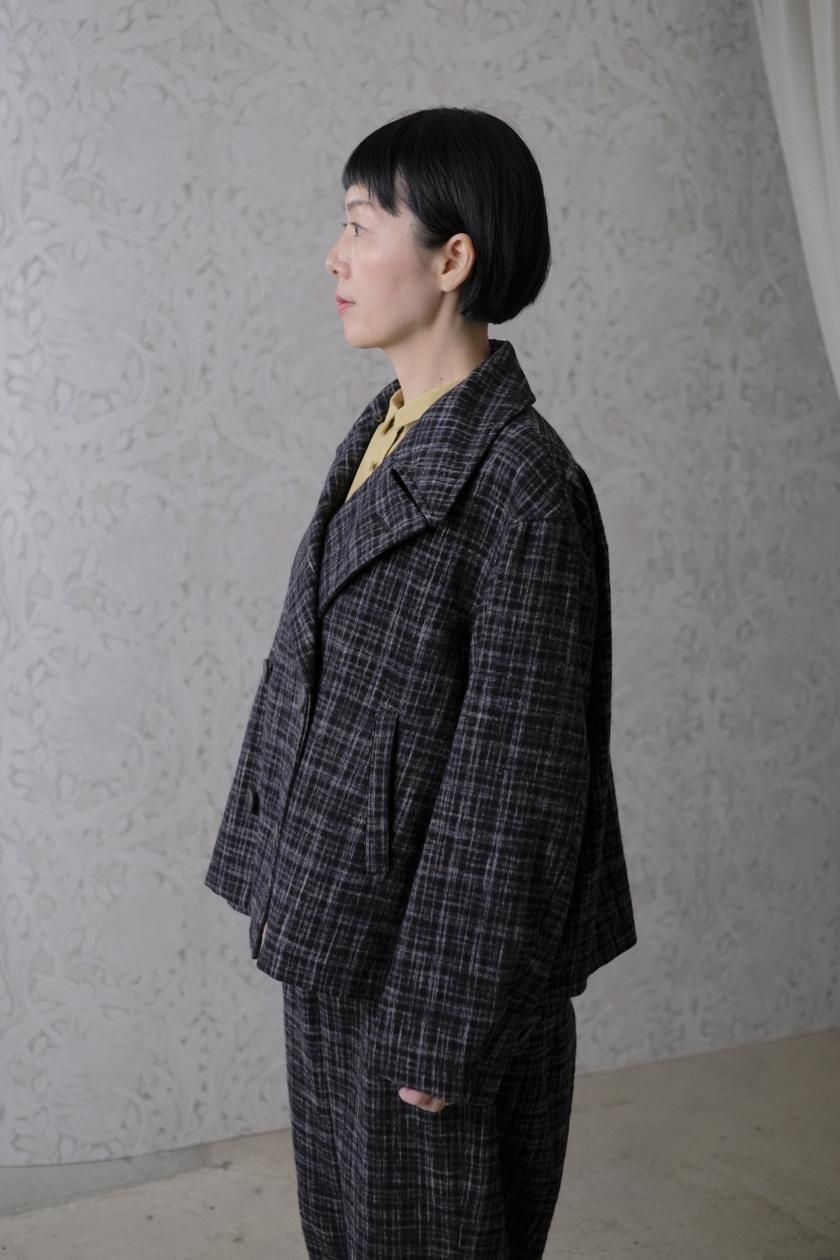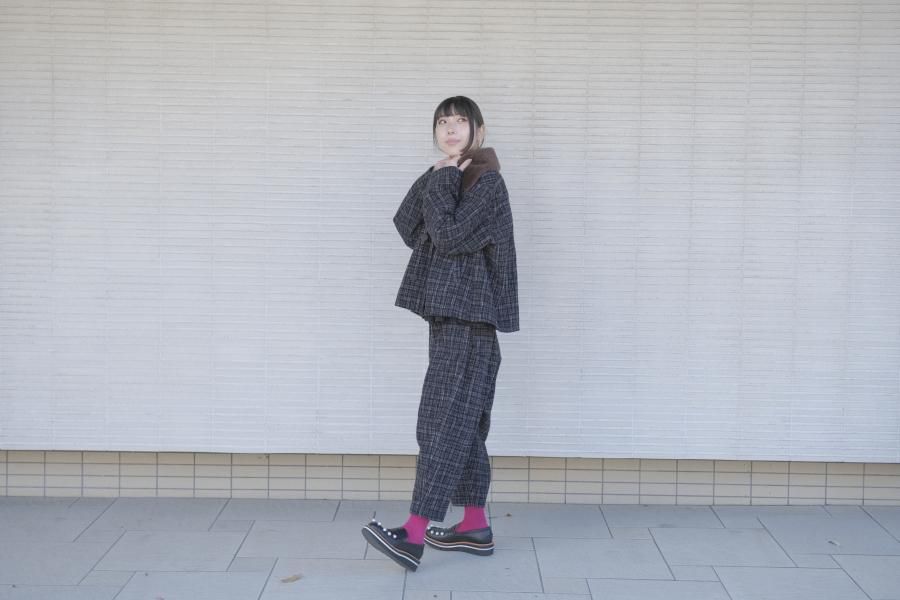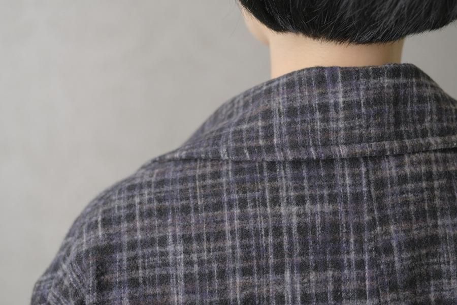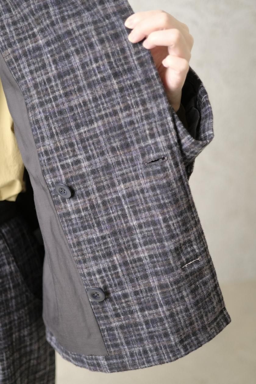 素材は、ウールと、肥料や薬を出来るだけ少なくし、育てる土地のことを鑑みて作付け量の制限まである、太く毛羽が立つ綿とを、無地と多色をランダムにつくれる特殊な技法でつくった糸とに染めて、チェックに織り、更に起毛をかけてぼかした生地を使用しています。