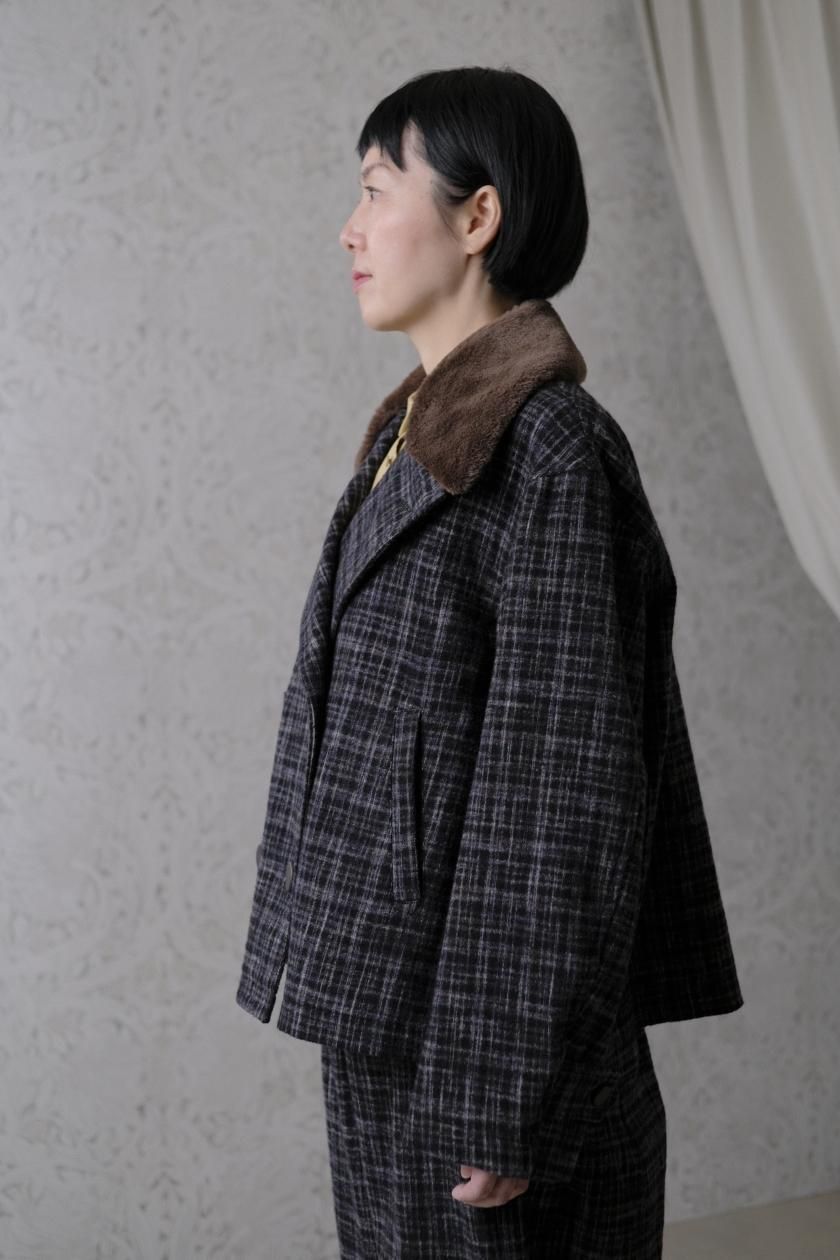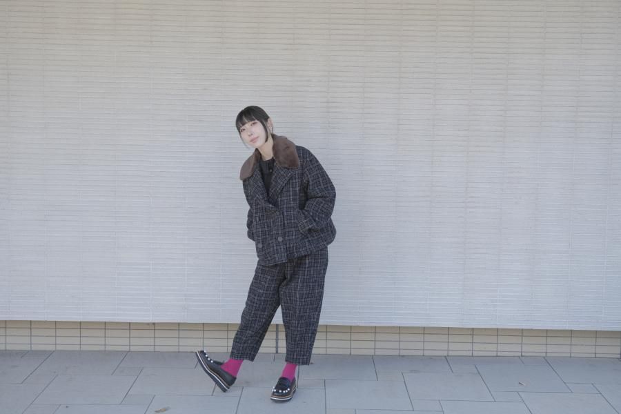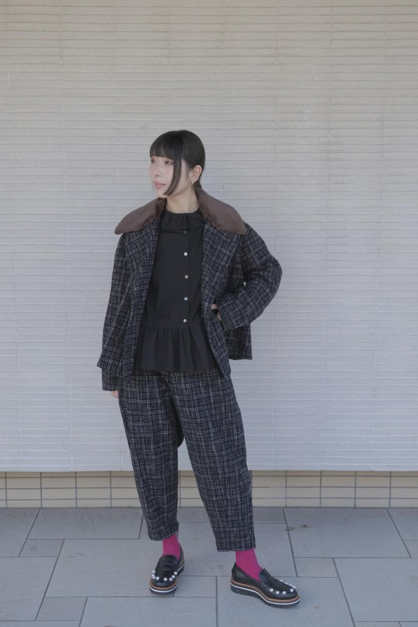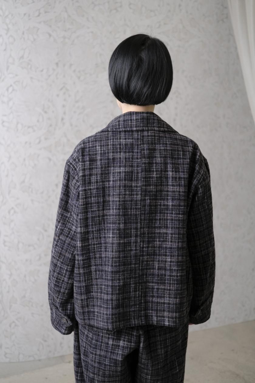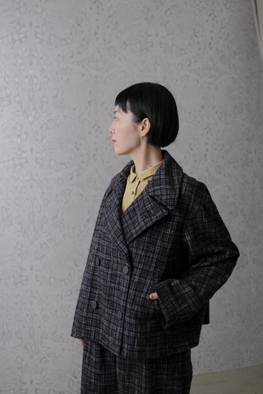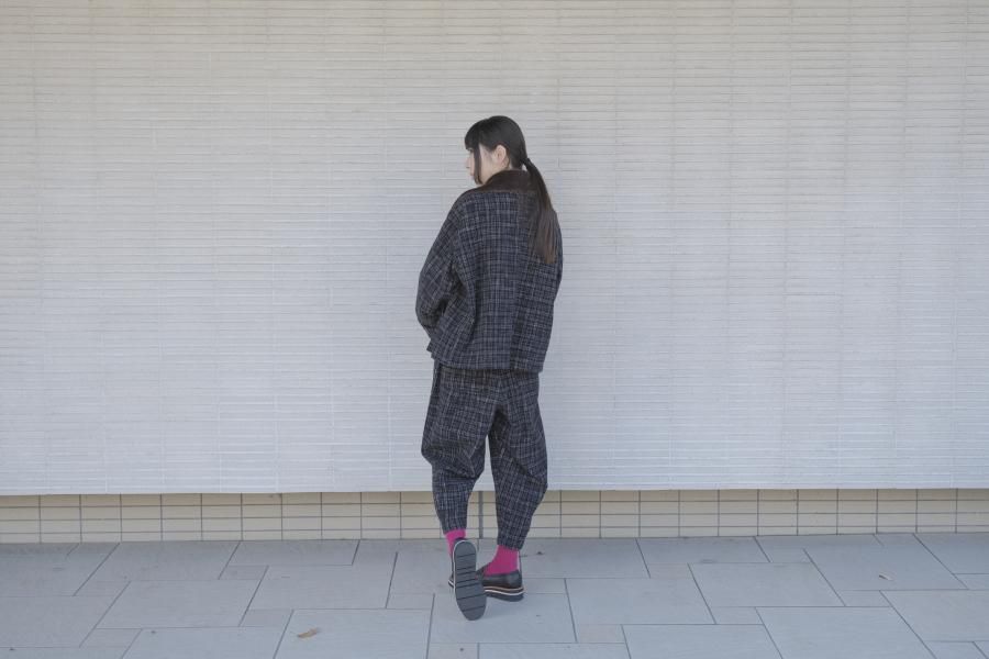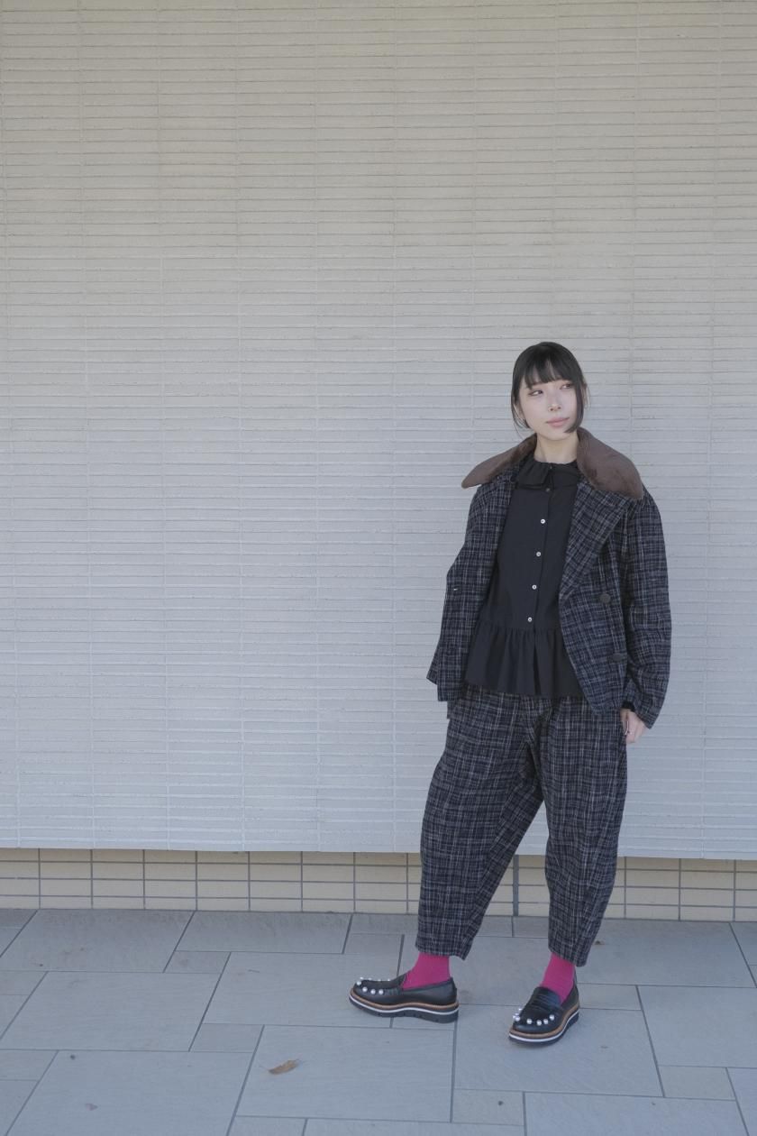 素材は、ウールと、肥料や薬を出来るだけ少なくし、育てる土地のことを鑑みて作付け量の制限まである、太く毛羽が立つ綿とを、無地と多色をランダムにつくれる特殊な技法でつくった糸とに染めて、チェックに織り、更に起毛をかけてぼかした生地を使用しています。