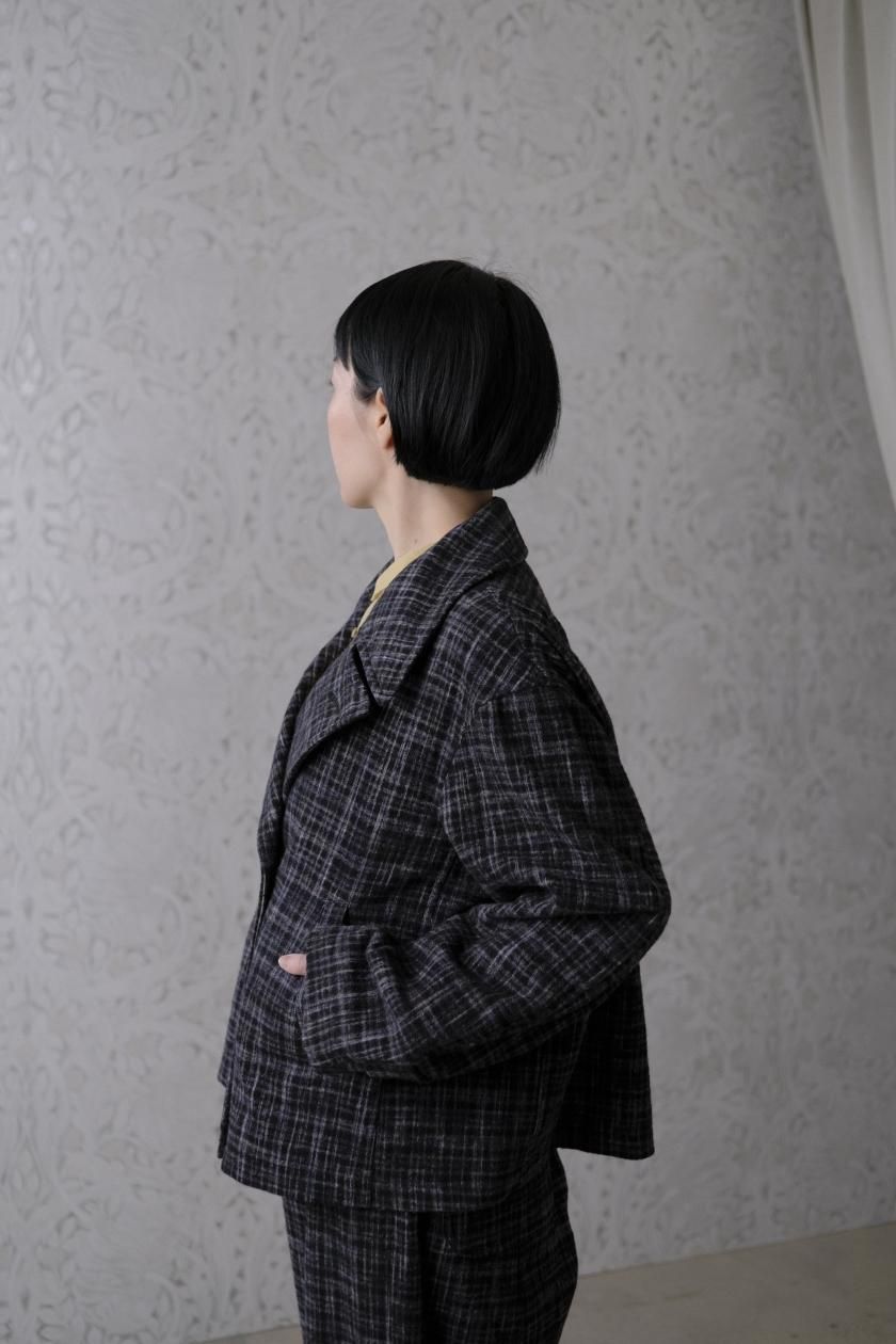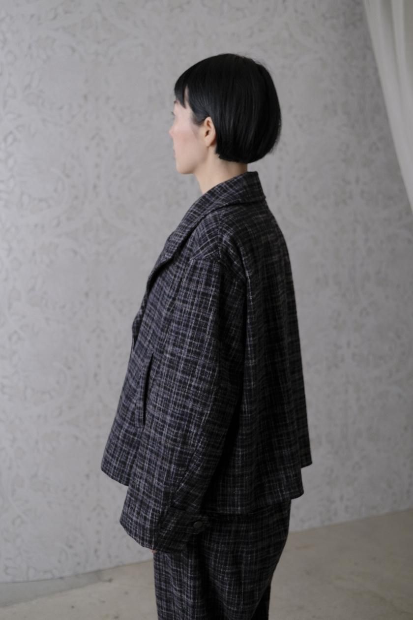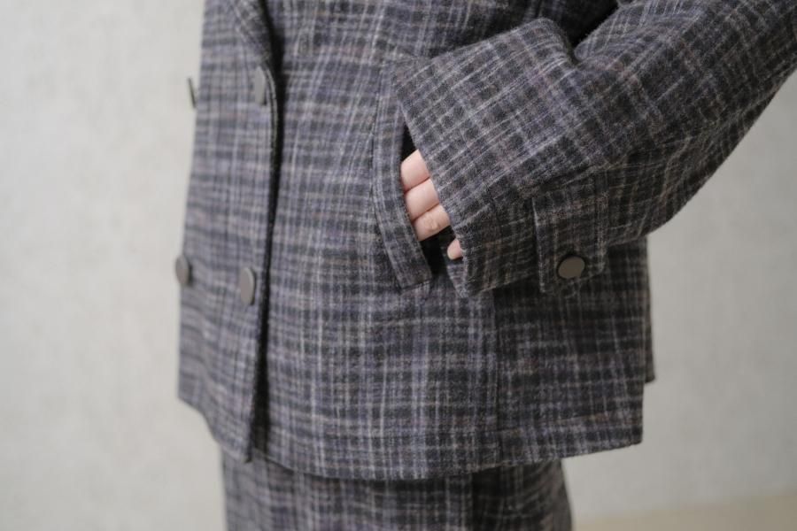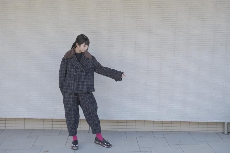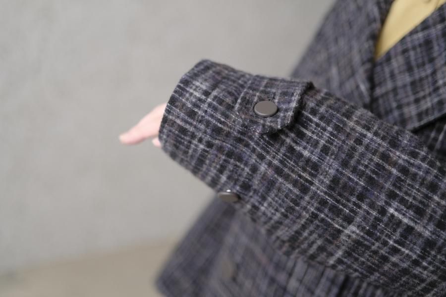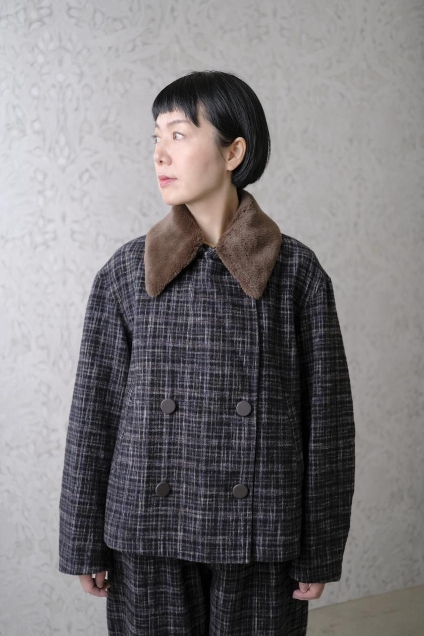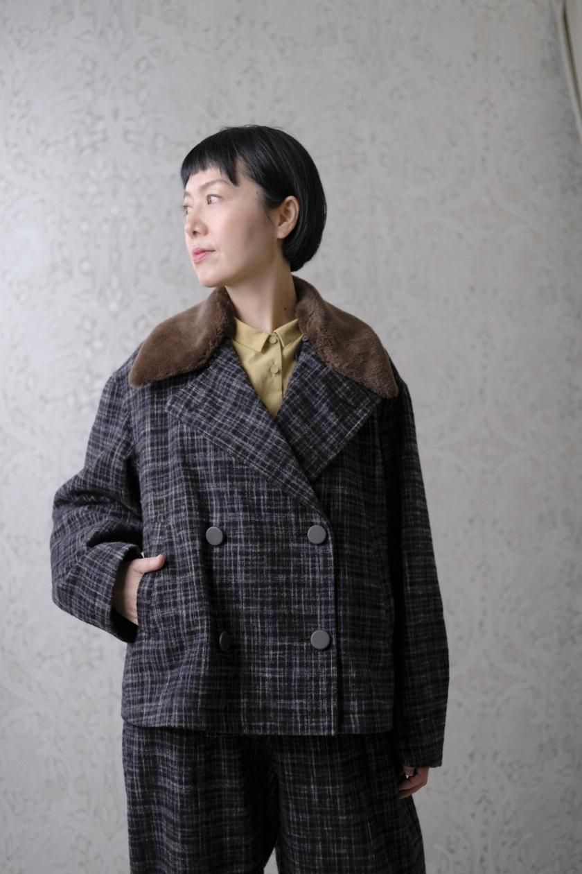 素材は、ウールと、肥料や薬を出来るだけ少なくし、育てる土地のことを鑑みて作付け量の制限まである、太く毛羽が立つ綿とを、無地と多色をランダムにつくれる特殊な技法でつくった糸とに染めて、チェックに織り、更に起毛をかけてぼかした生地を使用しています。