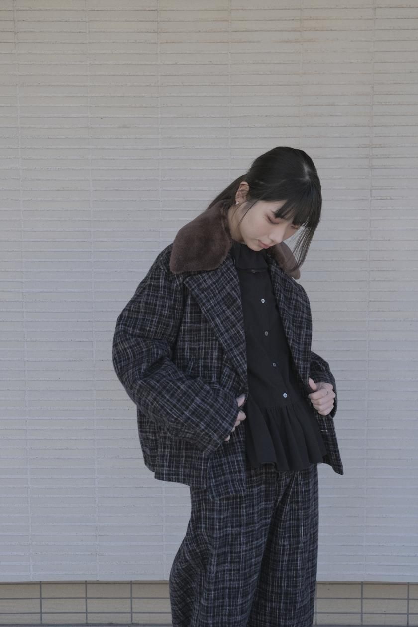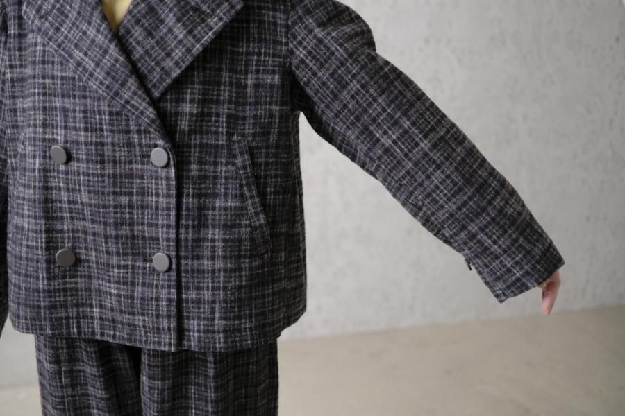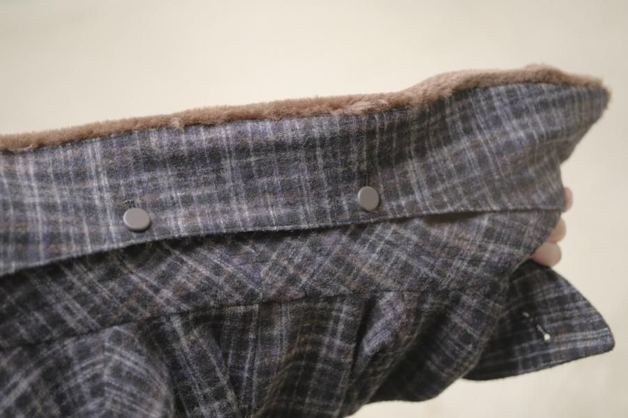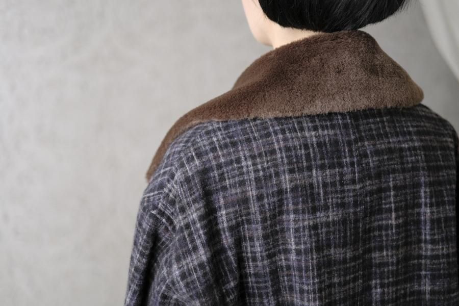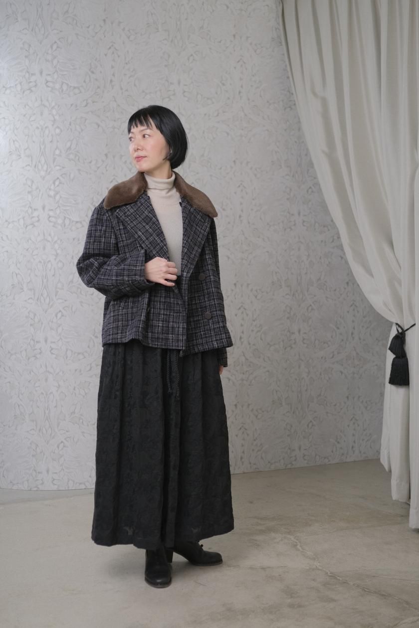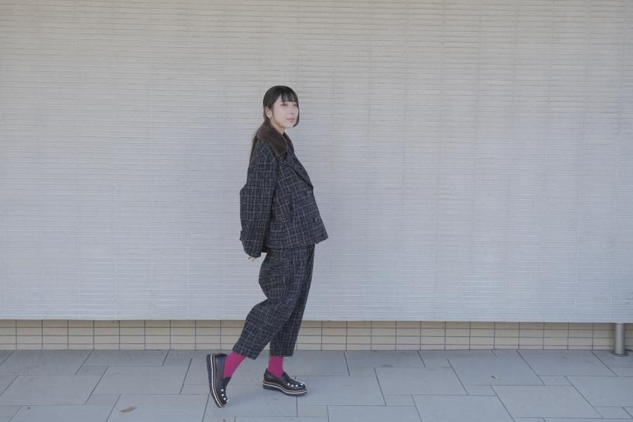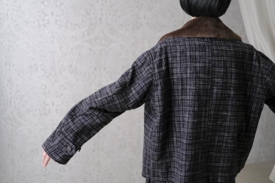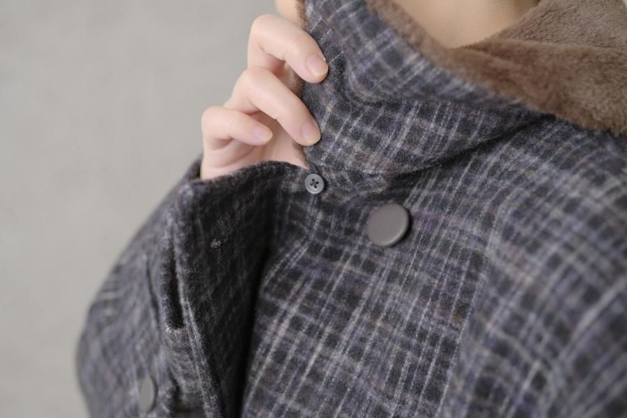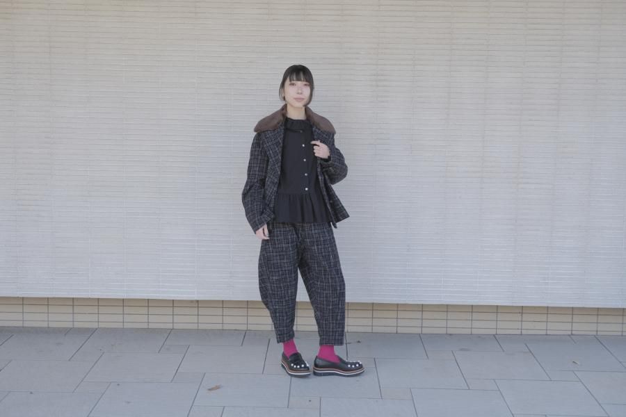 素材は、ウールと、肥料や薬を出来るだけ少なくし、育てる土地のことを鑑みて作付け量の制限まである、太く毛羽が立つ綿とを、無地と多色をランダムにつくれる特殊な技法でつくった糸とに染めて、チェックに織り、更に起毛をかけてぼかした生地を使用しています。