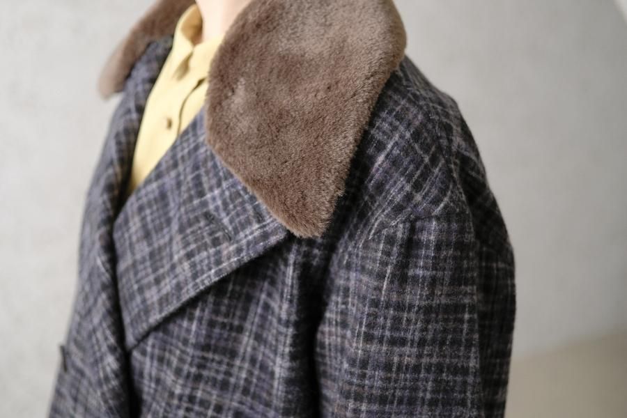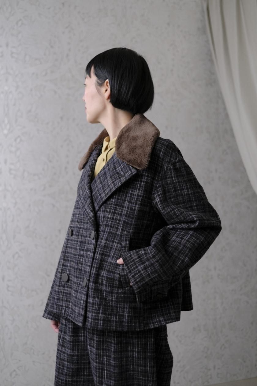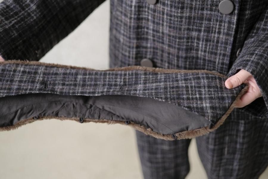 ベーシックなPコートのかたちに丈や幅のバランスに変化を加え、着脱のできるウールアルパカの衿やタブ使いなどによって複数の顔を持たせたコートです。