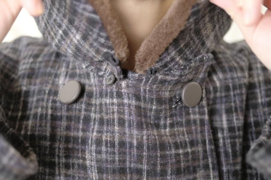 着脱のできる衿はフェイクファー、フェイクレザーのボタンは一部に植物由来の原料を使用した素材で出来ています。