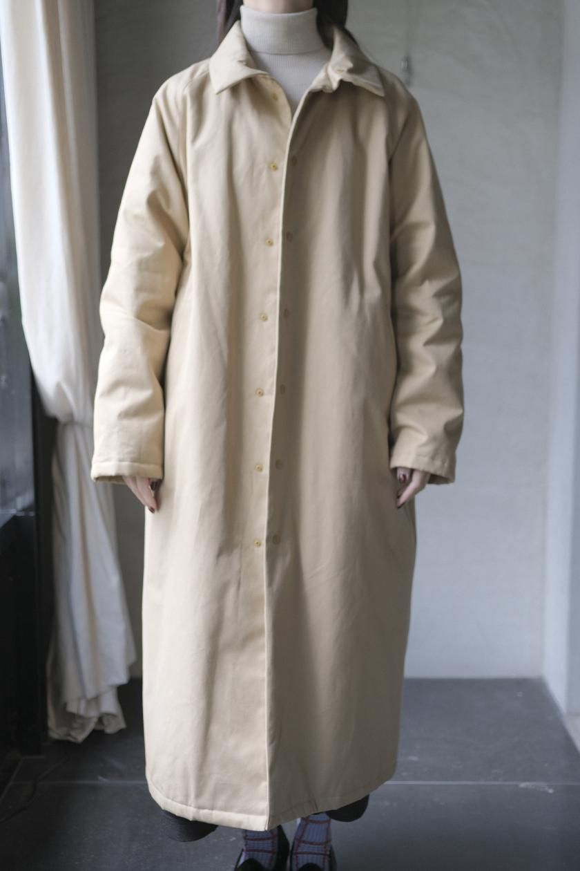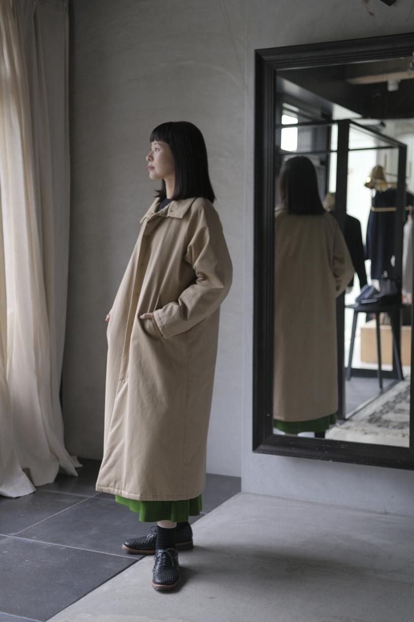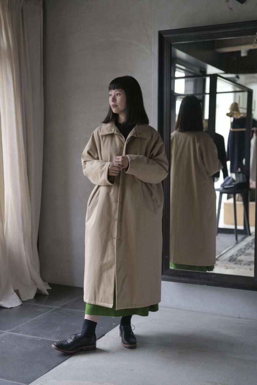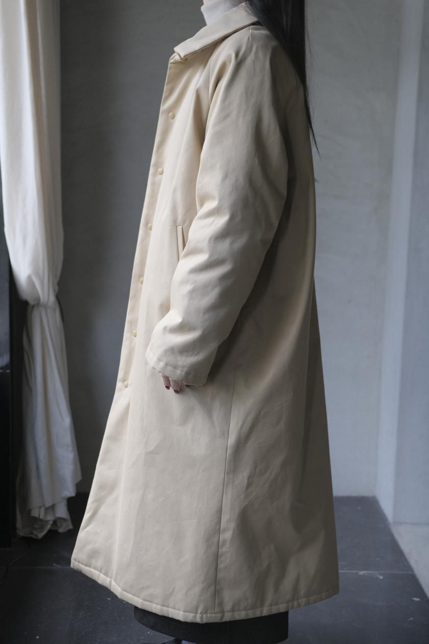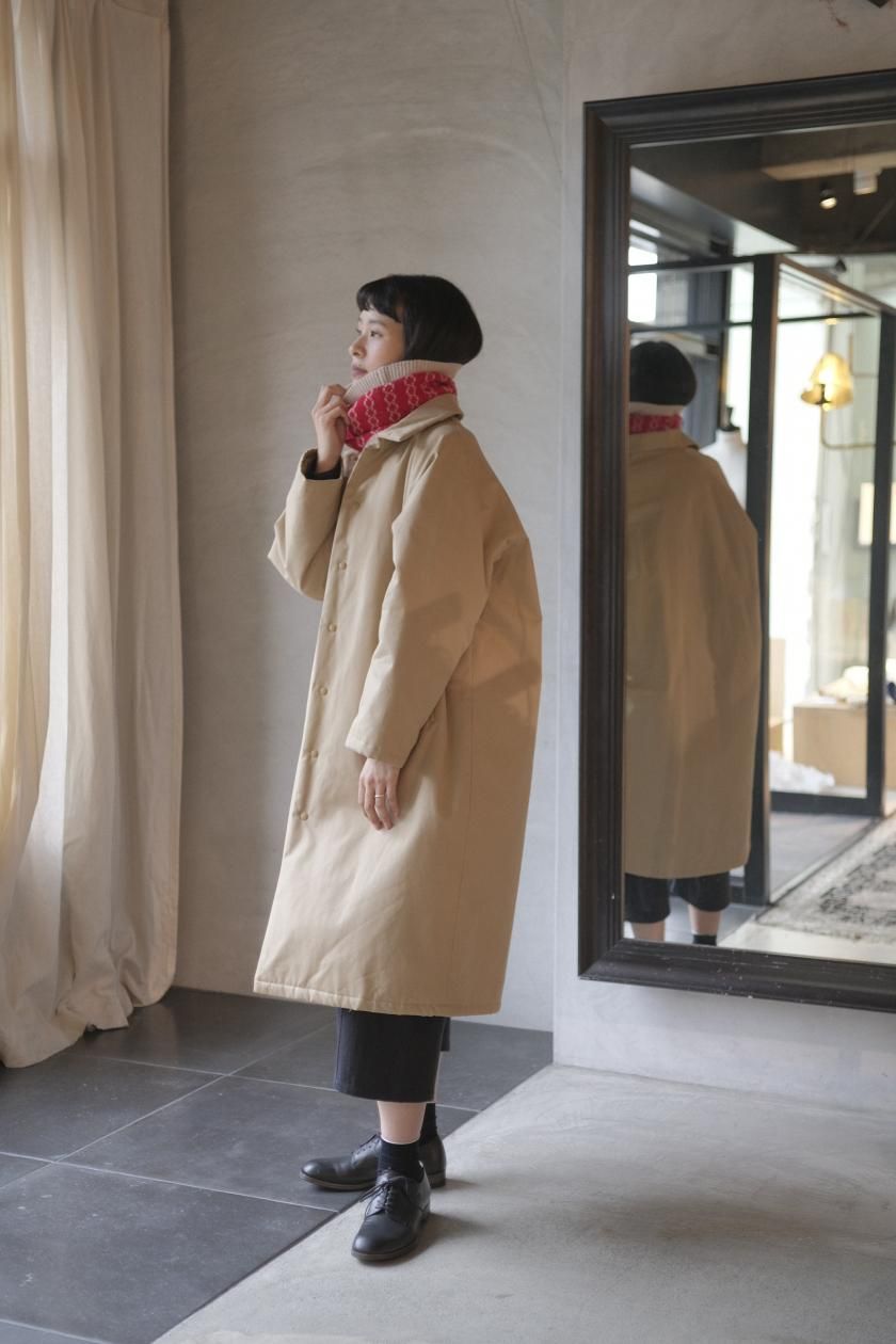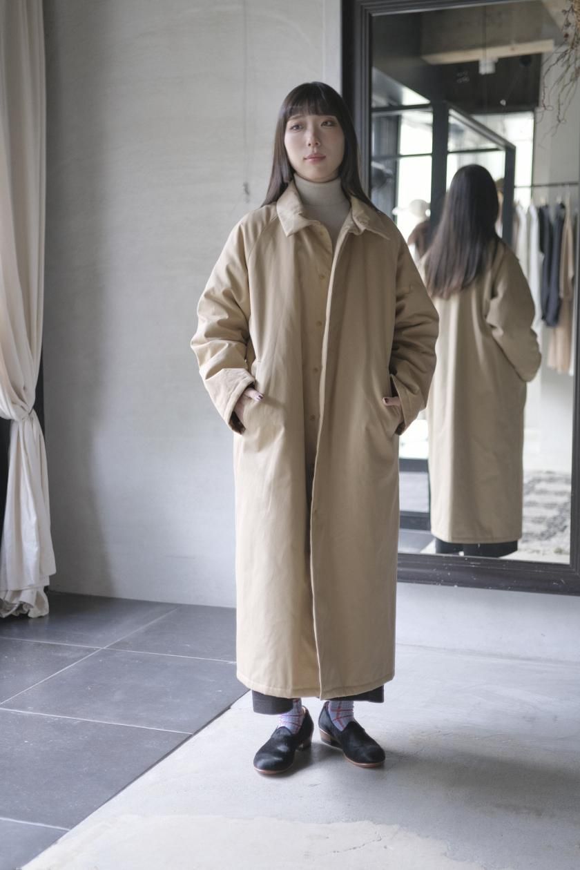 ・ゆったりしたサイズ感のロング丈の中綿コート。身幅や袖巾をゆったりと広く取っているため、厚手のセーター、袖巾があるトップスをインナーとして着る際にも、もたつかないサイズ感です