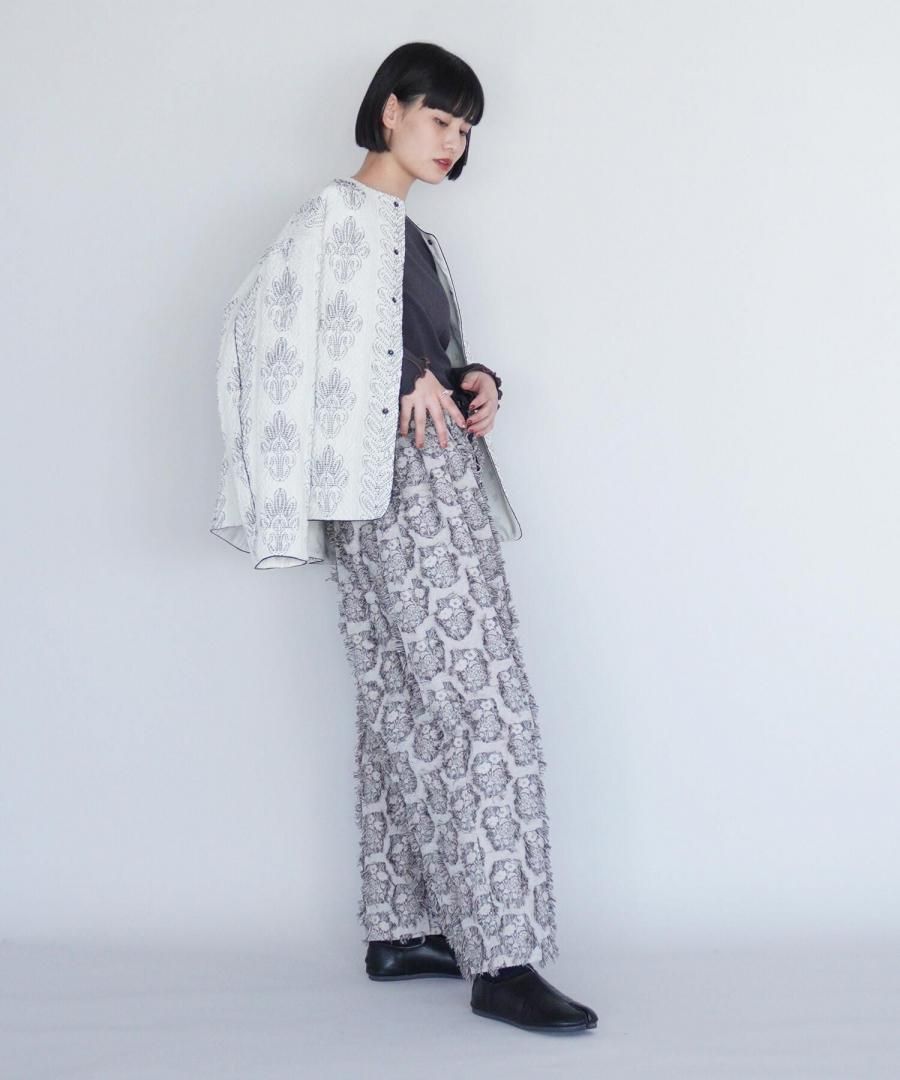 ベースは綿で、刺繍柄の部分は太番手のウールの糸を使用しています。