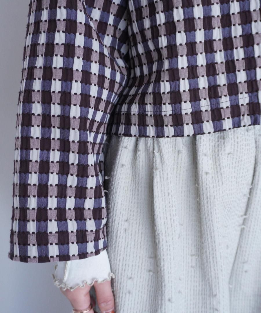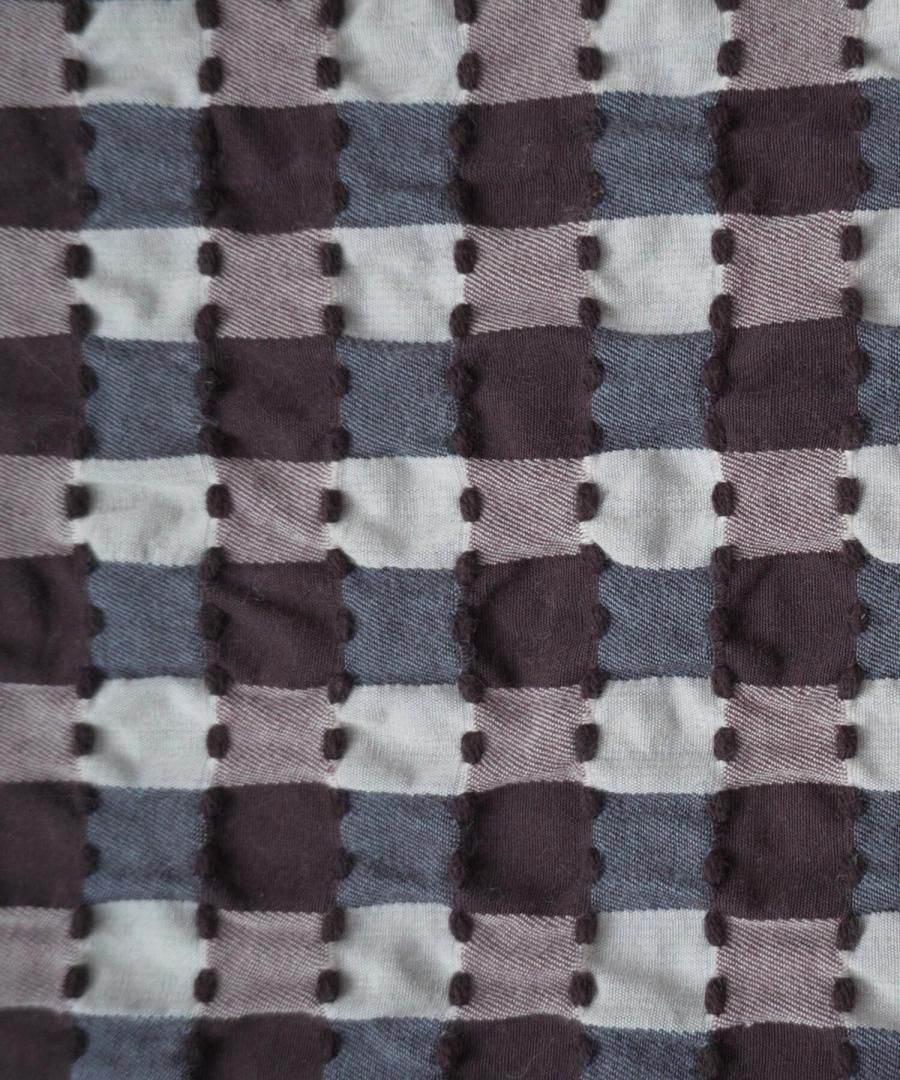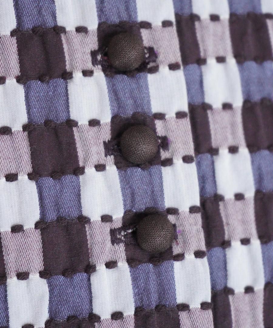 ブロックチェックに刺し子を施したようなドビー織りの生地。
