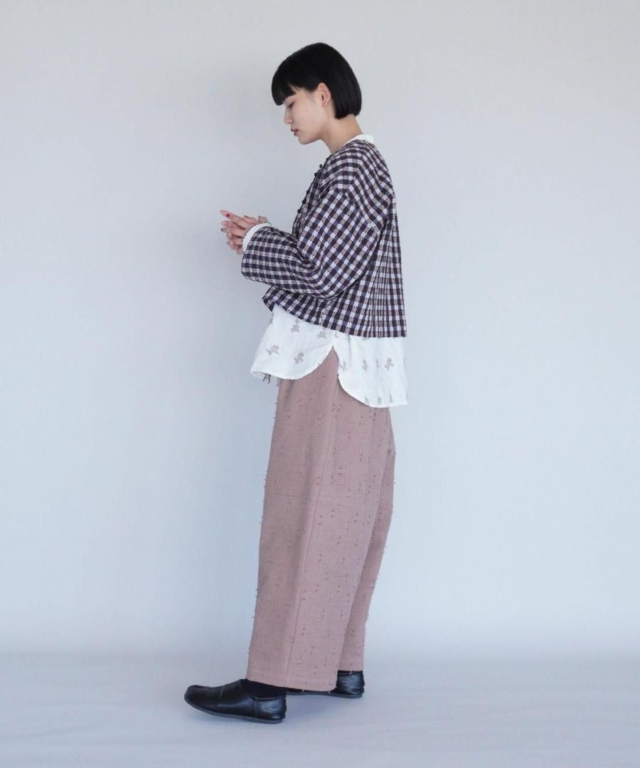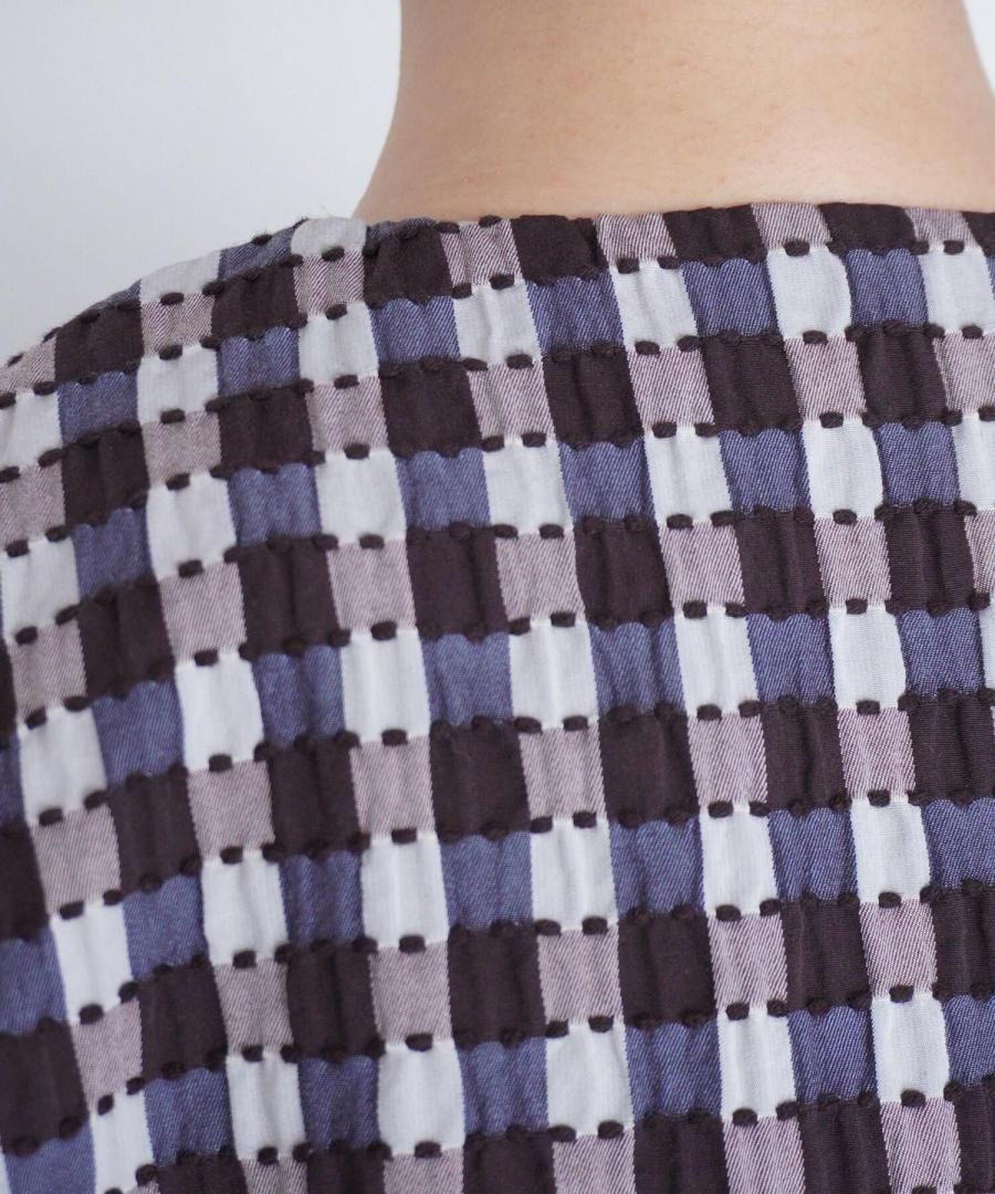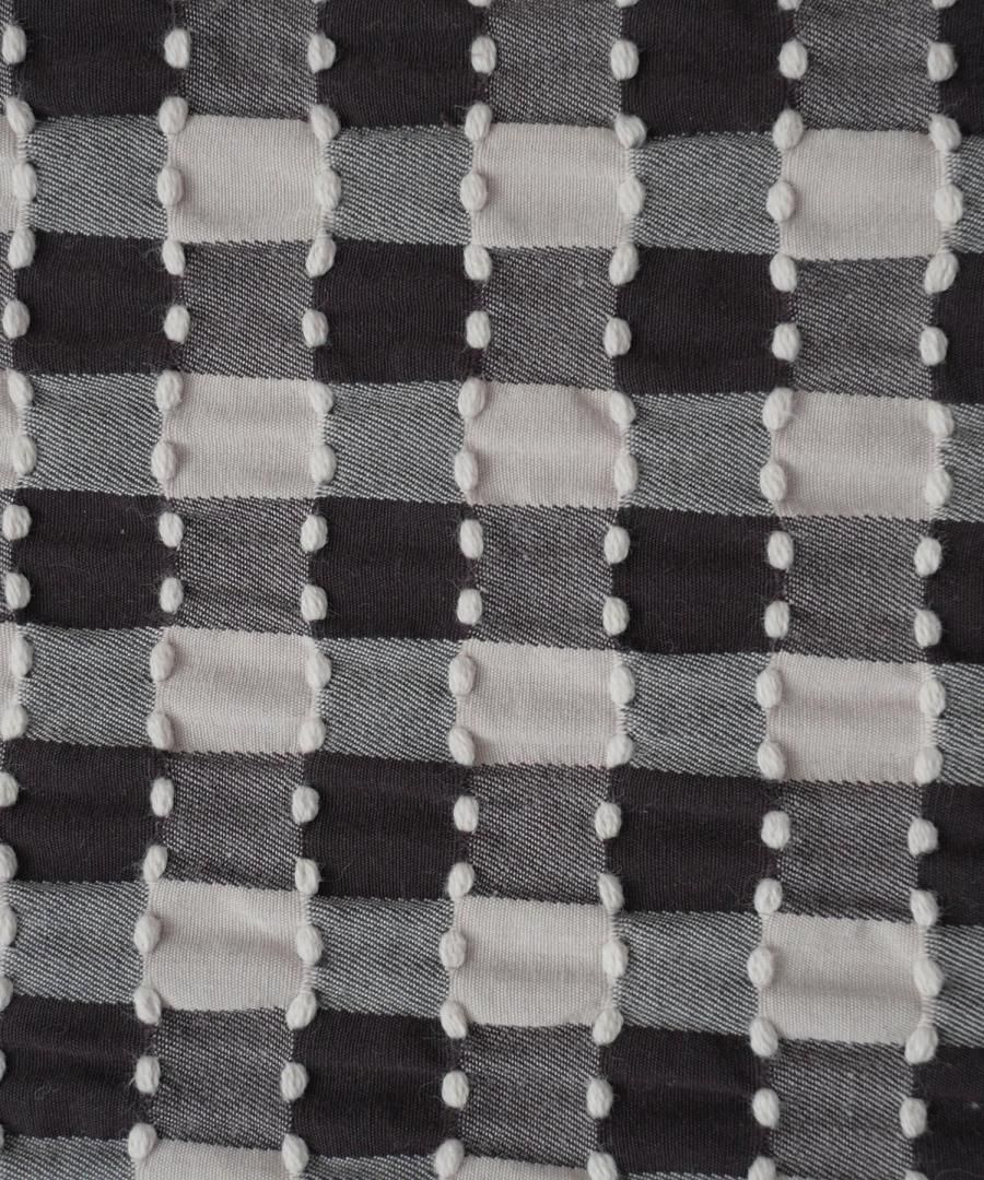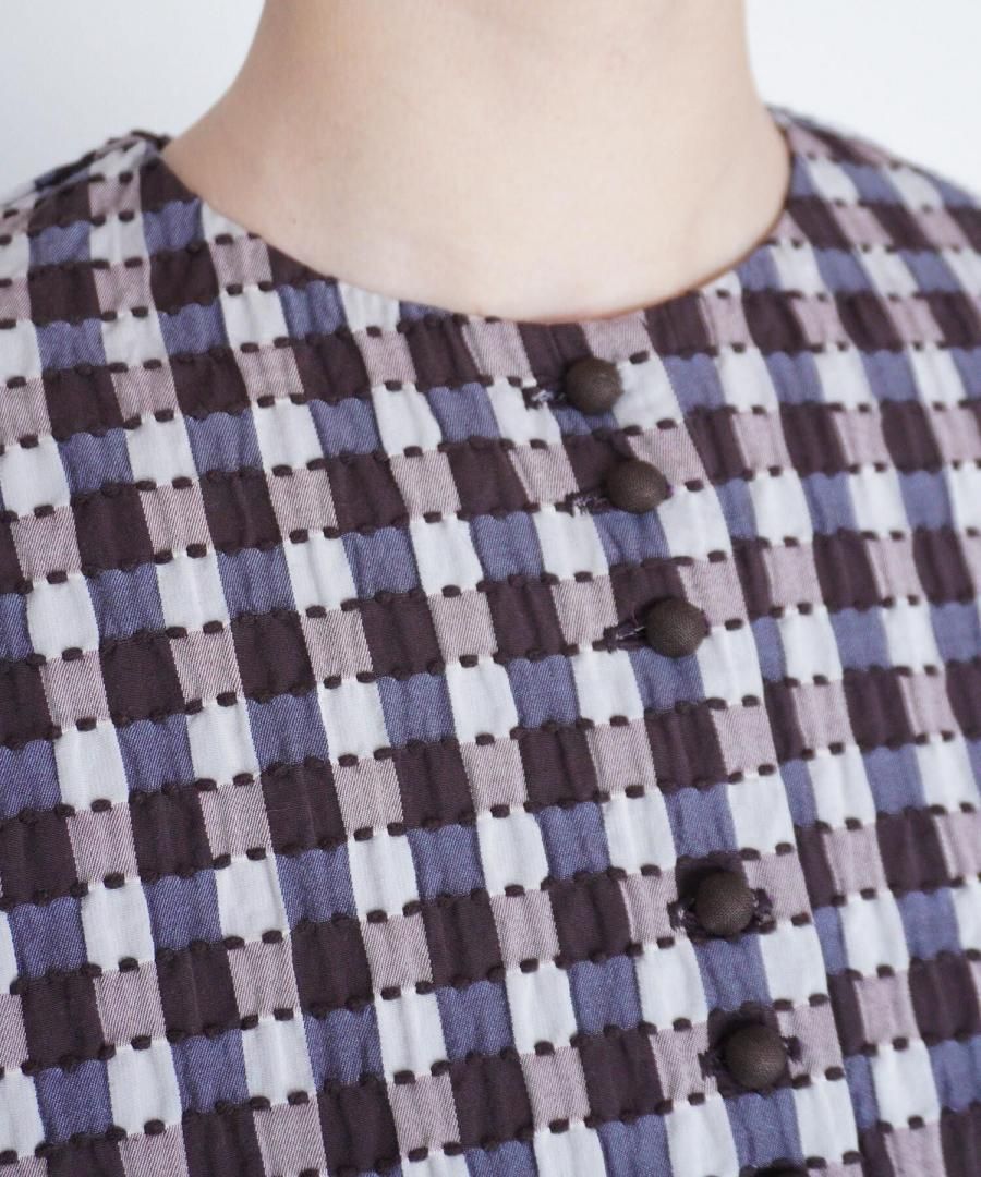 ブロックチェックに刺し子を施したようなドビー織りの生地。