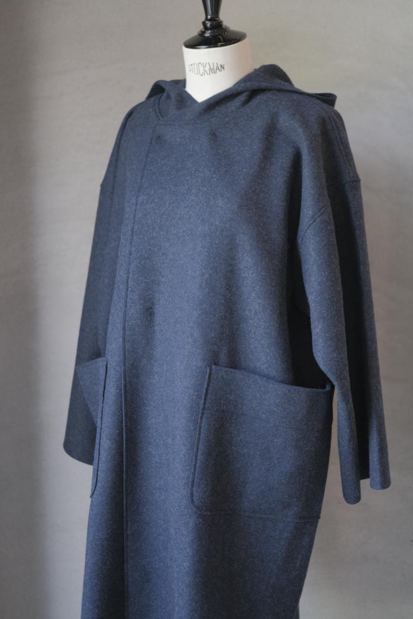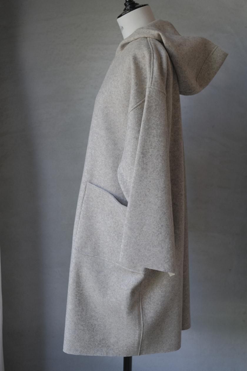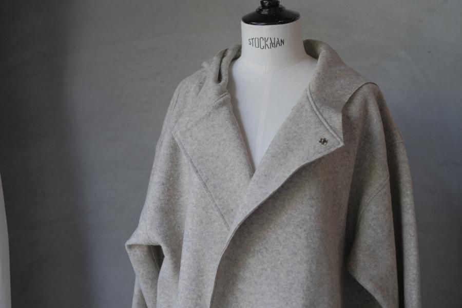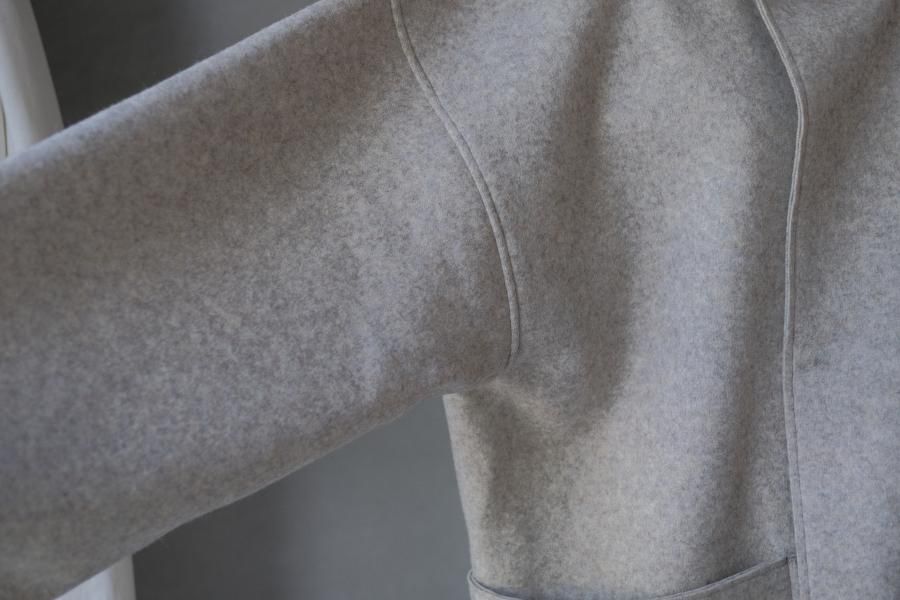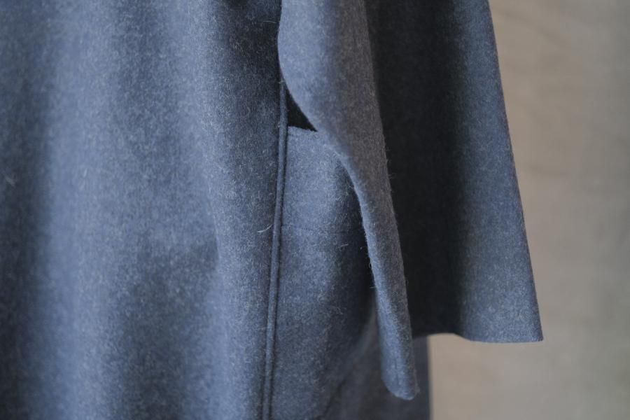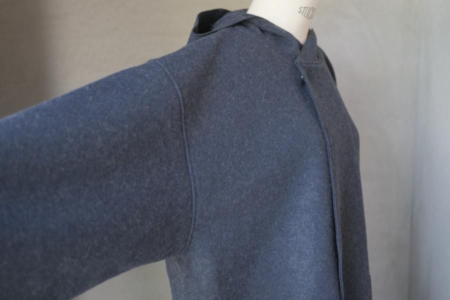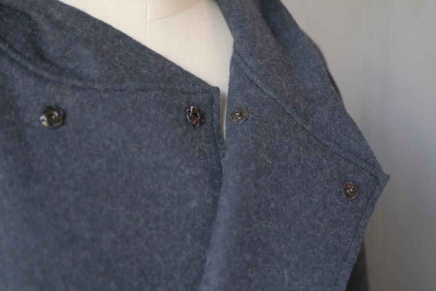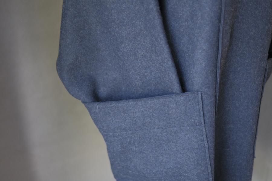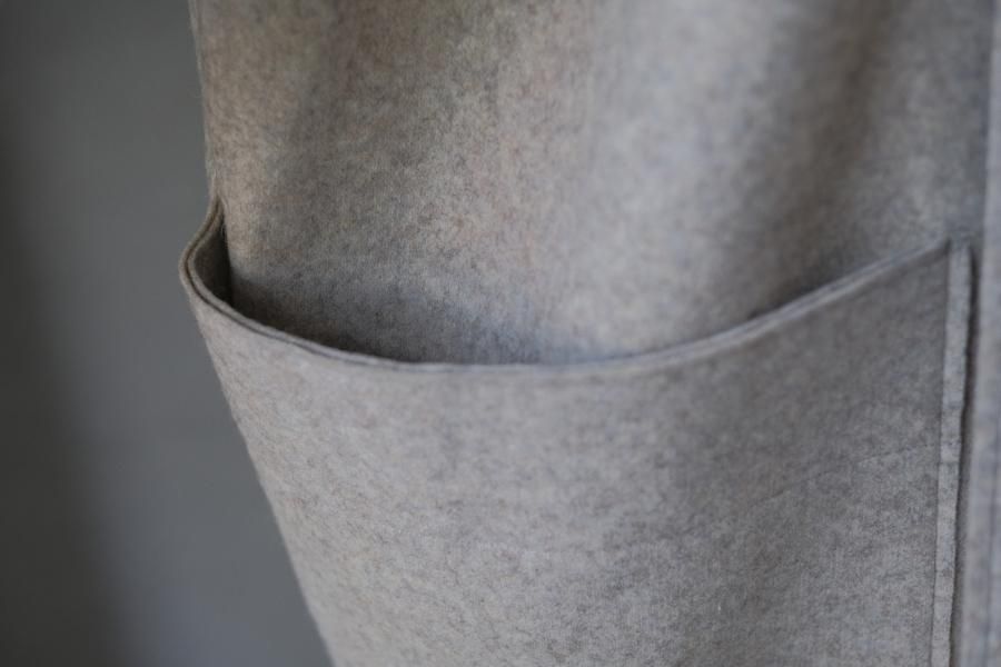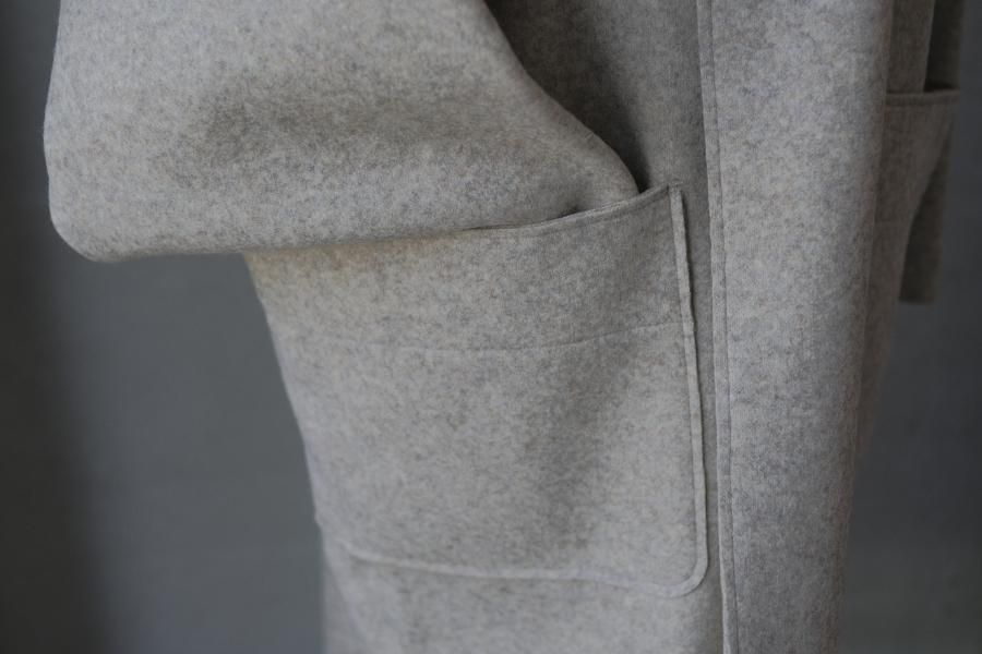 デザインは、生地の特性を活かした全て断ち切りの仕様となっています。平面的でワイドなシルエットが特徴で、厚手のセーターや着物とも相性が良く、ゆとりのある着こなしを楽しむことができます。また、重ね着をすることで真冬まで対応が可能です。両サイドには大きなポケットも付いています。