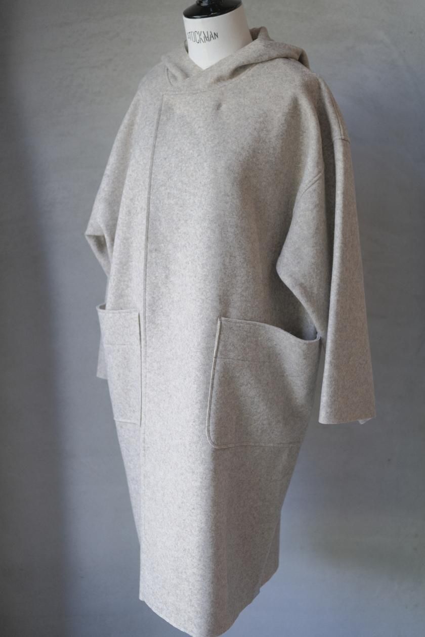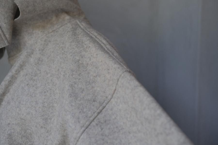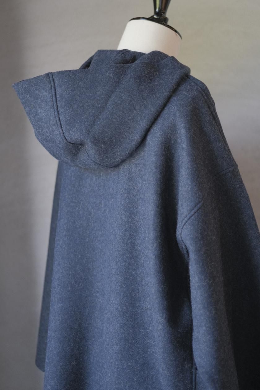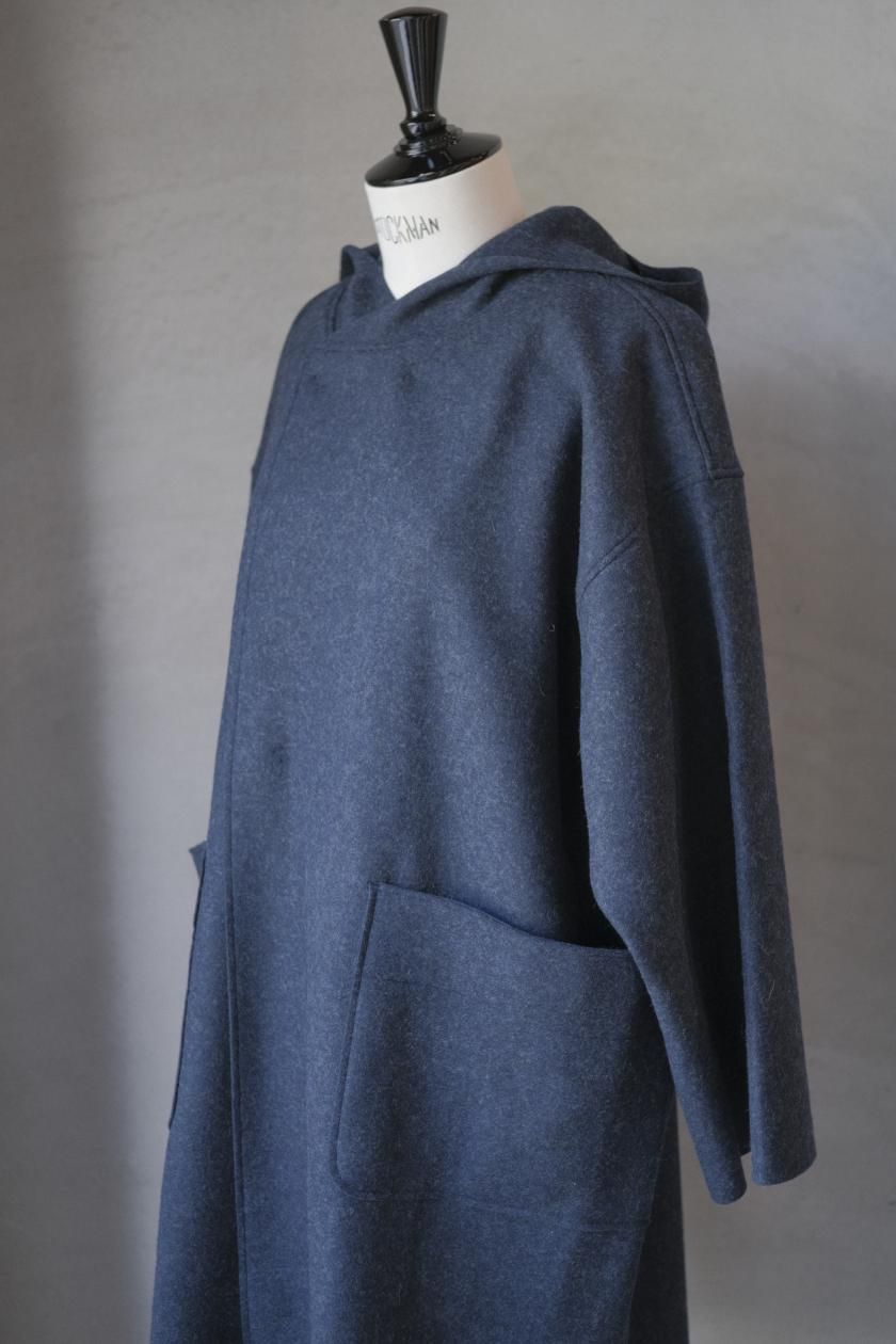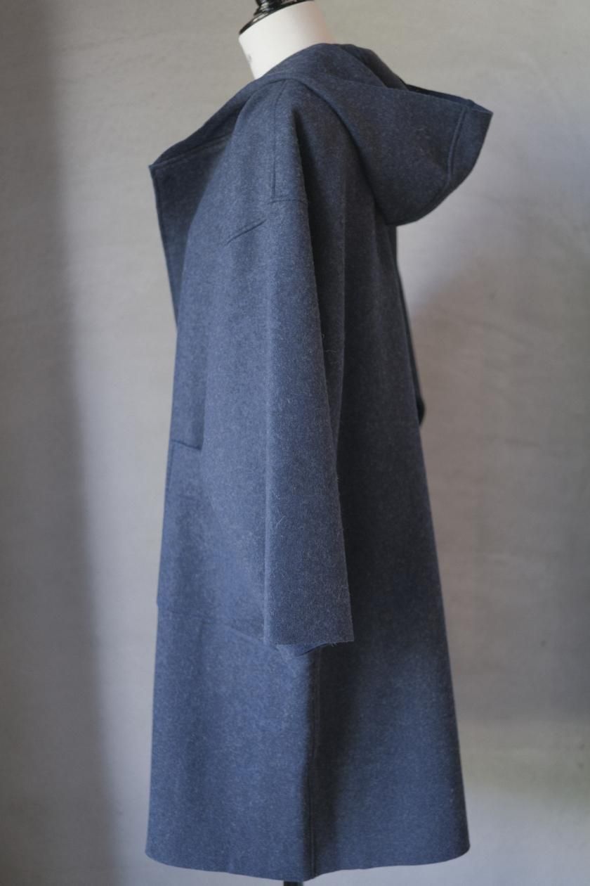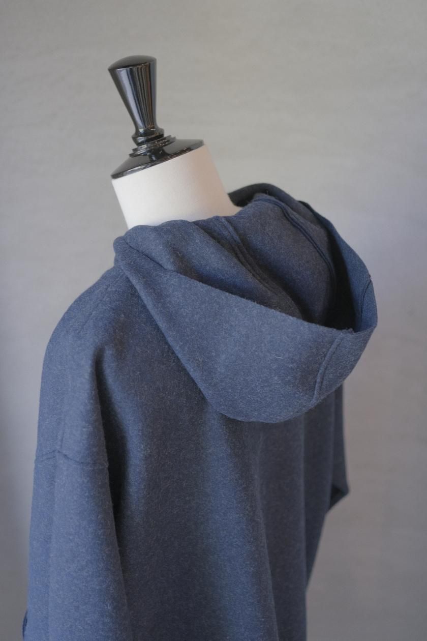デザインは、生地の特性を活かした全て断ち切りの仕様となっています。平面的でワイドなシルエットが特徴で、厚手のセーターや着物とも相性が良く、ゆとりのある着こなしを楽しむことができます。また、重ね着をすることで真冬まで対応が可能です。両サイドには大きなポケットも付いています。