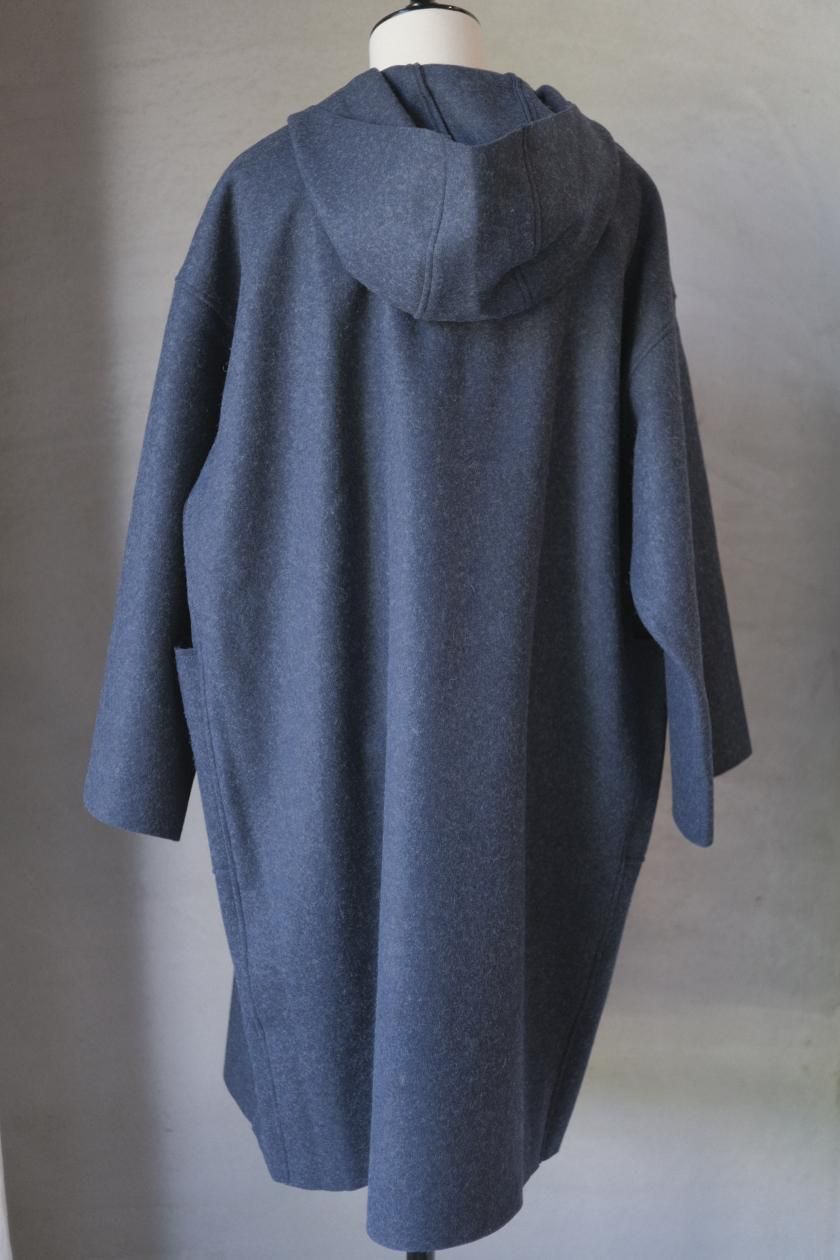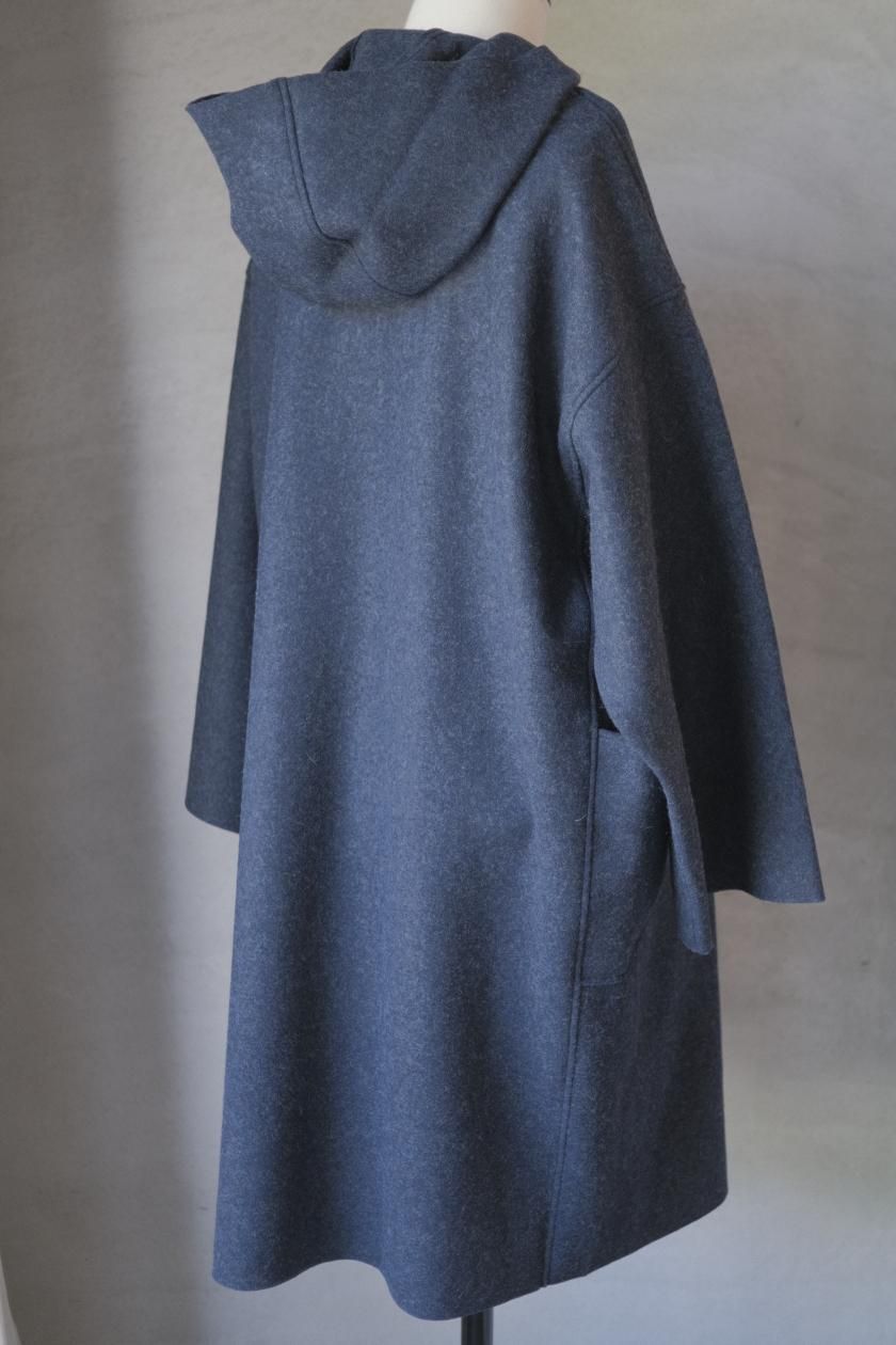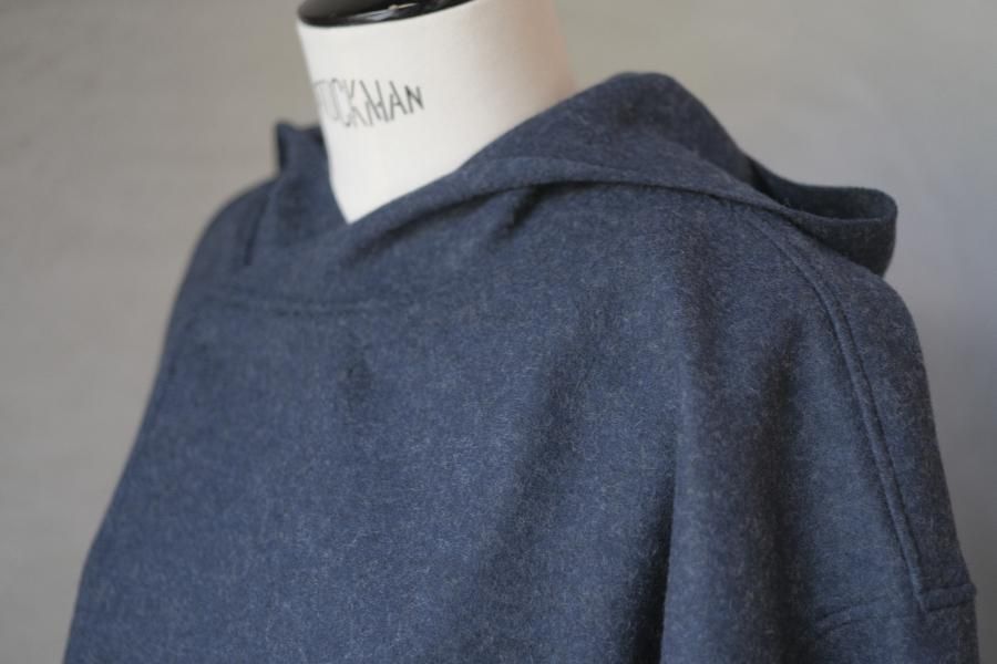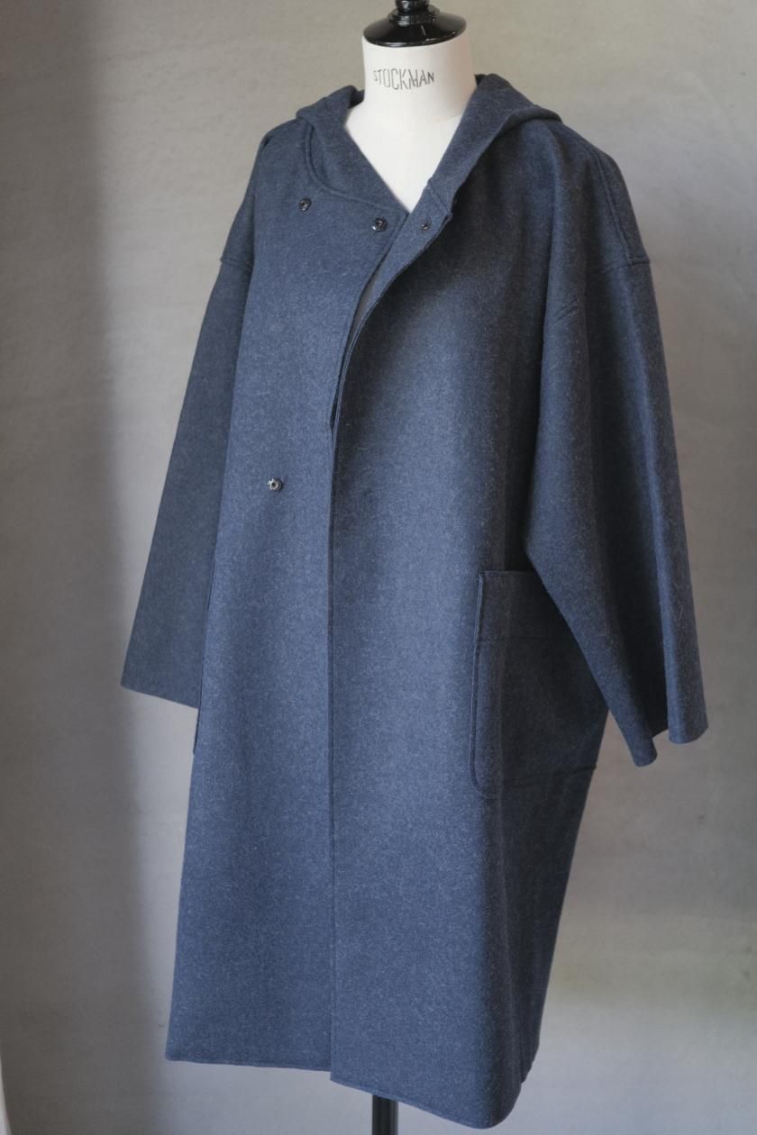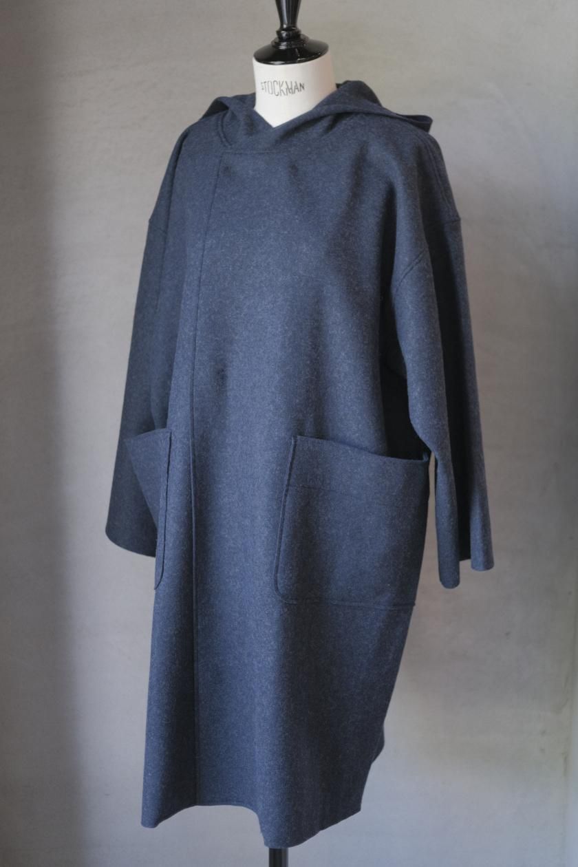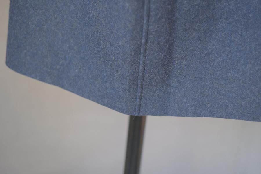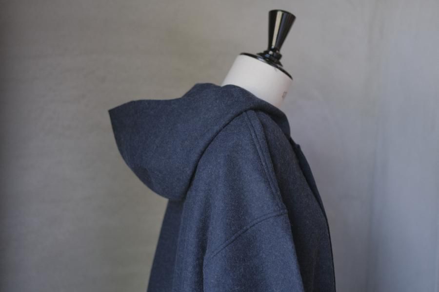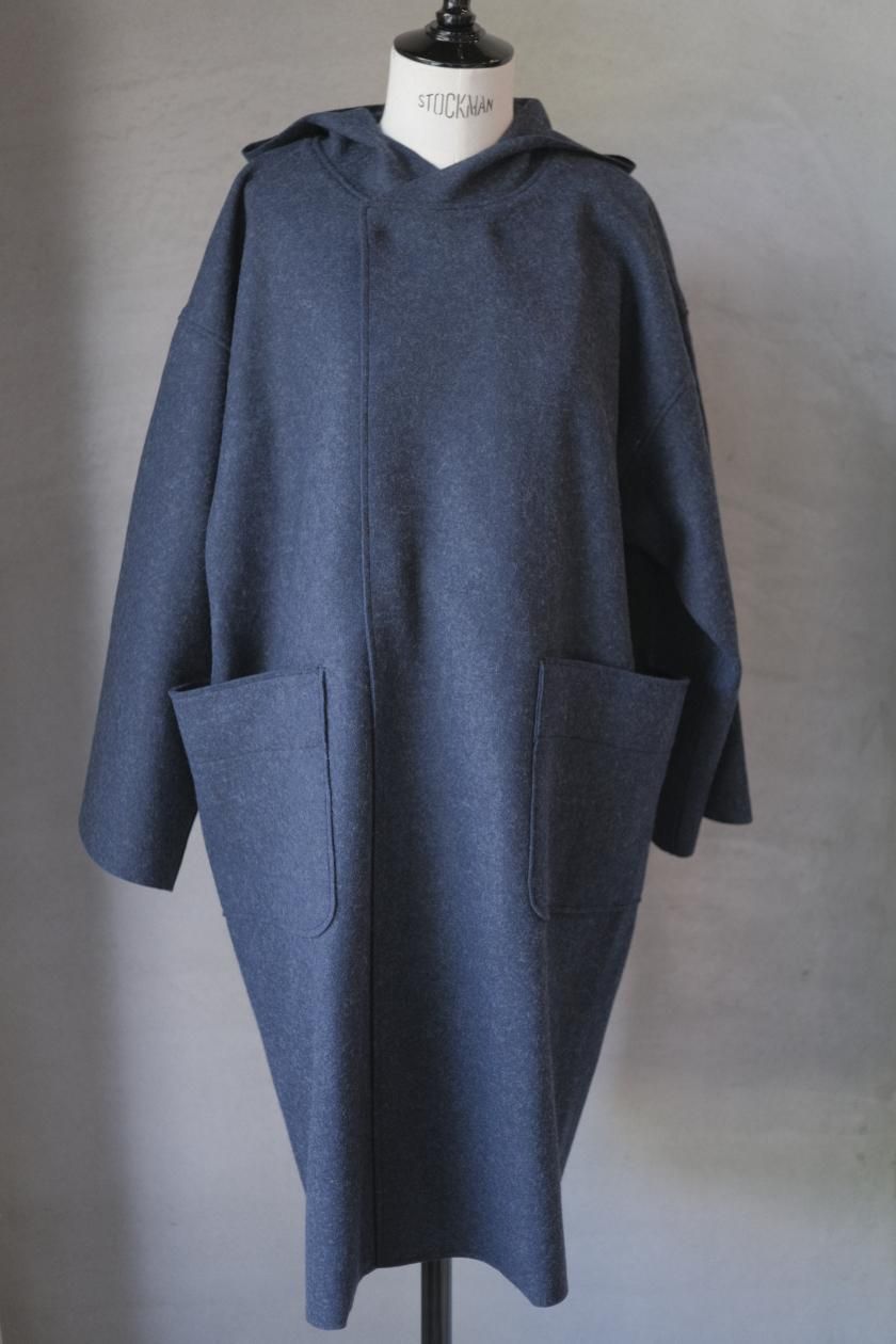 デザインは、生地の特性を活かした全て断ち切りの仕様となっています。平面的でワイドなシルエットが特徴で、厚手のセーターや着物とも相性が良く、ゆとりのある着こなしを楽しむことができます。また、重ね着をすることで真冬まで対応が可能です。両サイドには大きなポケットも付いています。