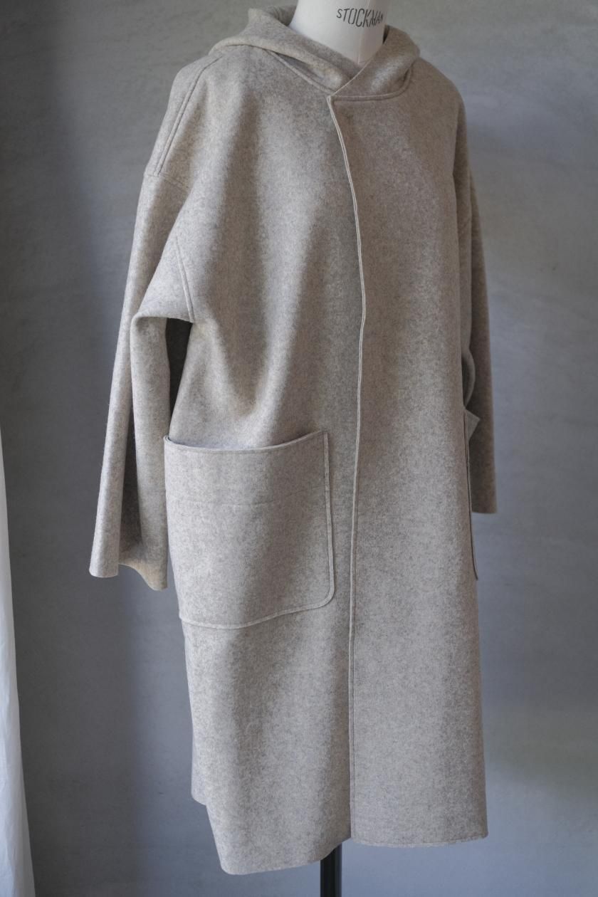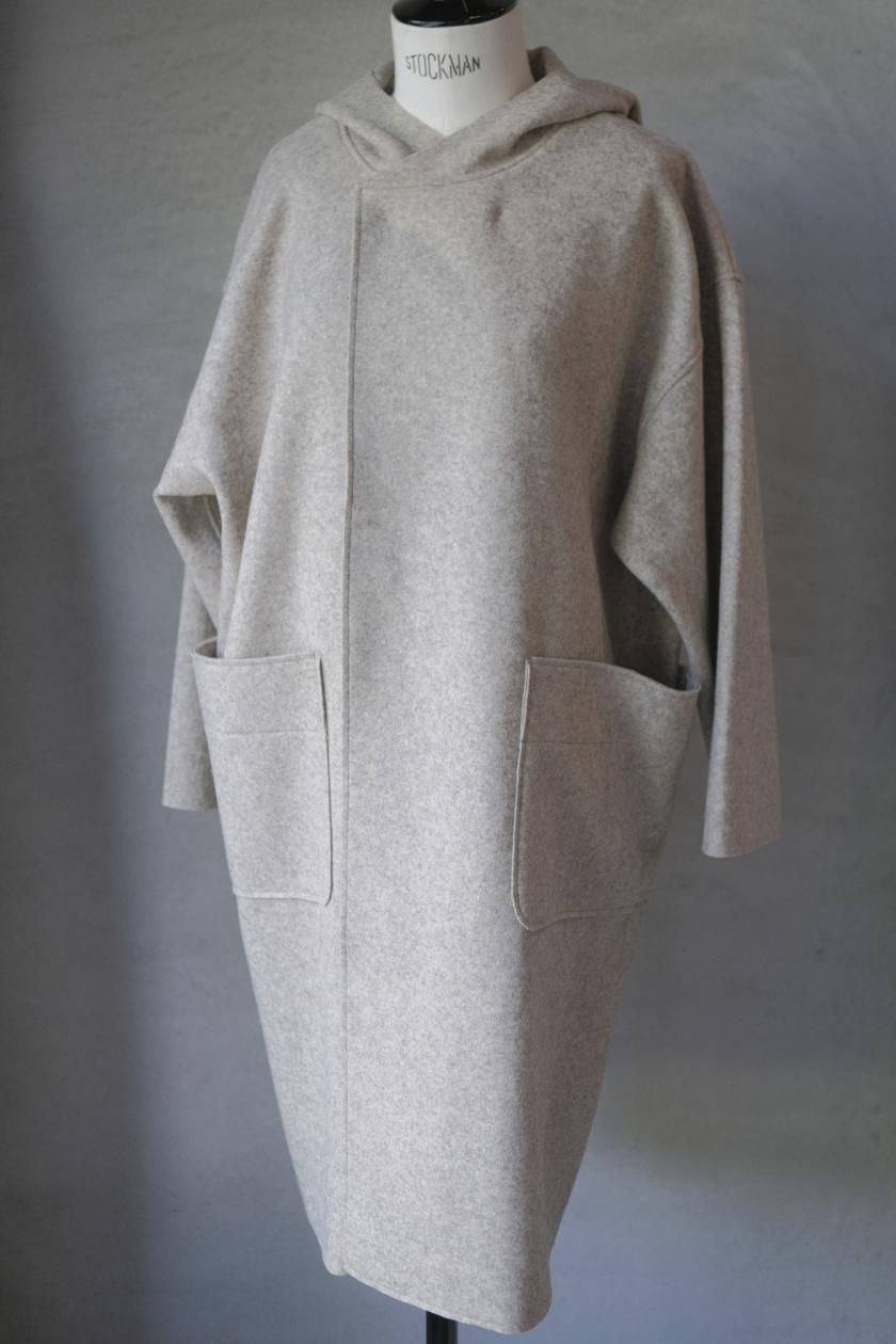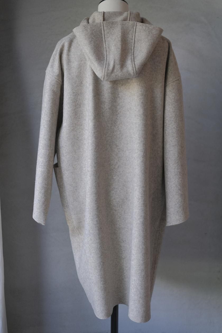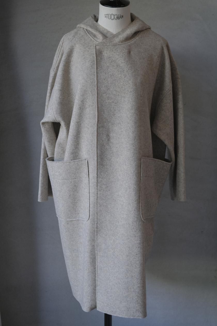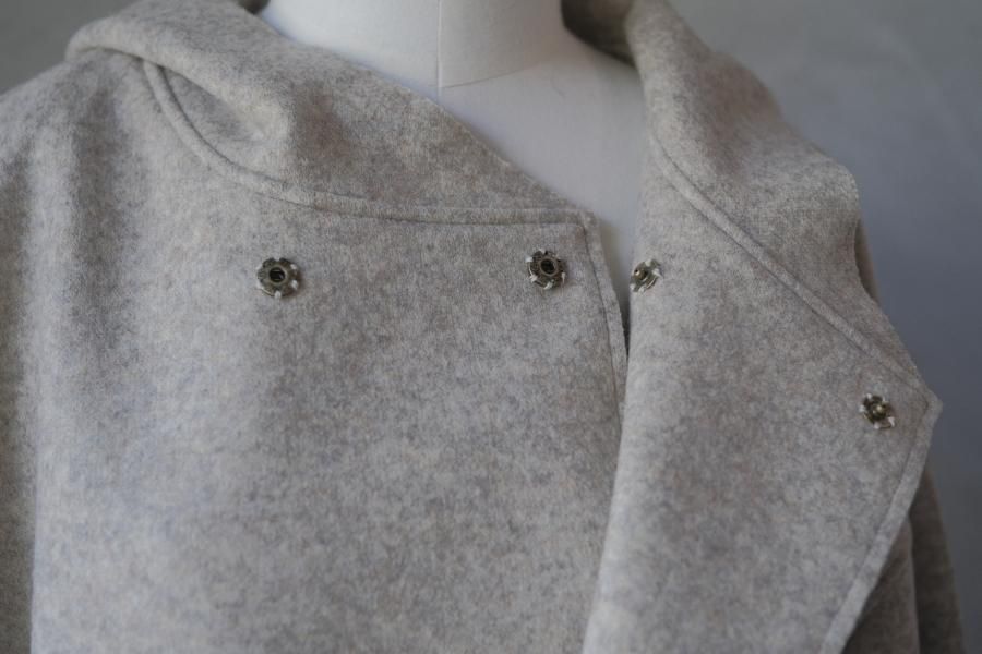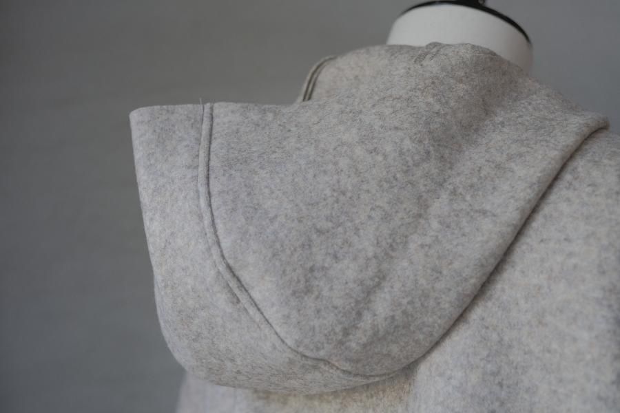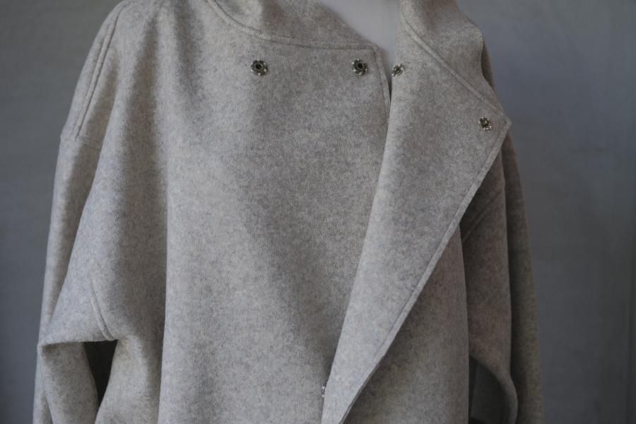 デザインは、生地の特性を活かした全て断ち切りの仕様となっています。平面的でワイドなシルエットが特徴で、厚手のセーターや着物とも相性が良く、ゆとりのある着こなしを楽しむことができます。また、重ね着をすることで真冬まで対応が可能です。両サイドには大きなポケットも付いています。