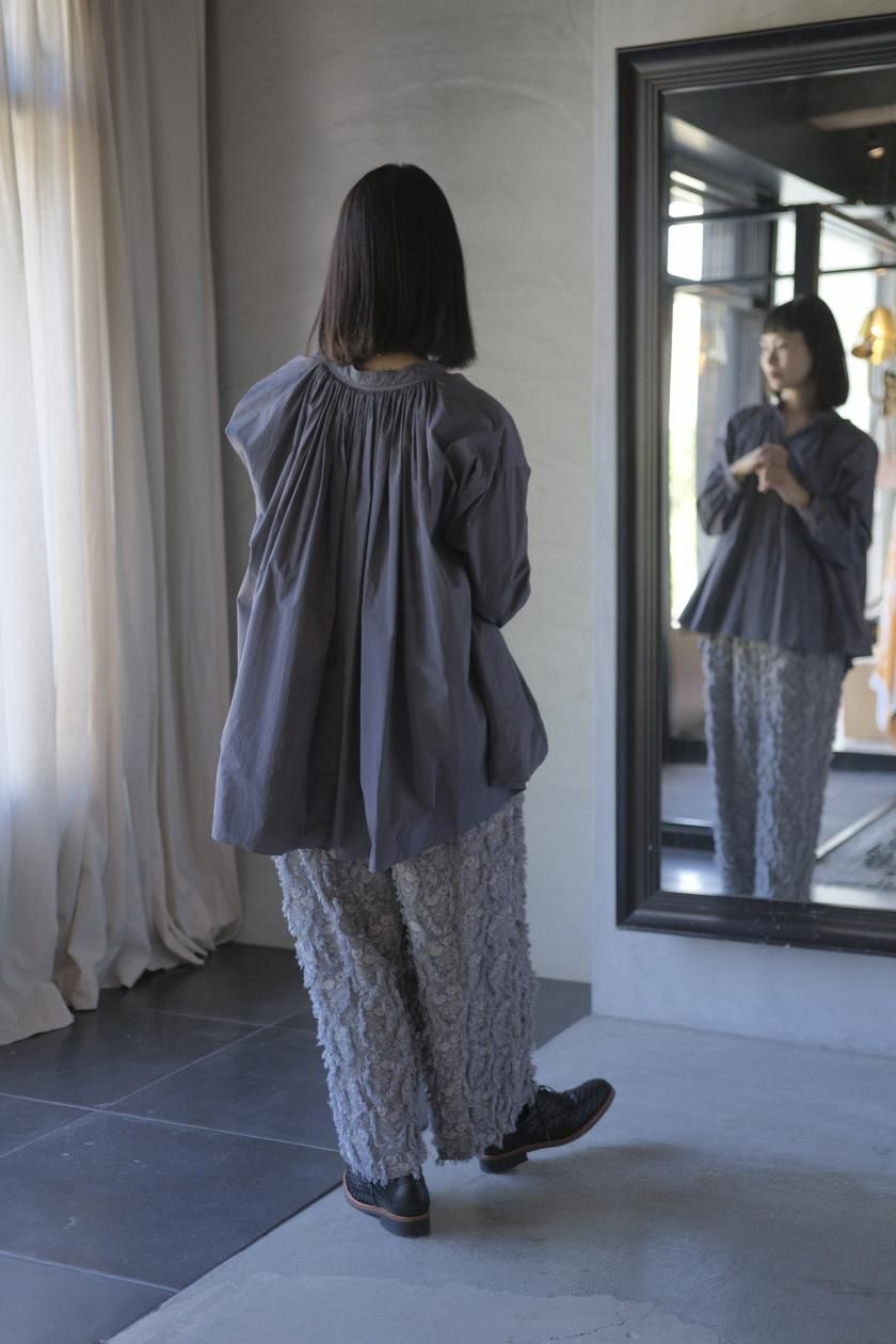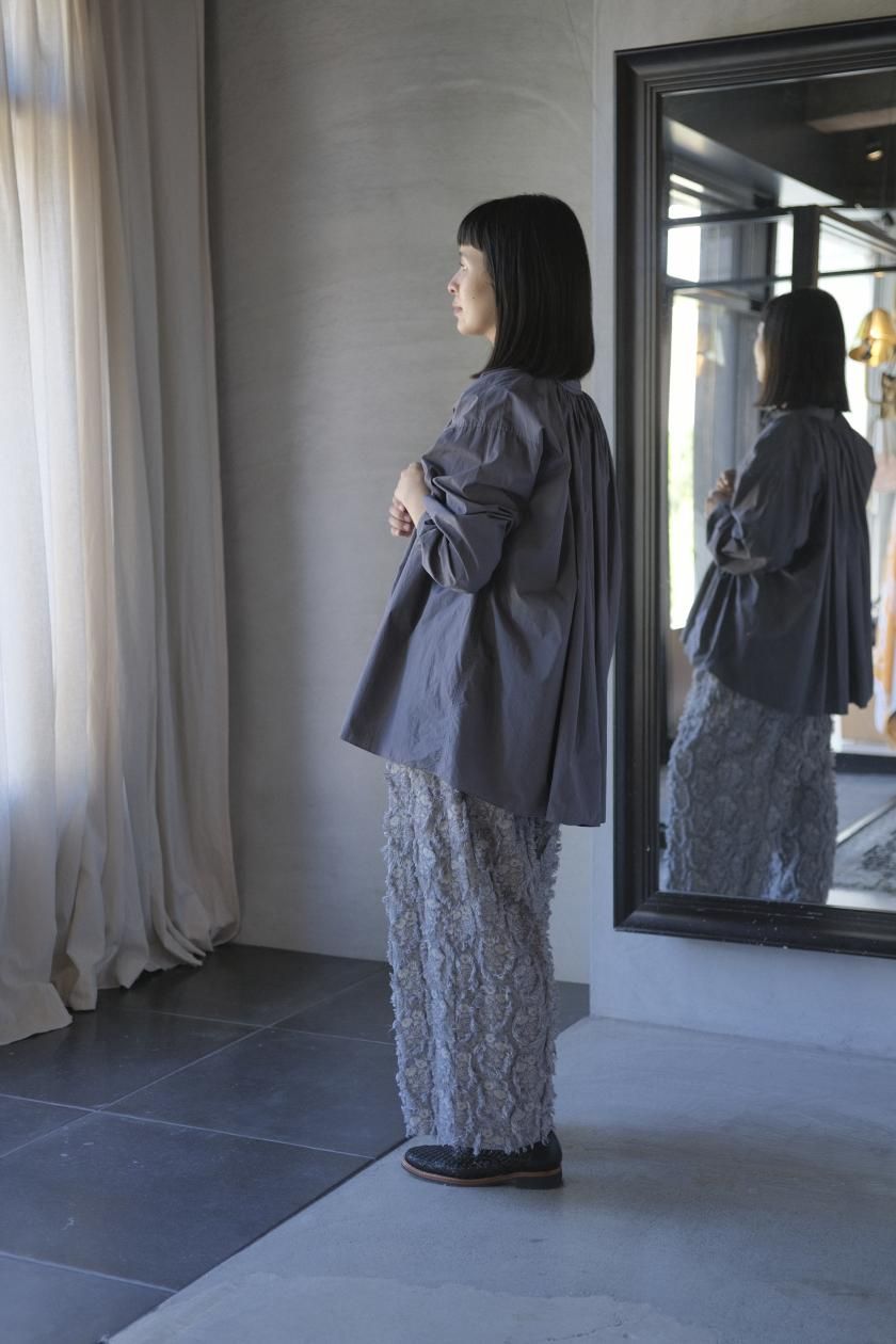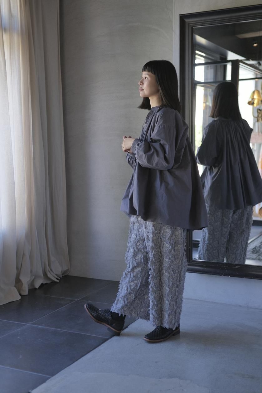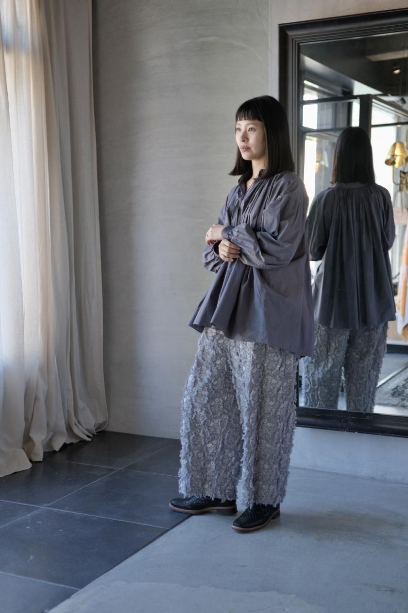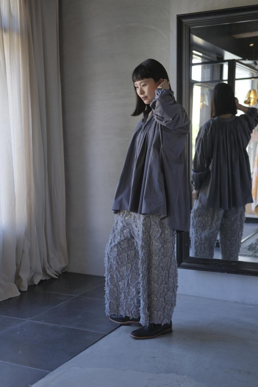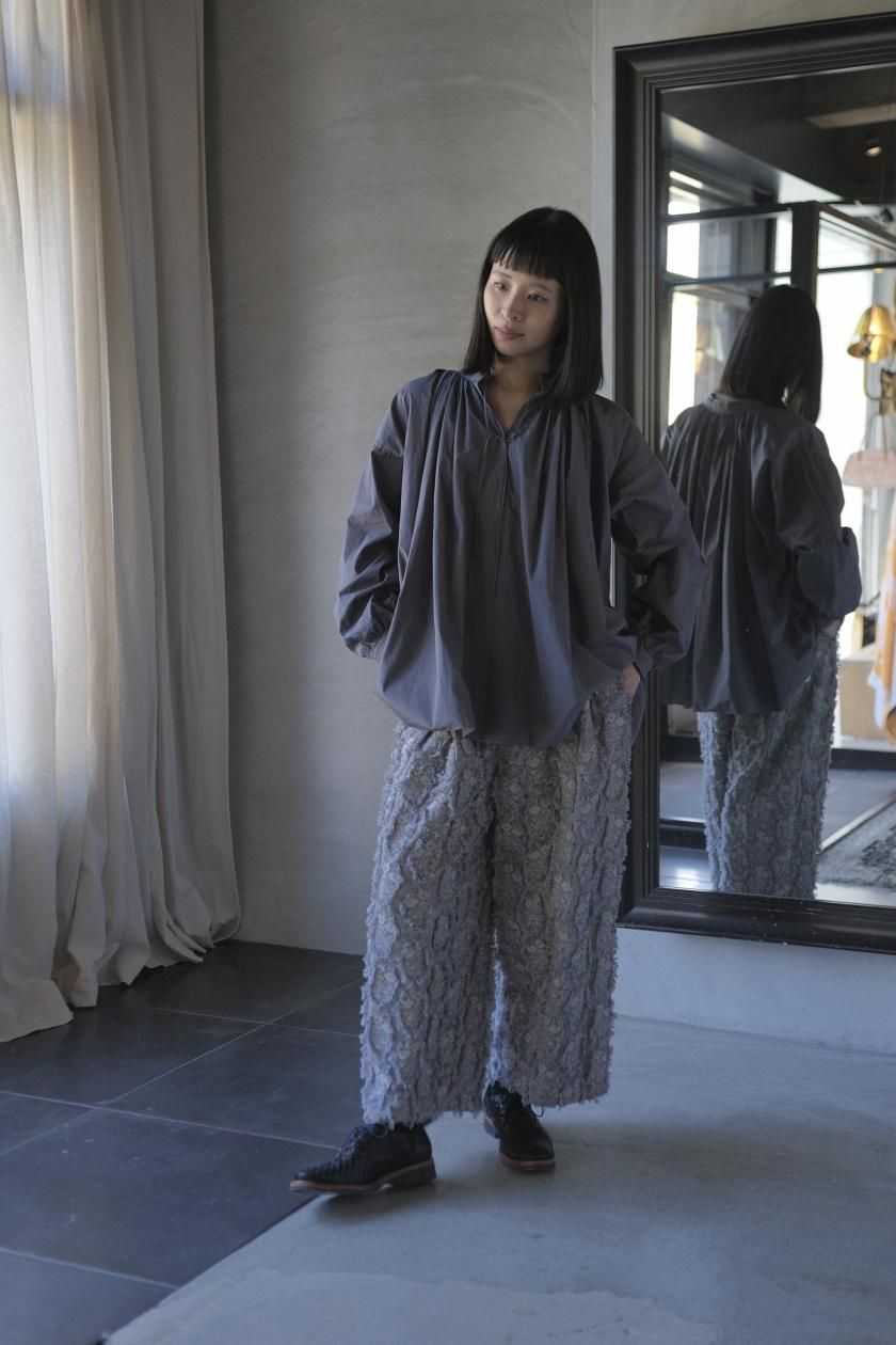 パンツは存在感のあるワイドなシルエットのゴムギャザーパンツ。