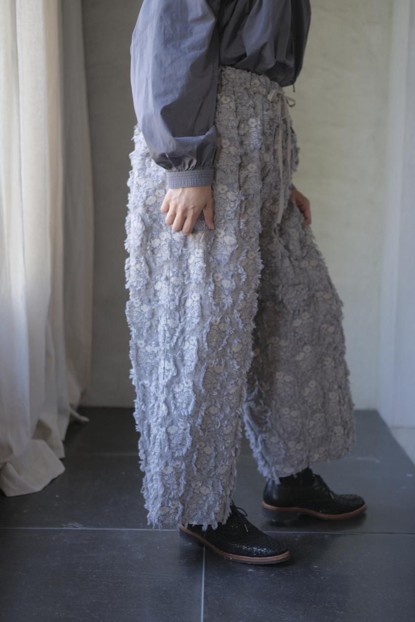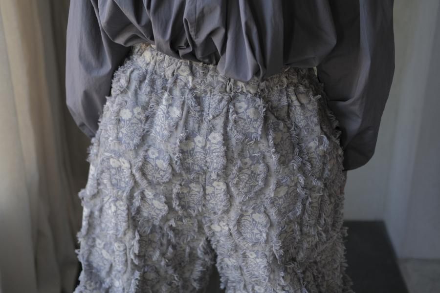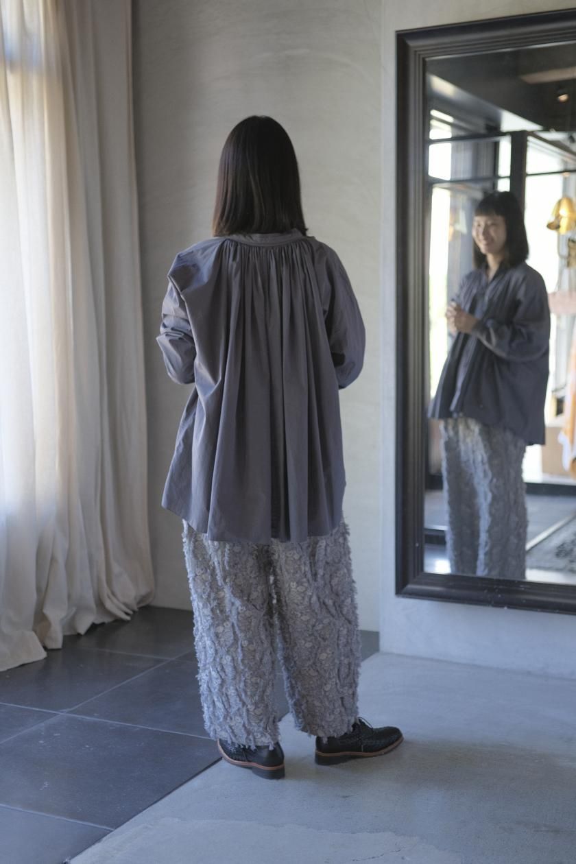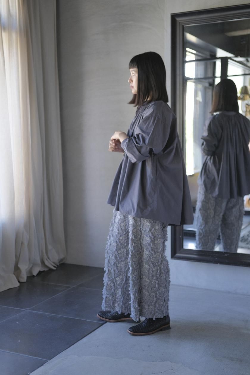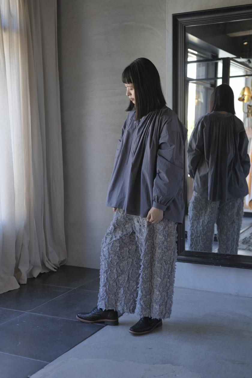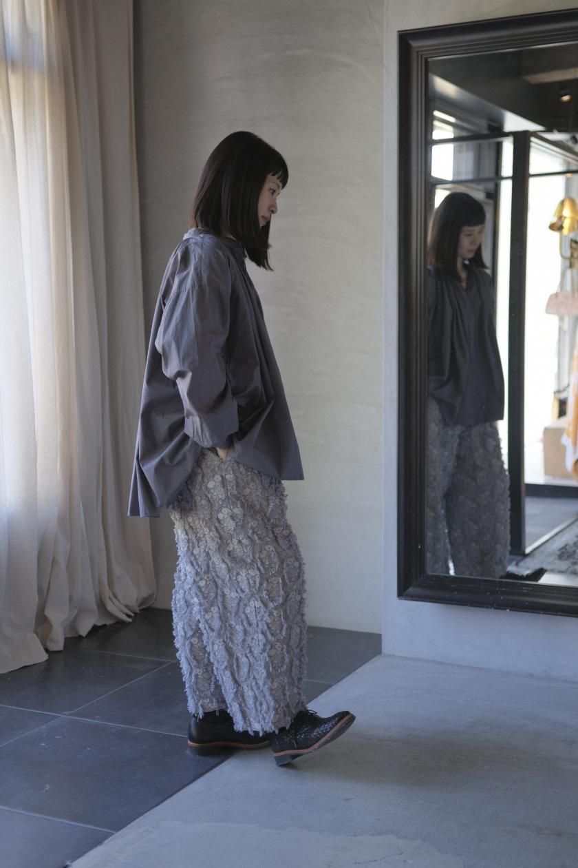 パンツは存在感のあるワイドなシルエットのゴムギャザーパンツ。
