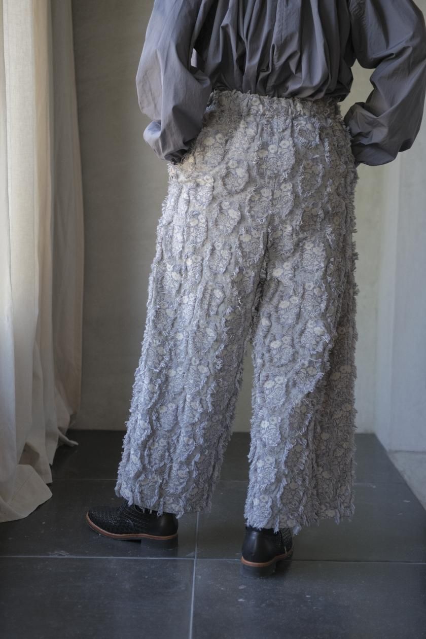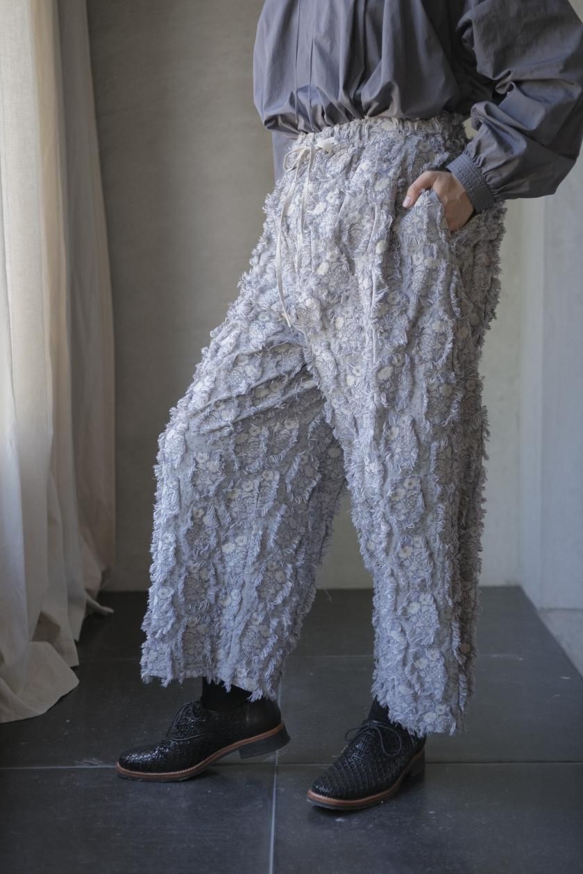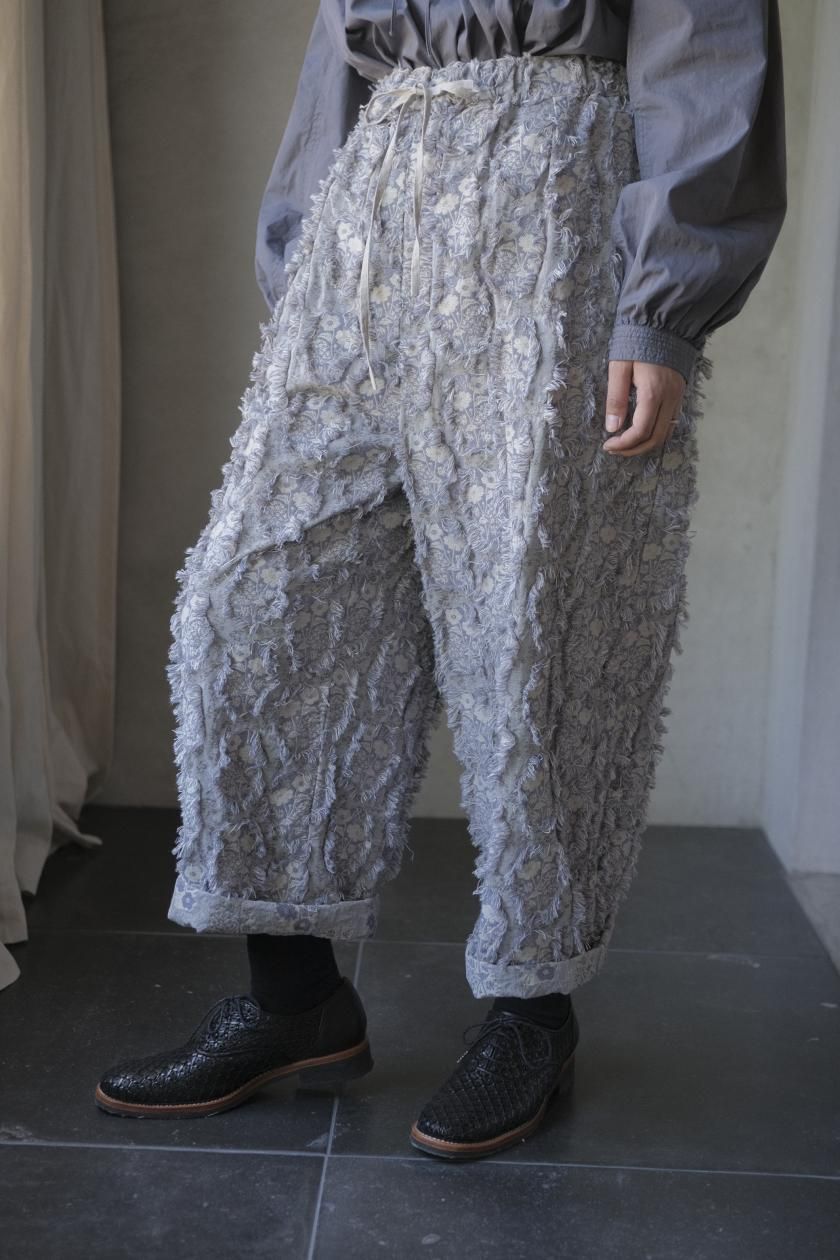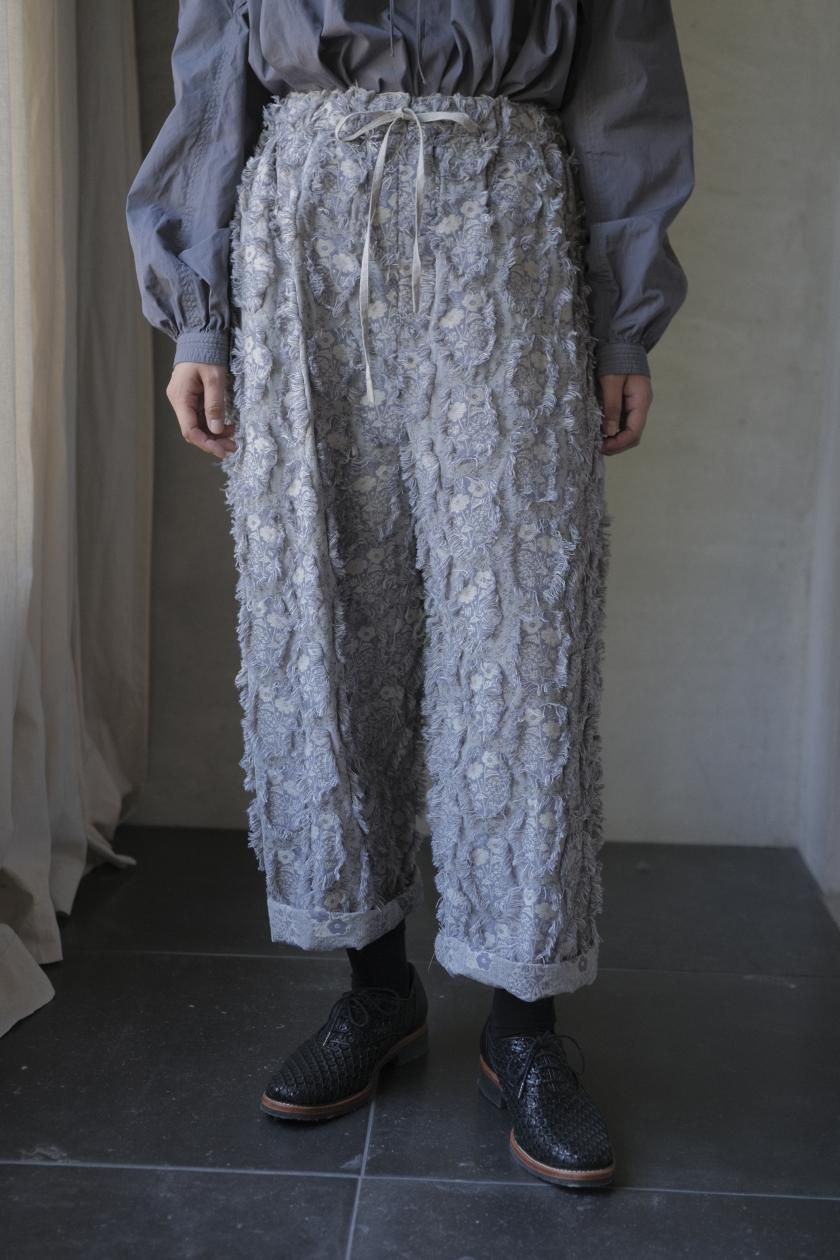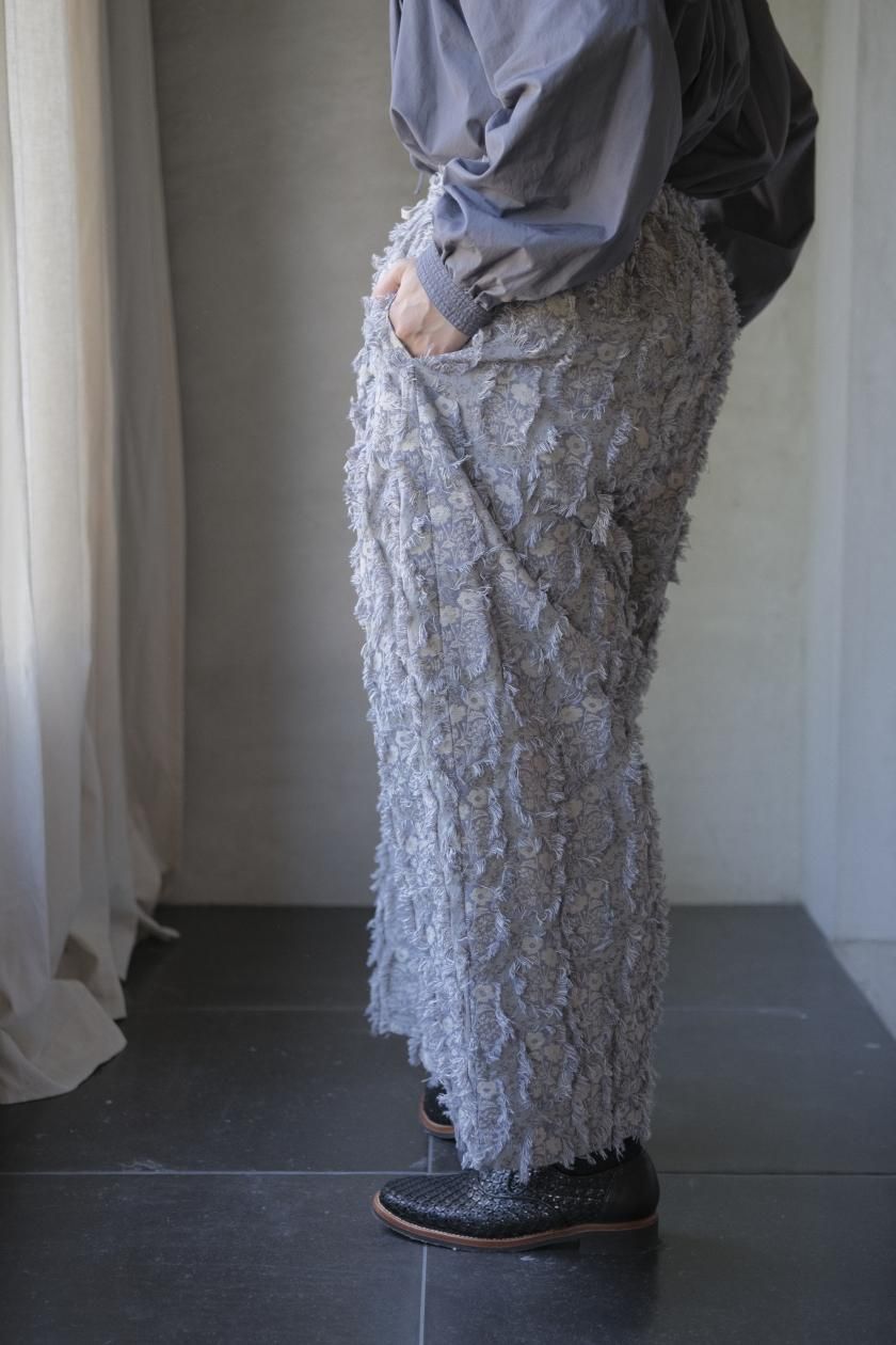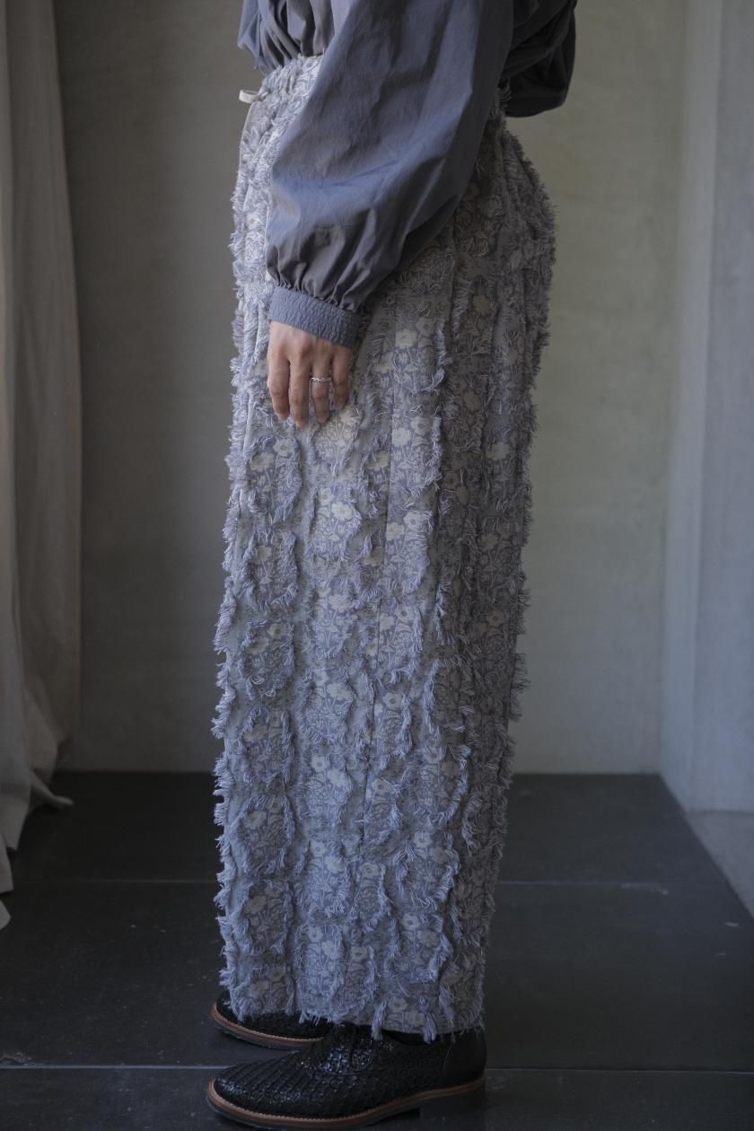パンツは存在感のあるワイドなシルエットのゴムギャザーパンツ。