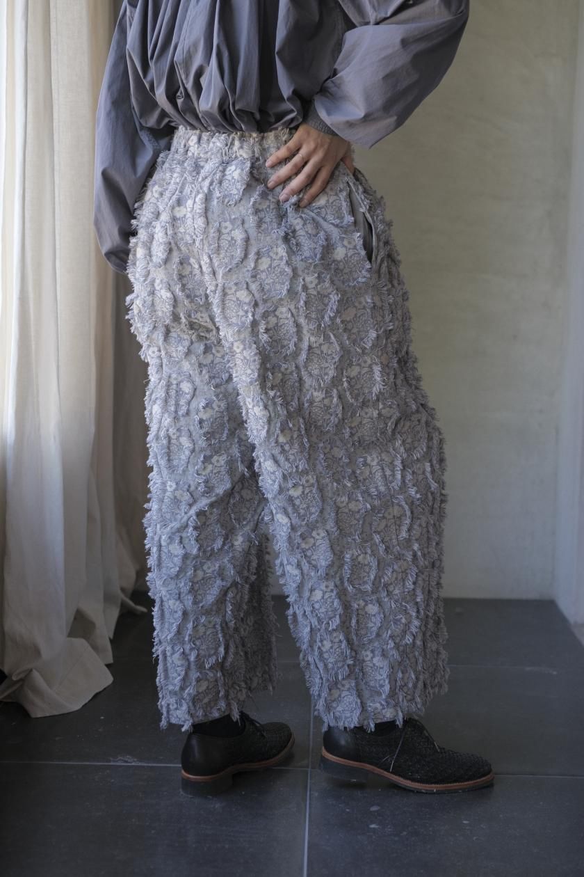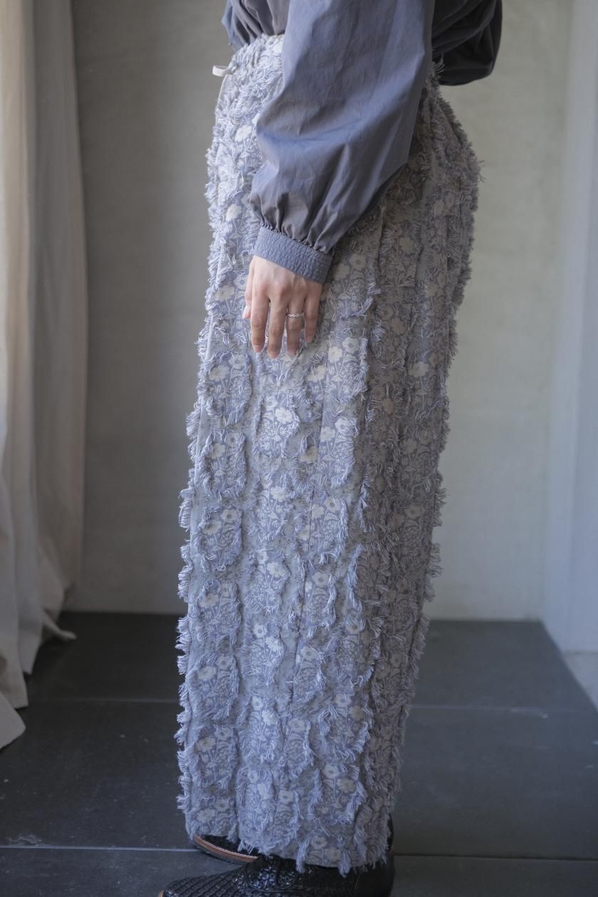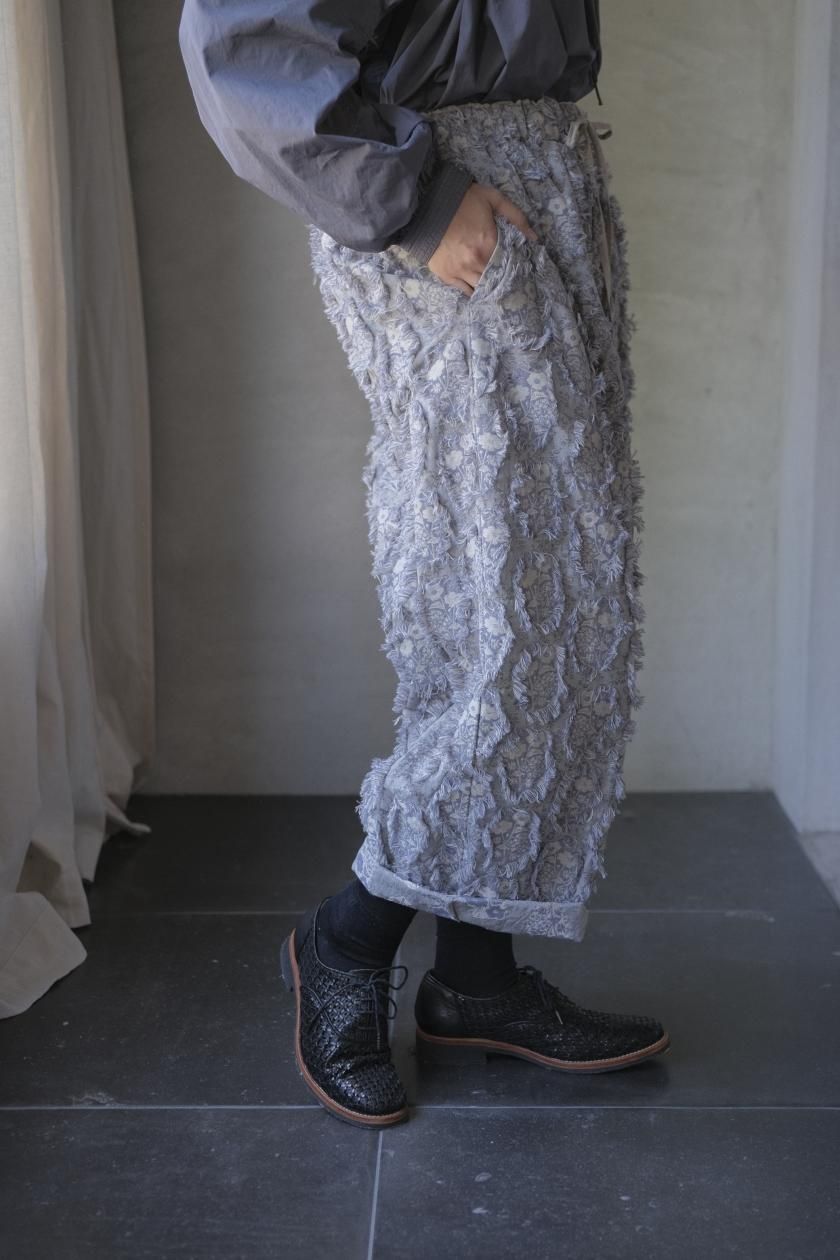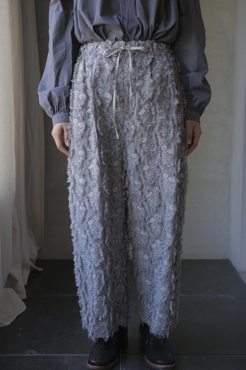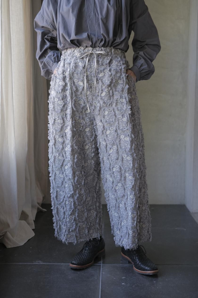 パンツは存在感のあるワイドなシルエットのゴムギャザーパンツ。