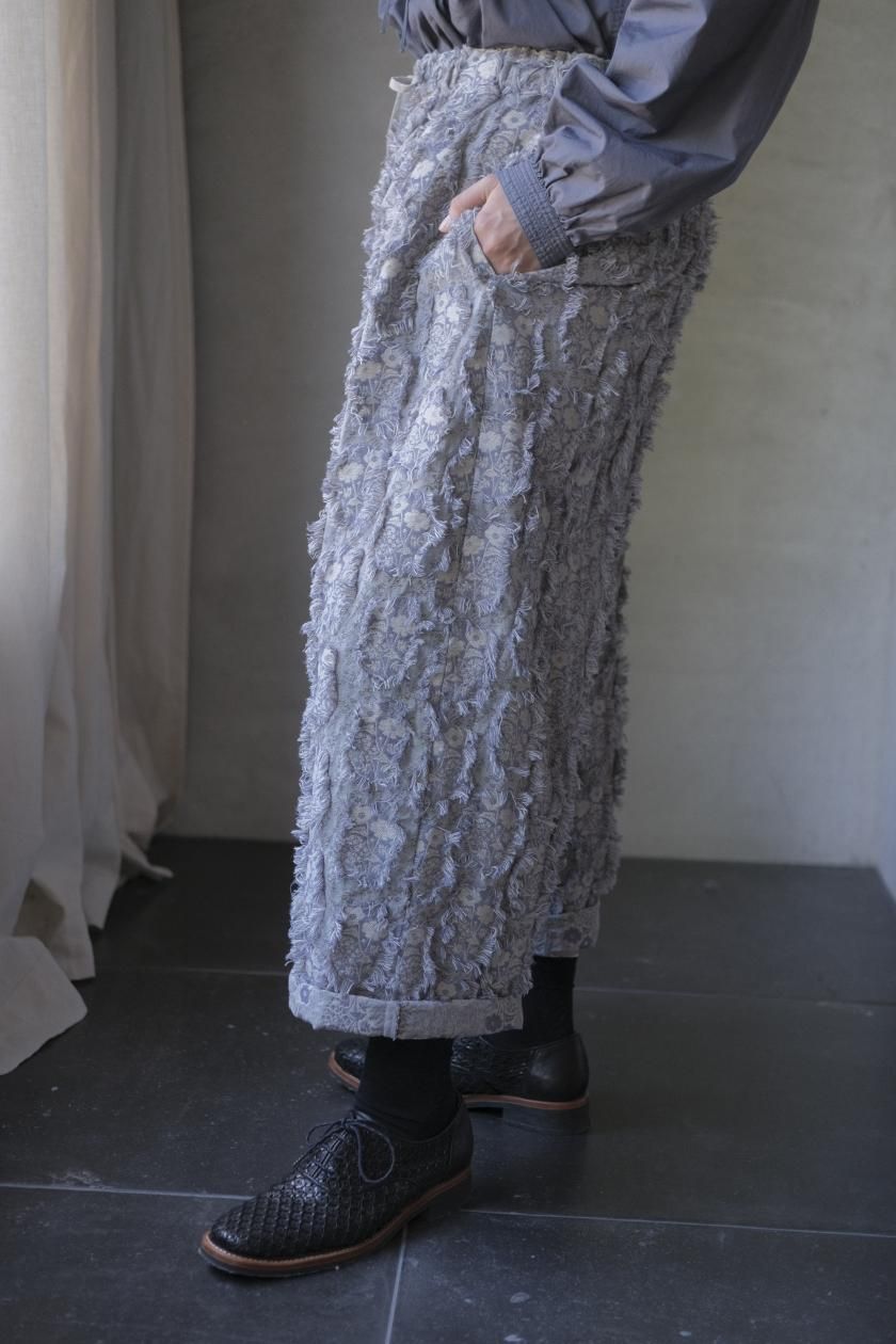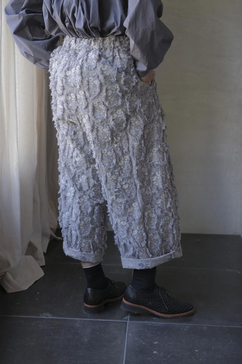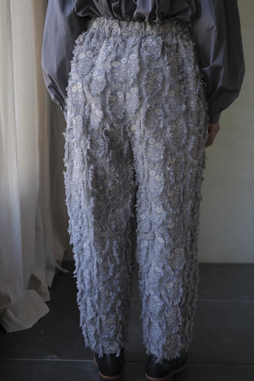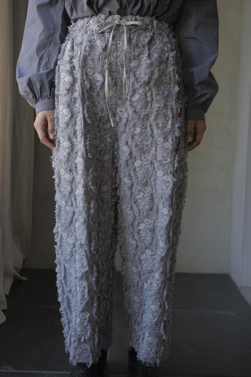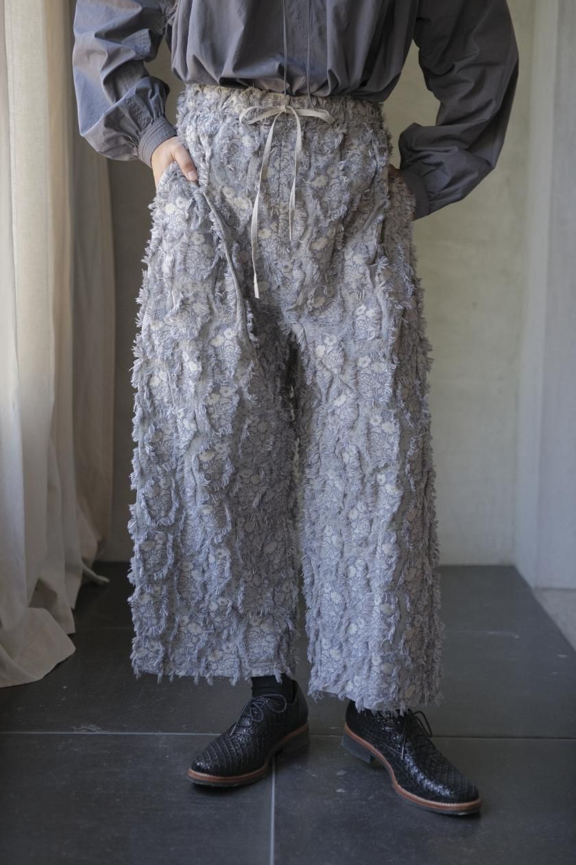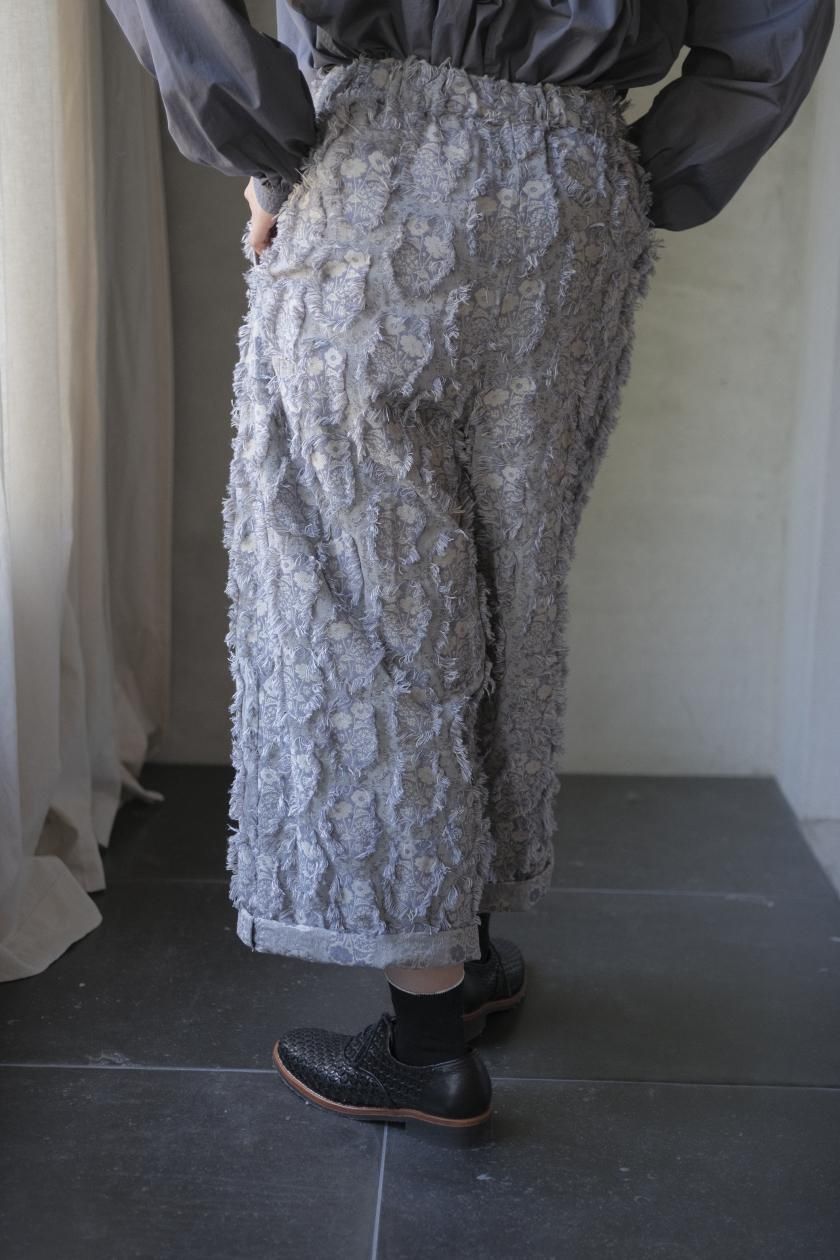 パンツは存在感のあるワイドなシルエットのゴムギャザーパンツ。