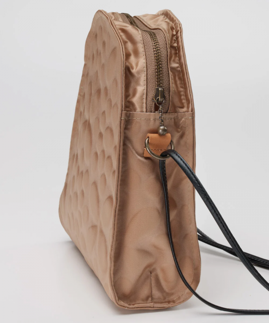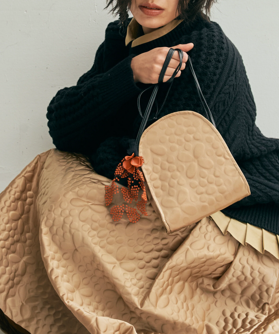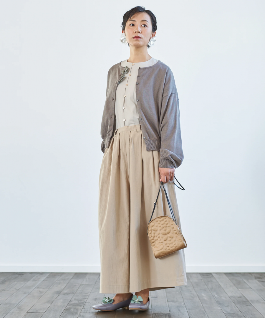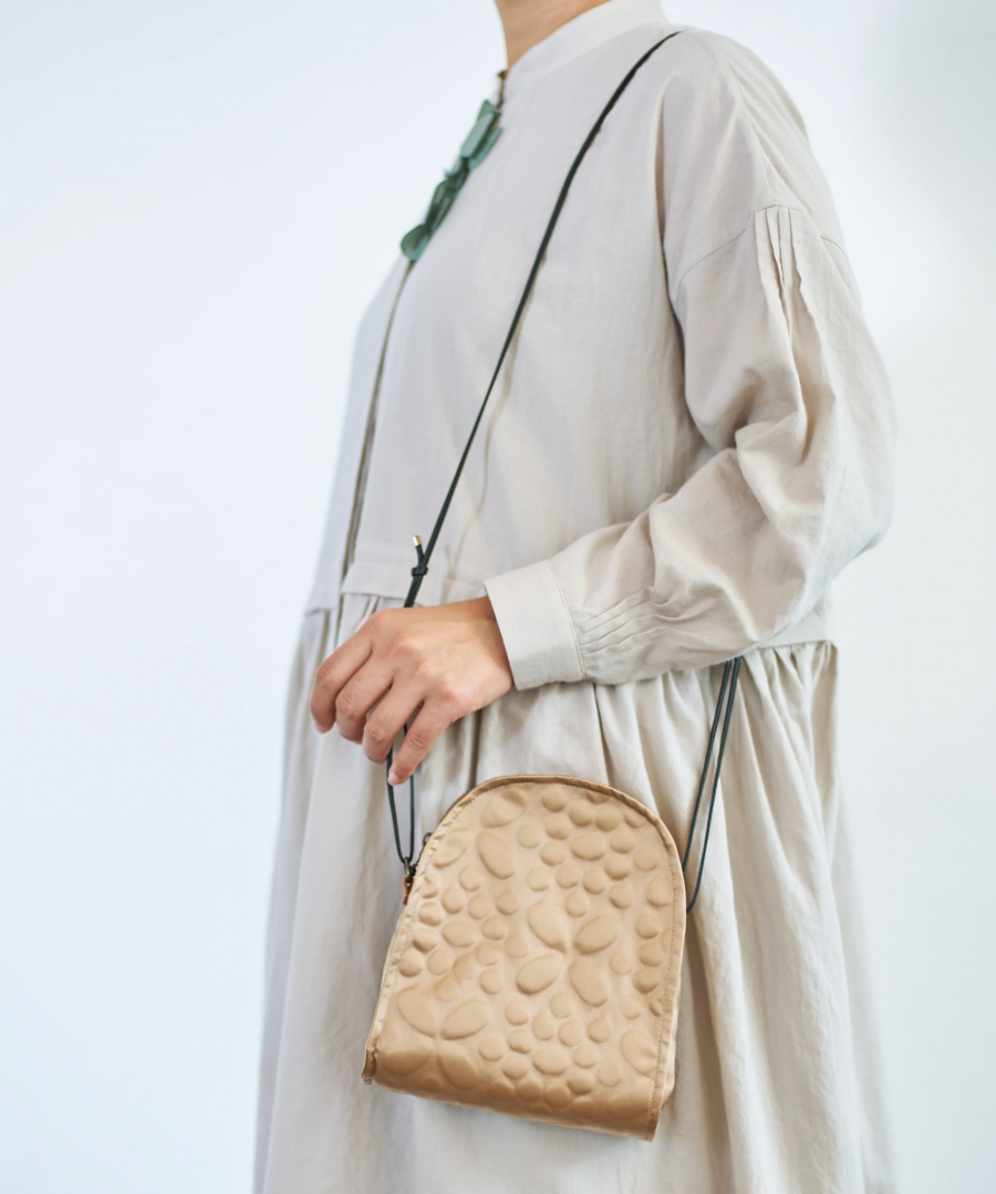 この生地をつかって、3種類のバッグを制作しました。色はグレー・ベージュ・ブラックの3色展開です。いずれもツヤ感があるので、グレーにはシルバーみが、ベージュにはゴールドみがあります。
