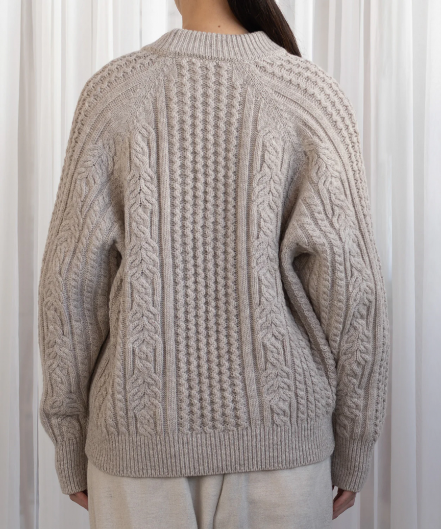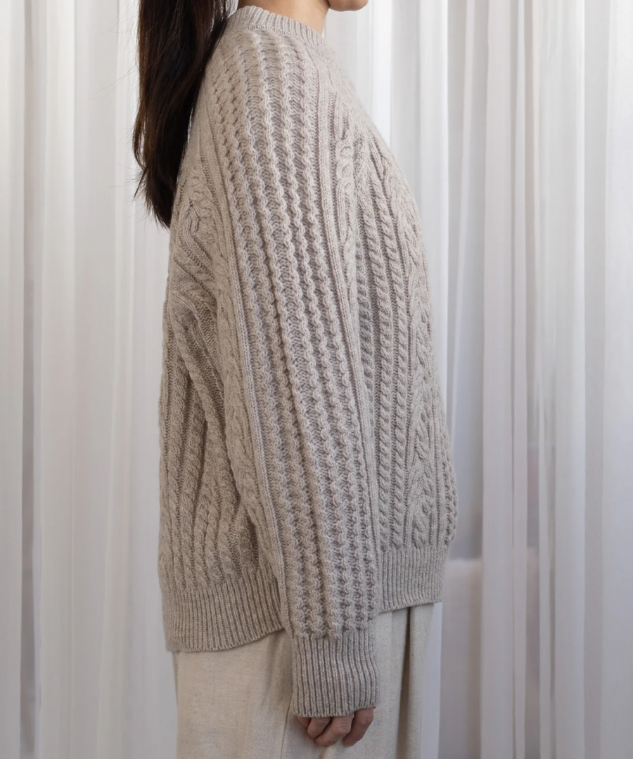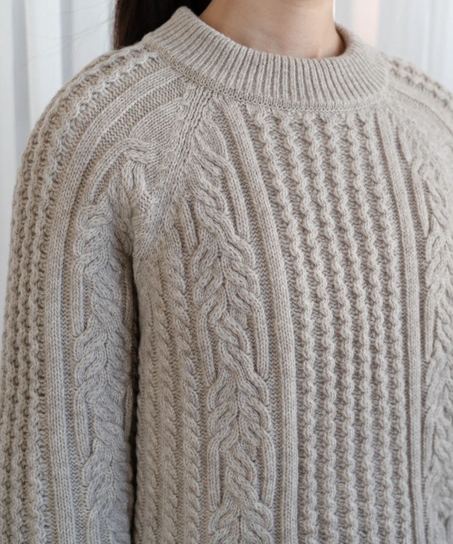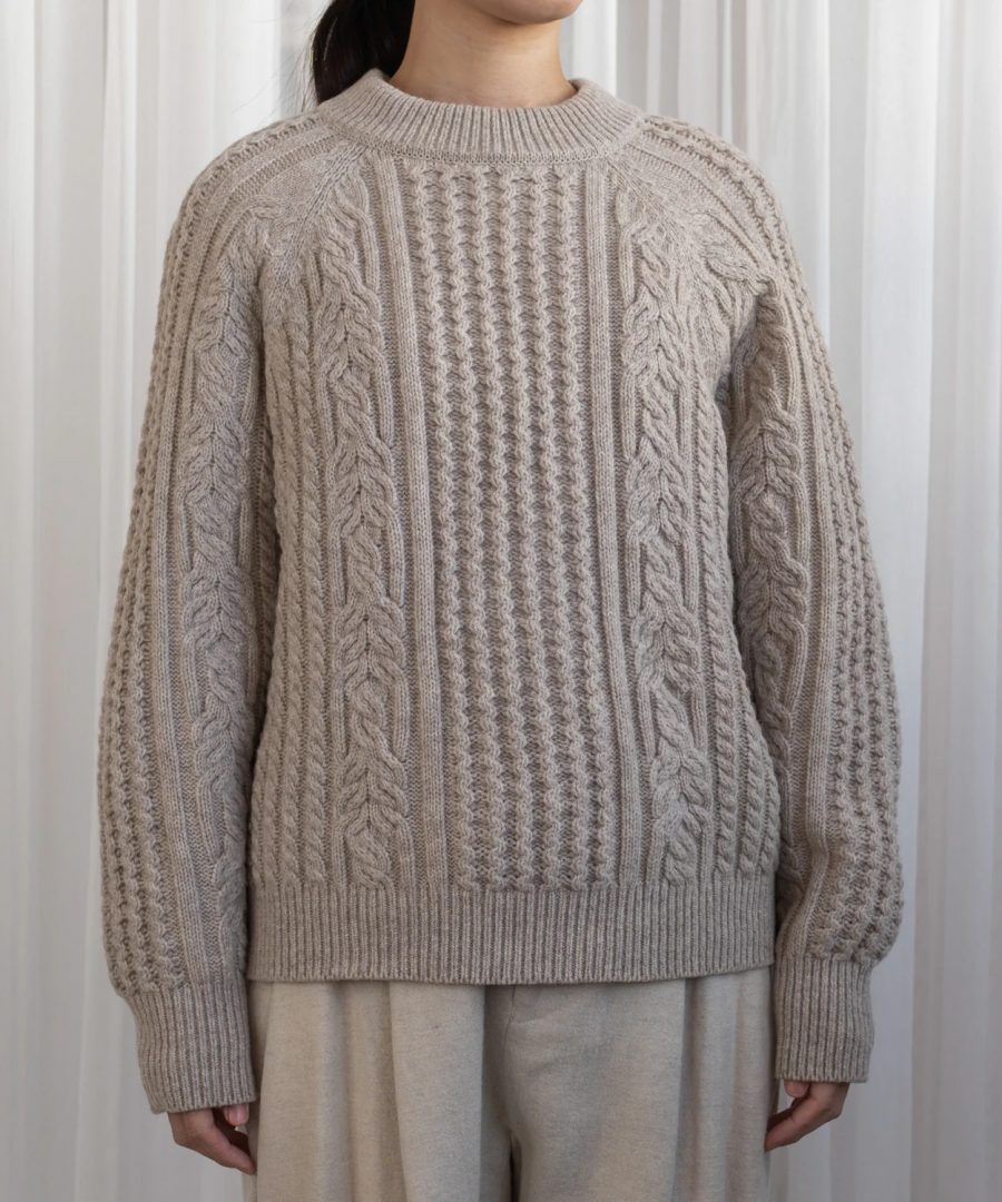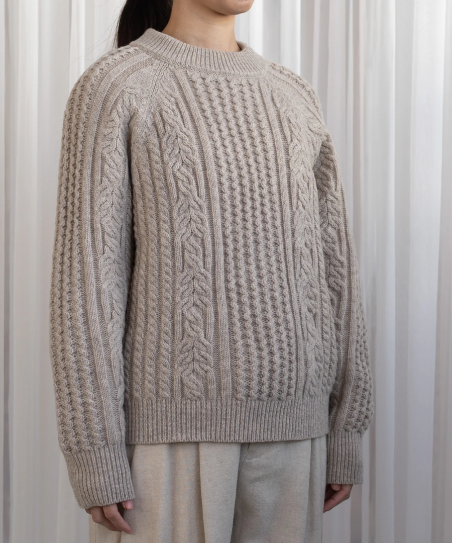 muucらしいユニークなケーブル模様編みによる浮き上がるような編み目は上品かつモダンな印象で、美しく洗練された印象を与えるセーターに仕上がりました。