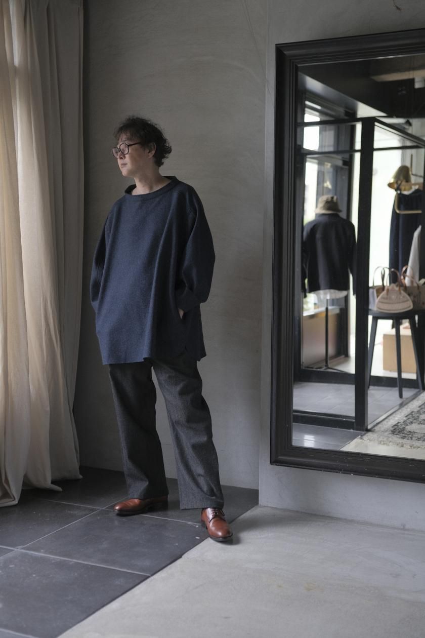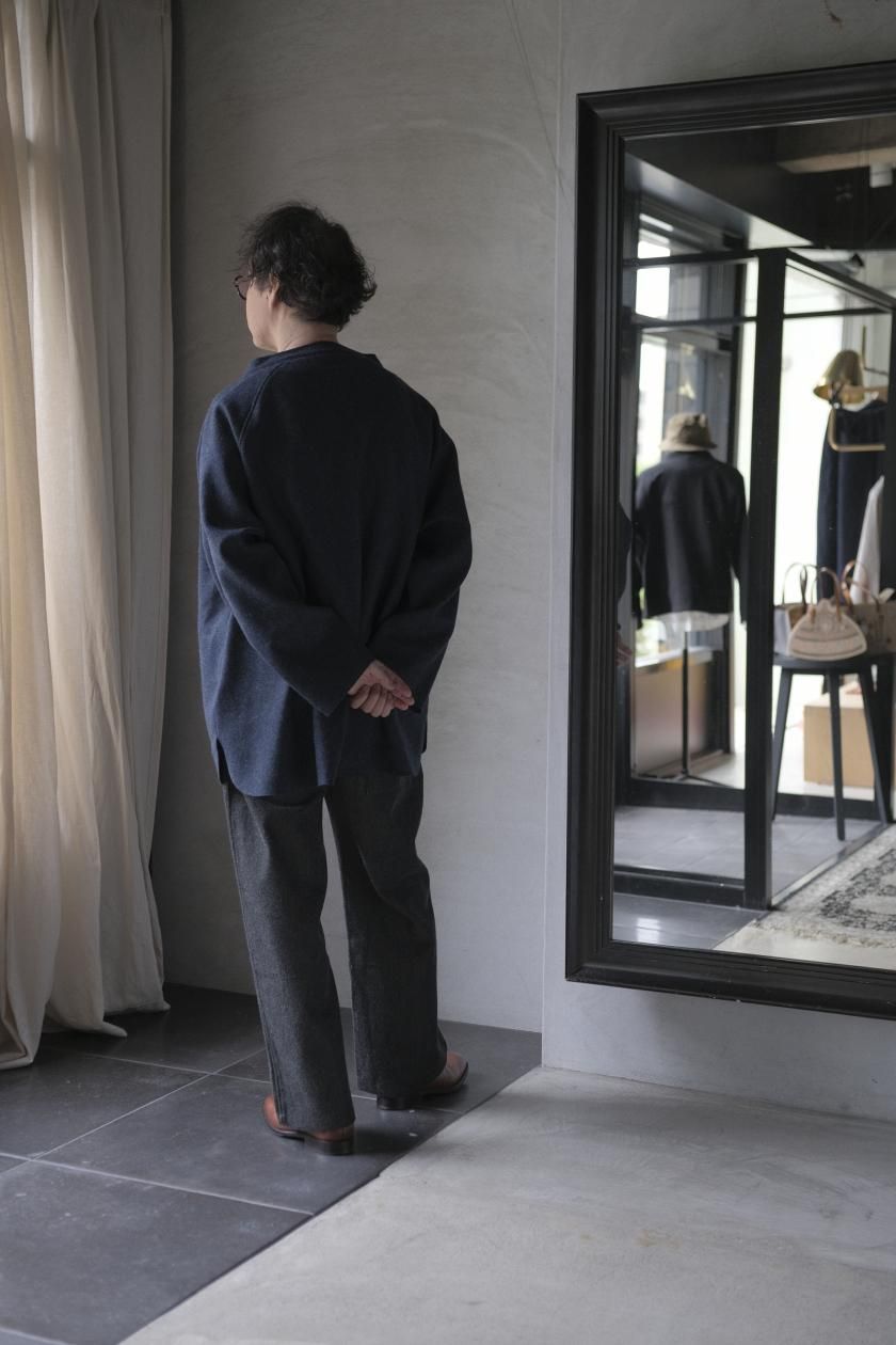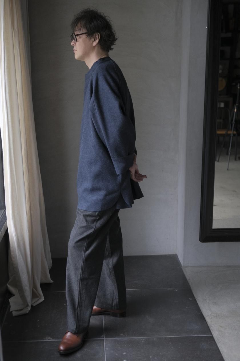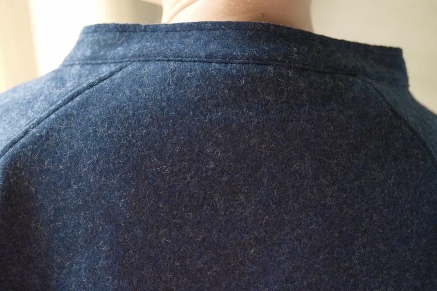 オーバーサイズのプルオーバーで、身体と生地の間に空間を多く取り、セーターやジャケットとは異なる解放感があります。スプリットラグランスリーブにより、程よい運動量が確保され、綺麗に立つ衿元が特徴です。プルオーバーのデザインながら、縫い目を利用したポケットが付いており、実用性も兼ね備えています。