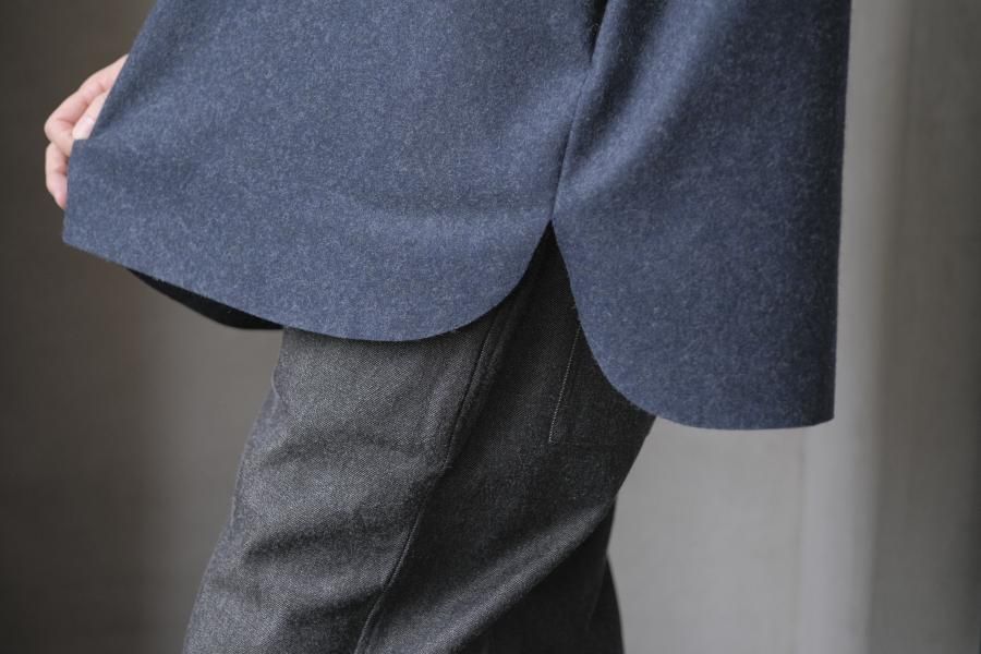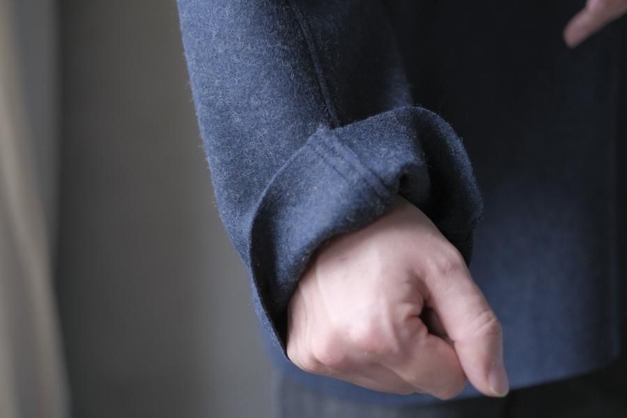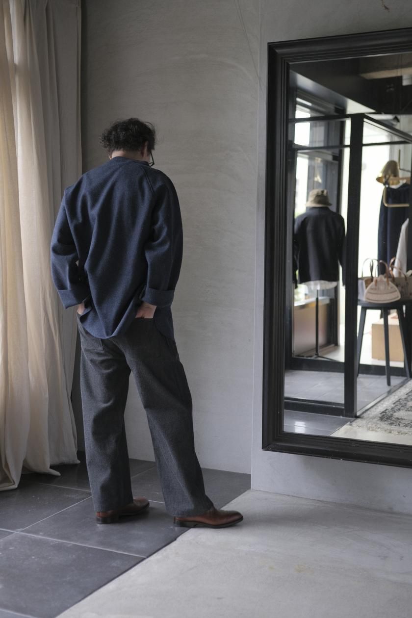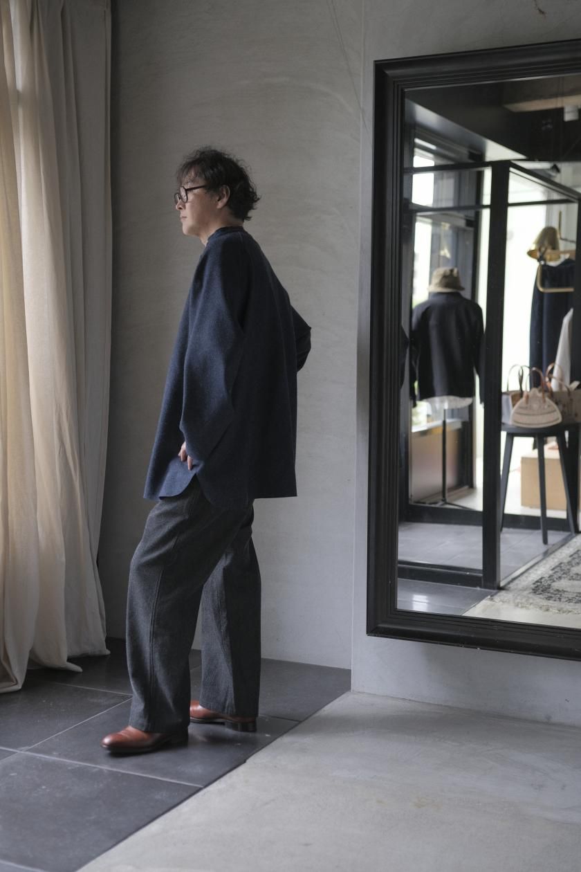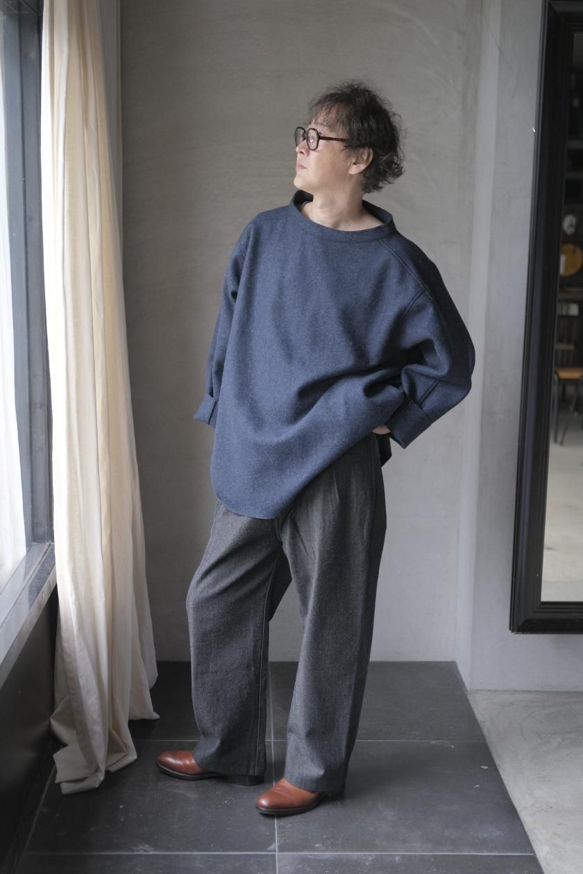 オーバーサイズのプルオーバーで、身体と生地の間に空間を多く取り、セーターやジャケットとは異なる解放感があります。スプリットラグランスリーブにより、程よい運動量が確保され、綺麗に立つ衿元が特徴です。プルオーバーのデザインながら、縫い目を利用したポケットが付いており、実用性も兼ね備えています。