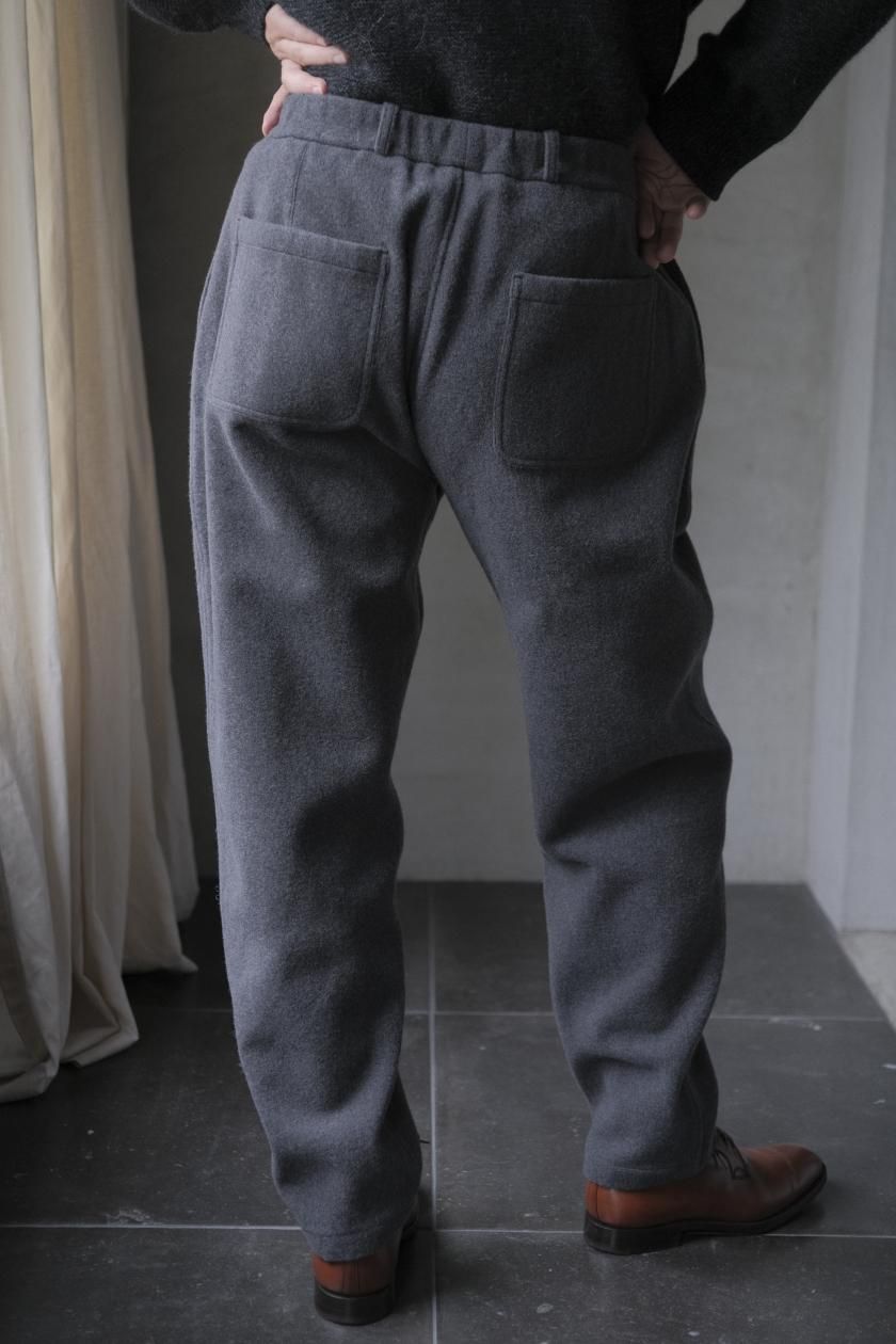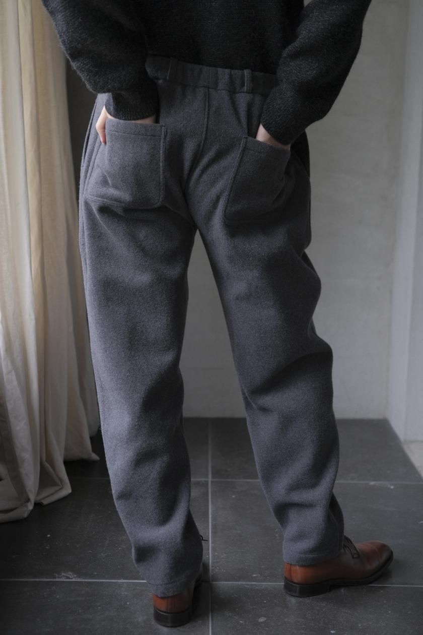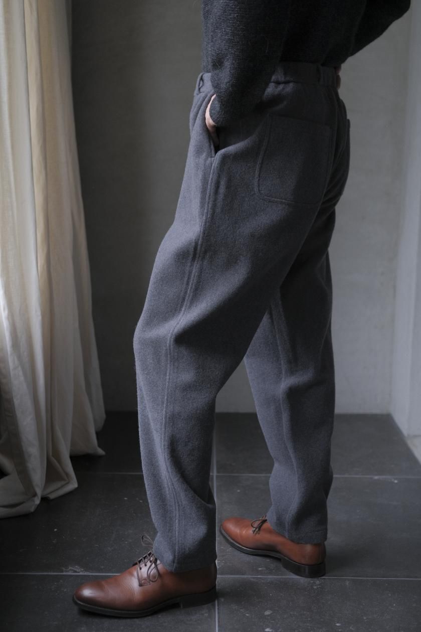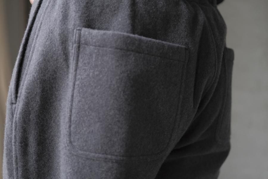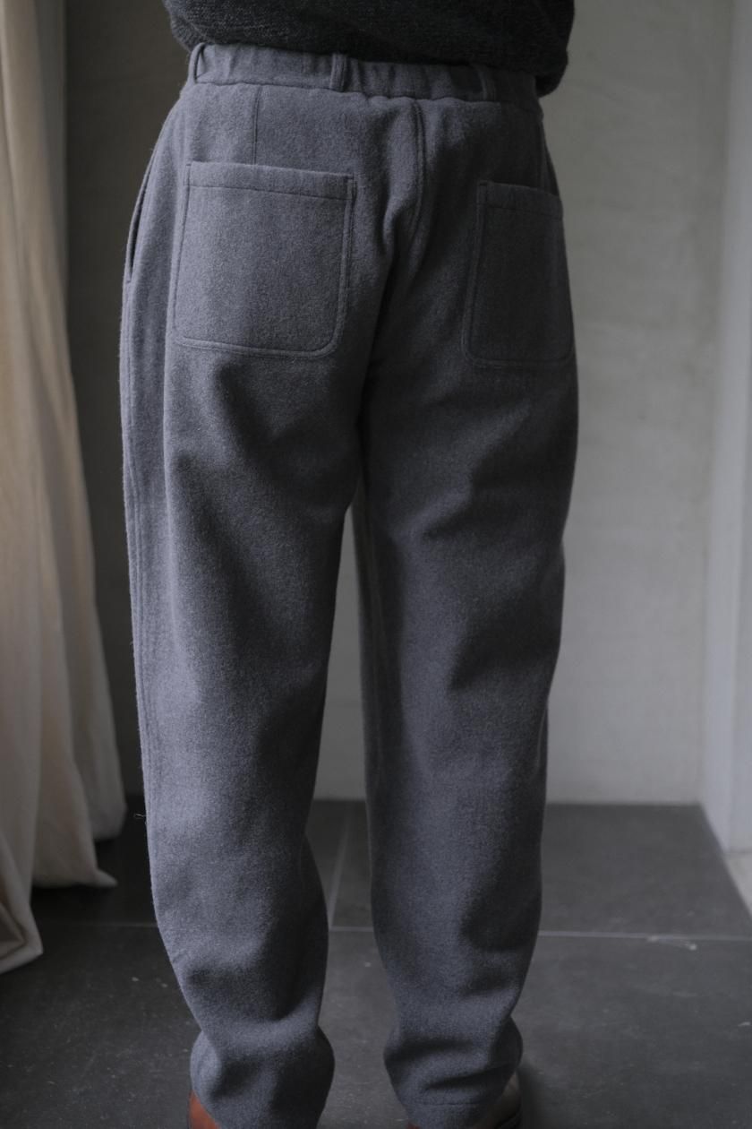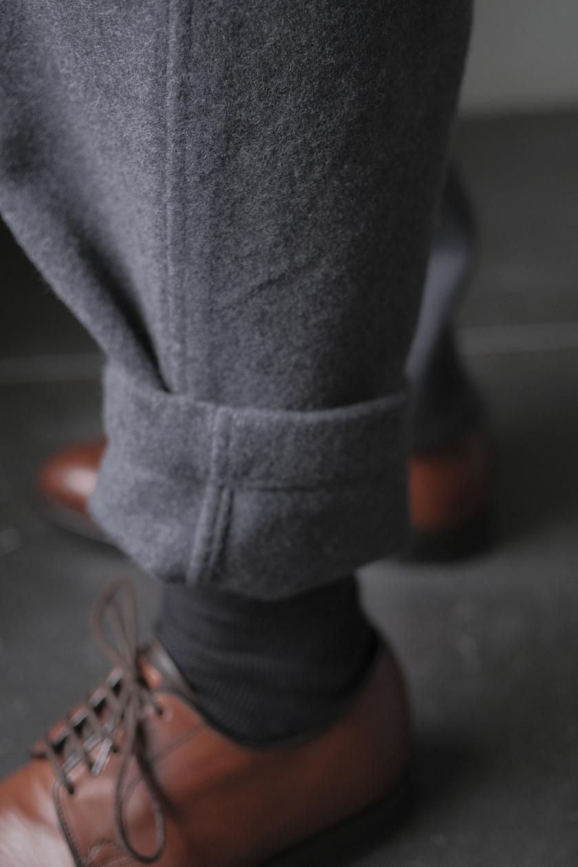 自重に耐えられるようにベルトループが付いていますが、ウエストゴムと内側の紐でベルトを用いなくても着用が可能です。比較的強めのテーパードが入っていて、生地厚の割にはスッキリとしたシルエットとなっています。ロールアップでの調整も可能で、インナーを調整する事で真冬まで対応が可能です。1枚仕立てですがベルト裏とポケットにもウールを使用しております。
