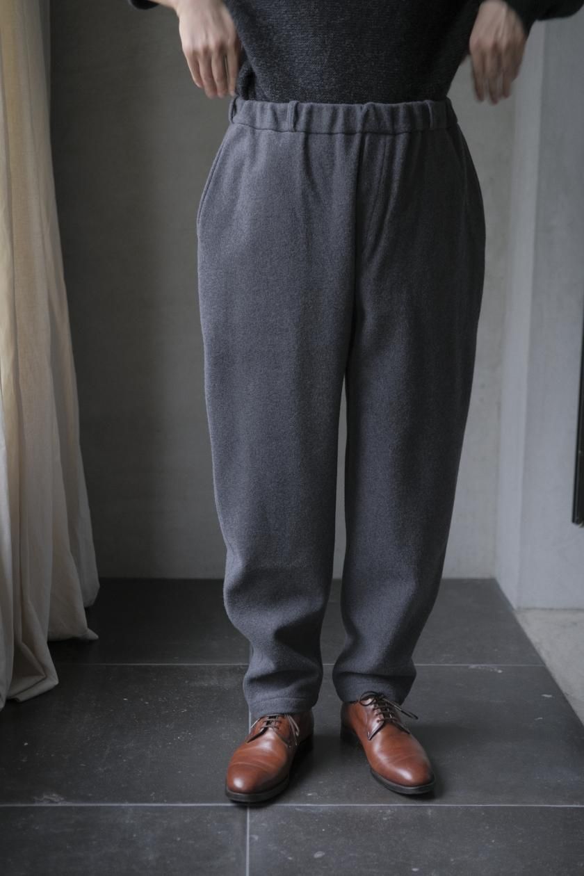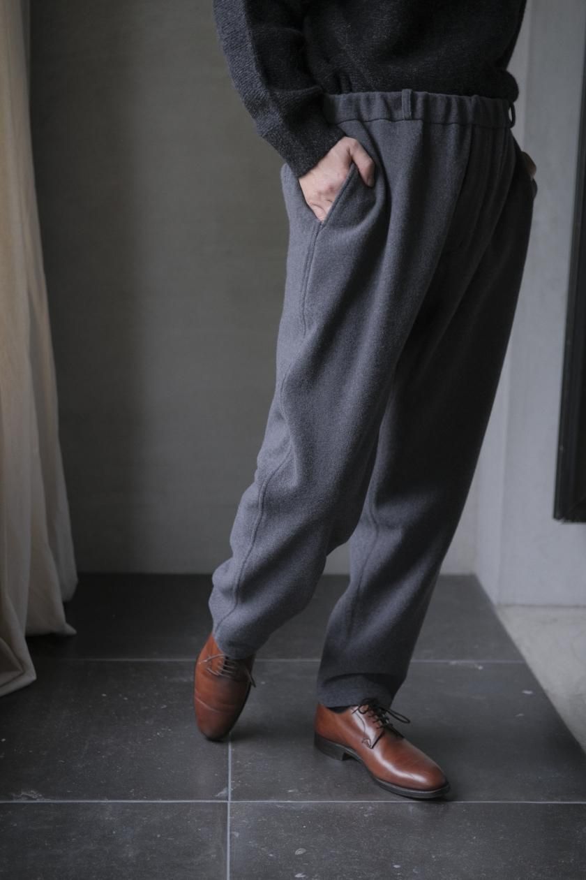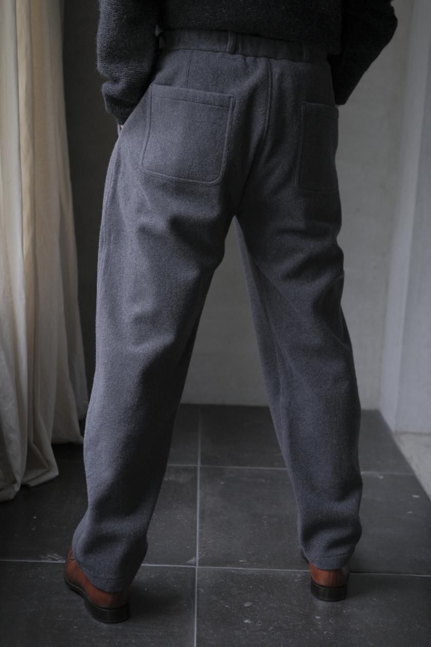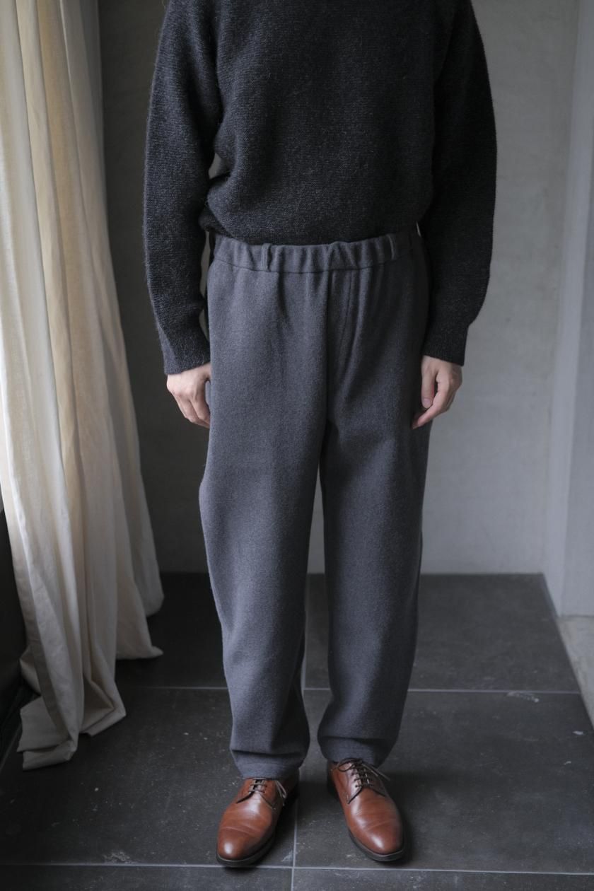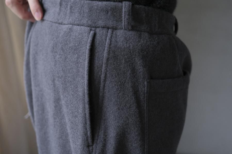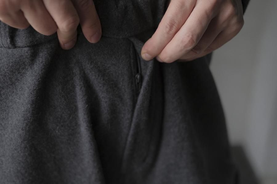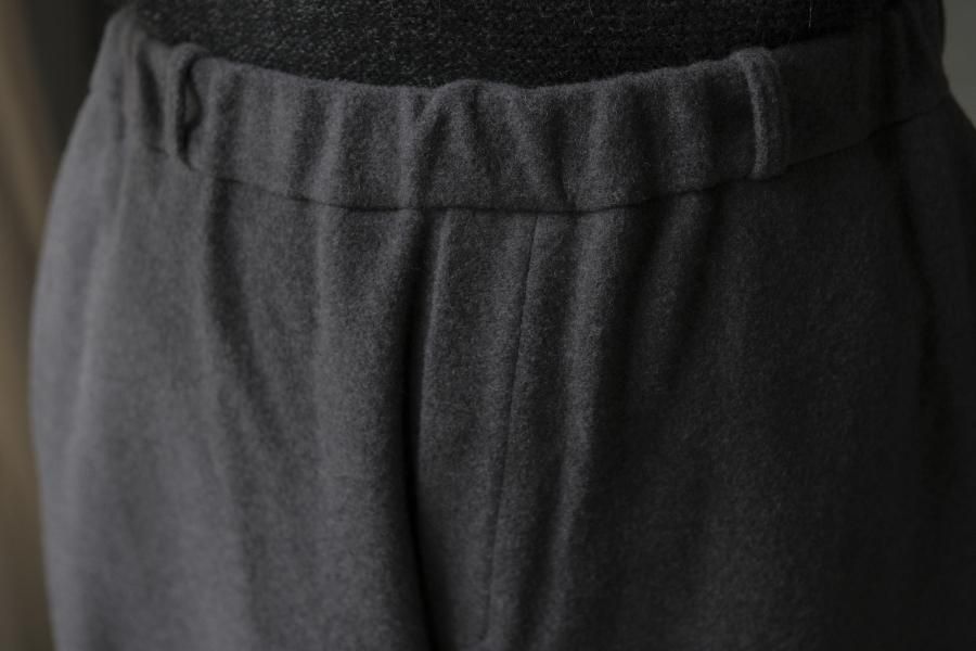 自重に耐えられるようにベルトループが付いていますが、ウエストゴムと内側の紐でベルトを用いなくても着用が可能です。比較的強めのテーパードが入っていて、生地厚の割にはスッキリとしたシルエットとなっています。ロールアップでの調整も可能で、インナーを調整する事で真冬まで対応が可能です。1枚仕立てですがベルト裏とポケットにもウールを使用しております。