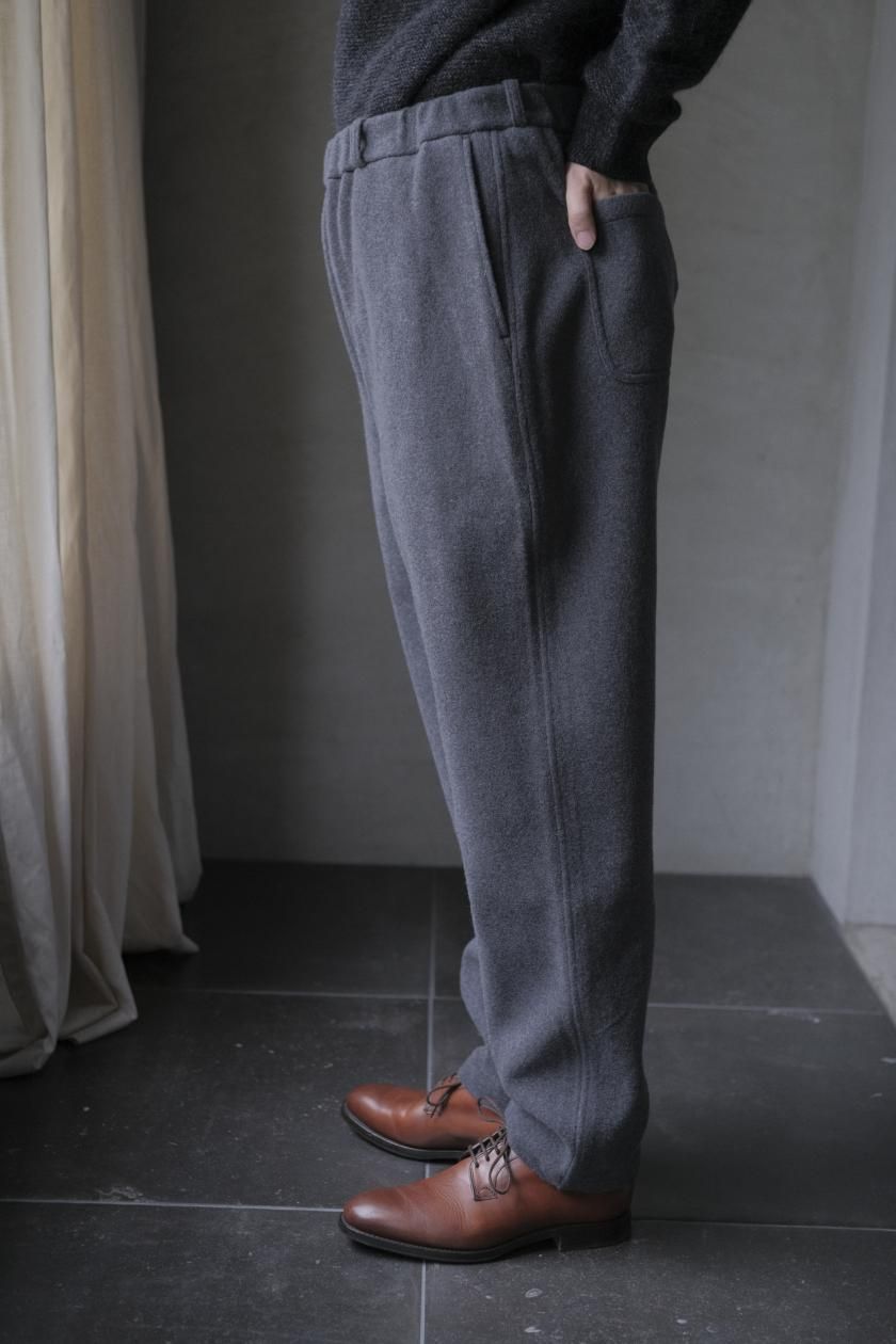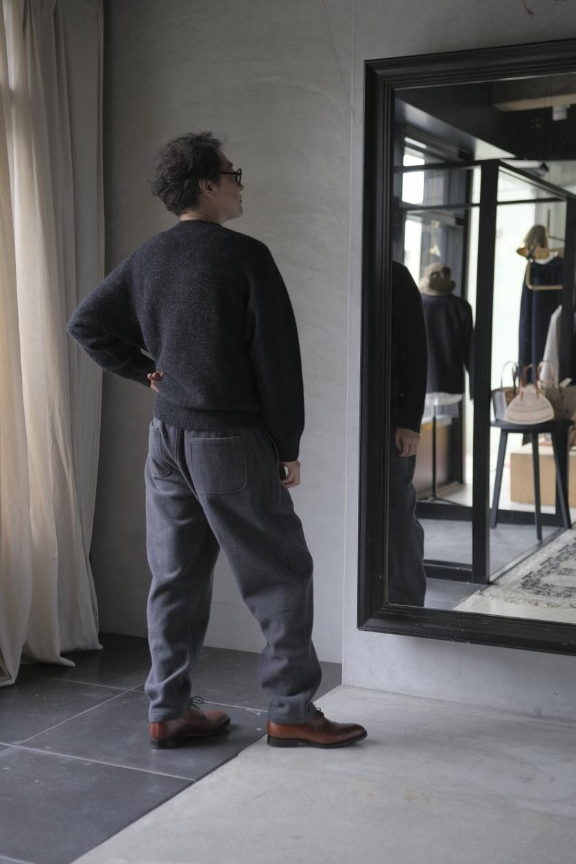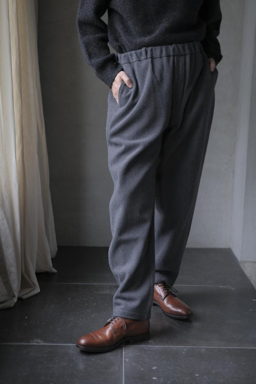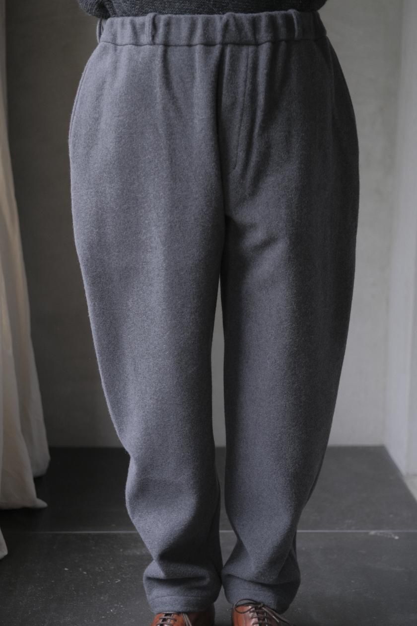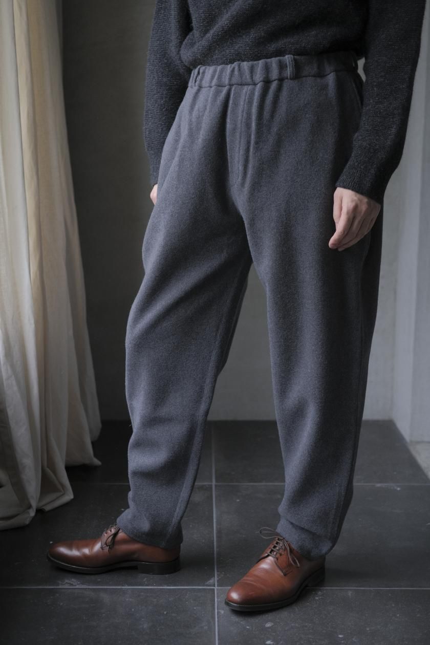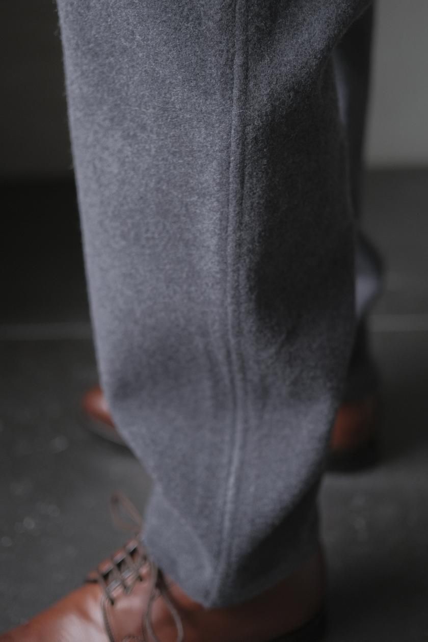 自重に耐えられるようにベルトループが付いていますが、ウエストゴムと内側の紐でベルトを用いなくても着用が可能です。比較的強めのテーパードが入っていて、生地厚の割にはスッキリとしたシルエットとなっています。ロールアップでの調整も可能で、インナーを調整する事で真冬まで対応が可能です。1枚仕立てですがベルト裏とポケットにもウールを使用しております。