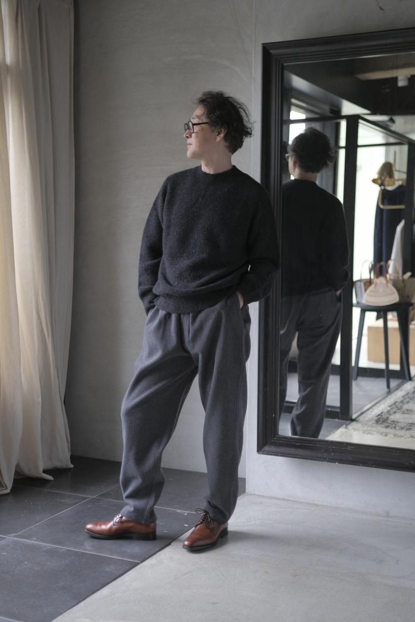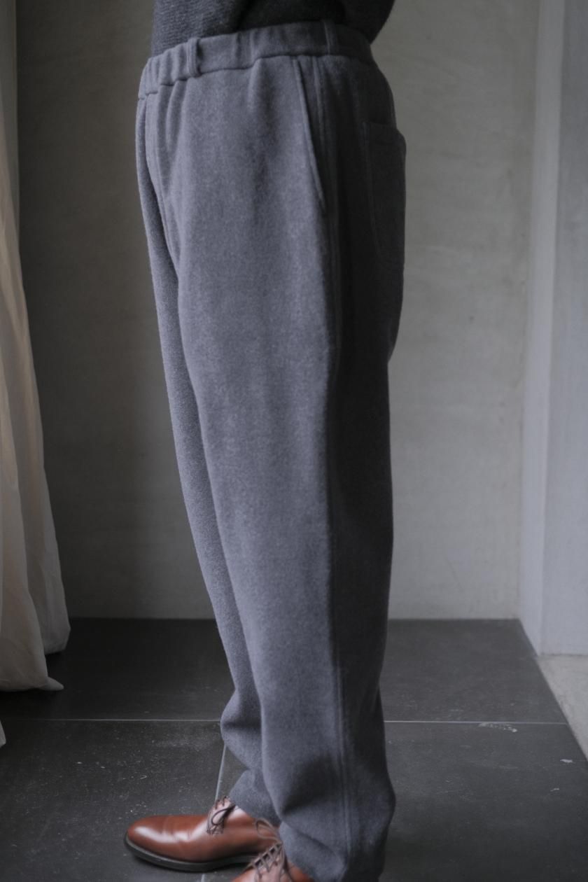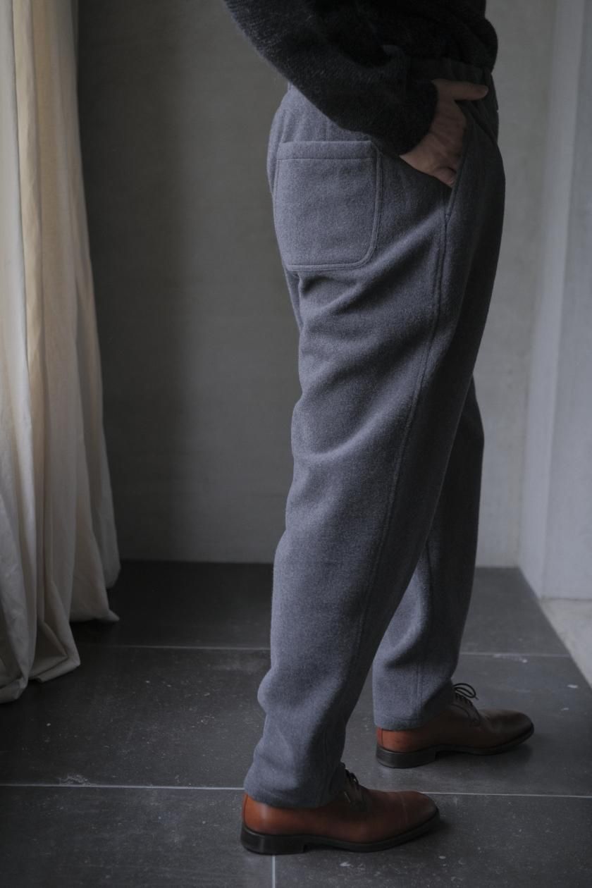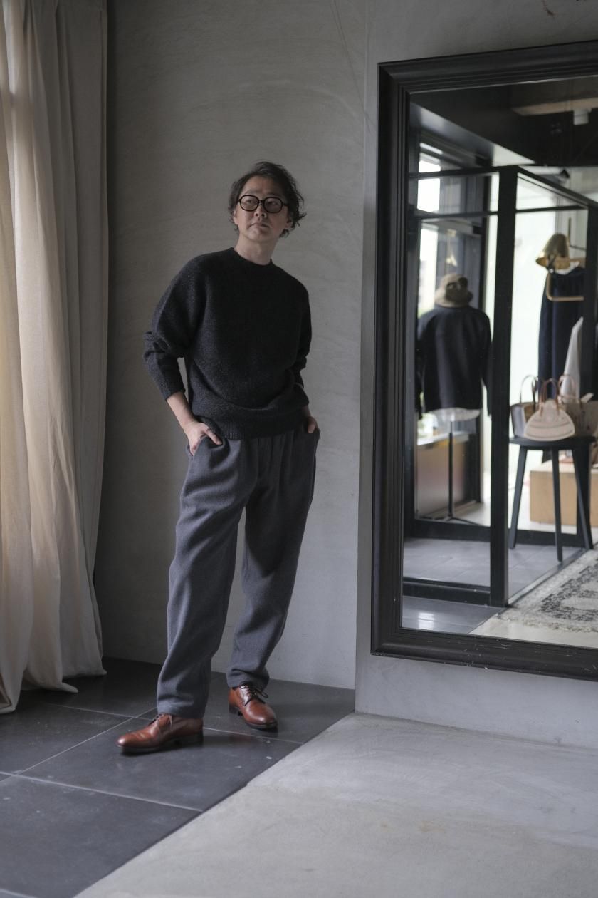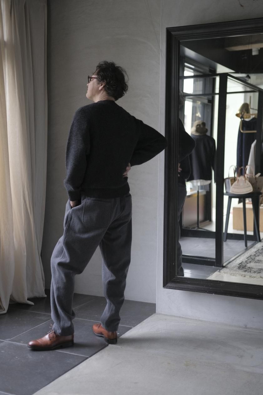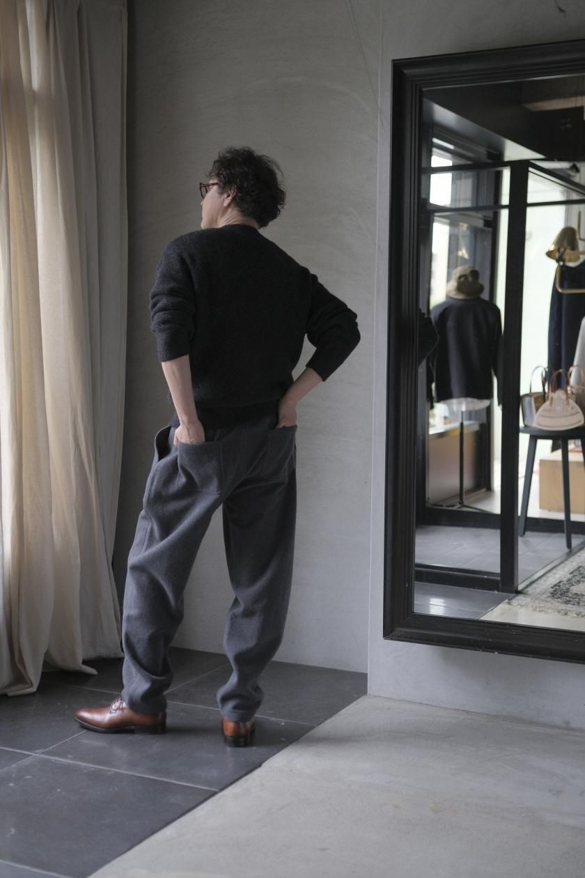 自重に耐えられるようにベルトループが付いていますが、ウエストゴムと内側の紐でベルトを用いなくても着用が可能です。比較的強めのテーパードが入っていて、生地厚の割にはスッキリとしたシルエットとなっています。ロールアップでの調整も可能で、インナーを調整する事で真冬まで対応が可能です。1枚仕立てですがベルト裏とポケットにもウールを使用しております。