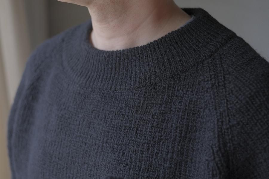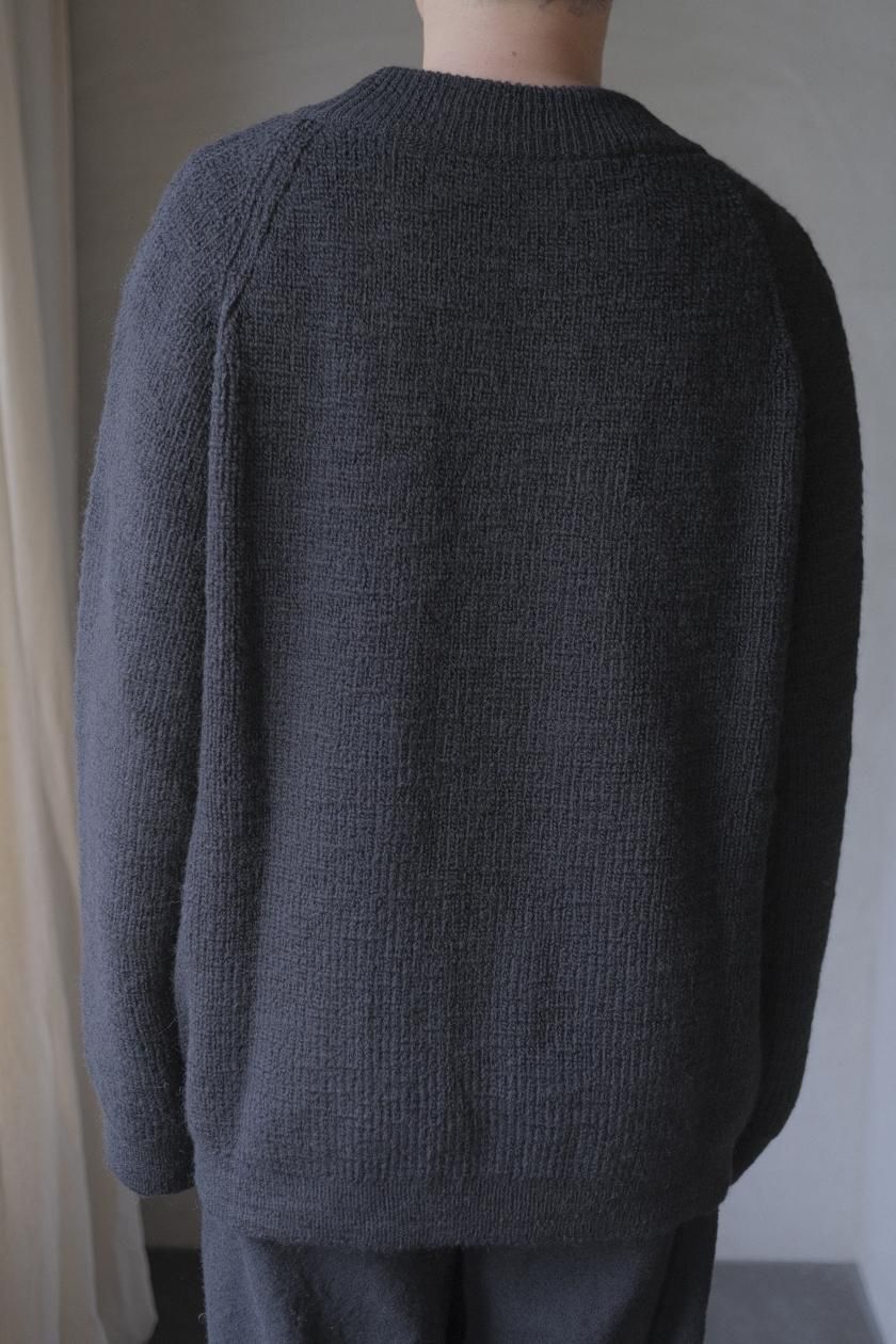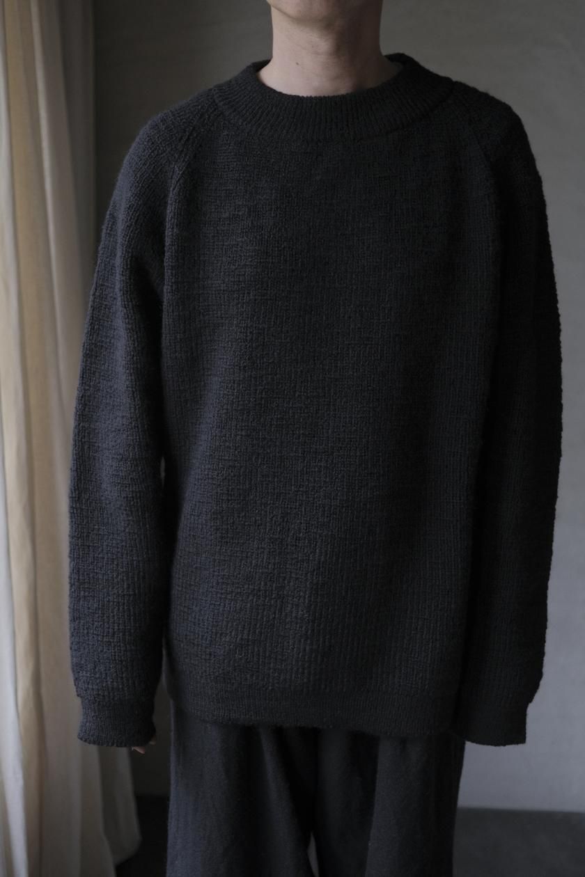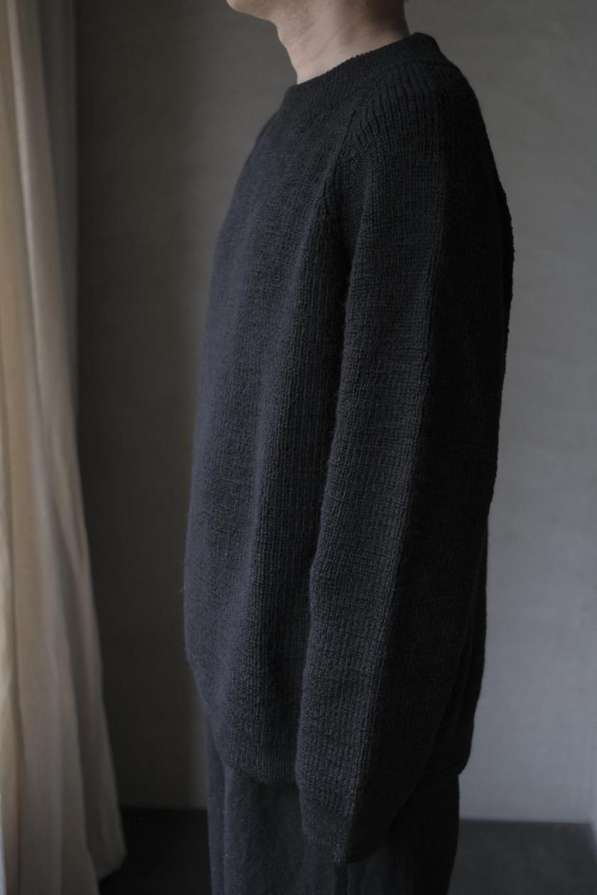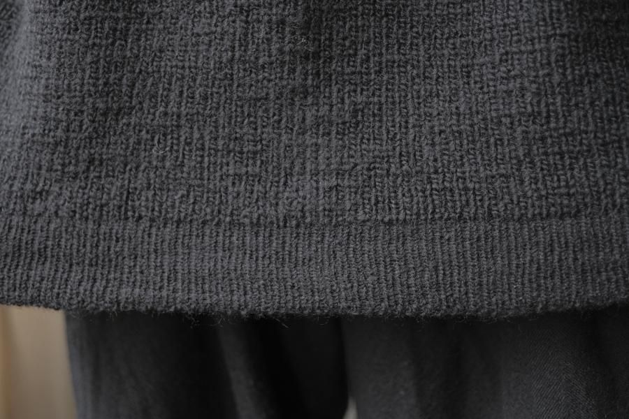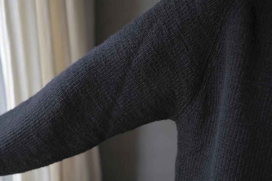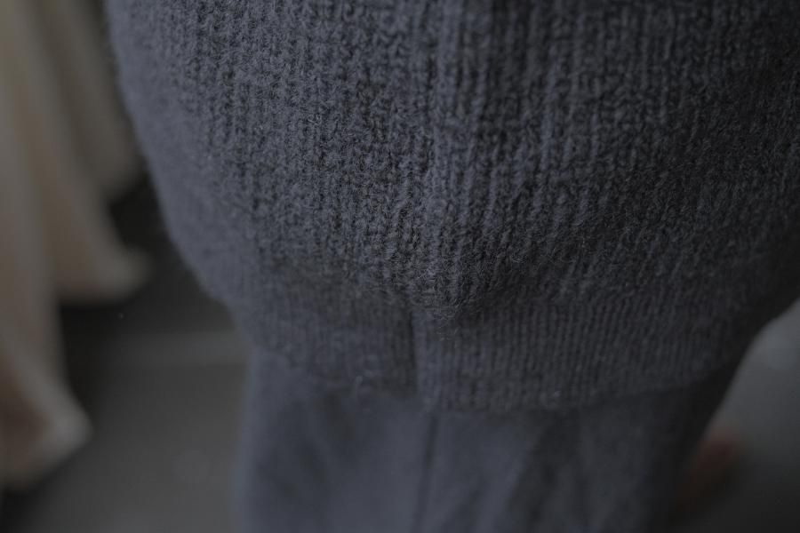 畦編み特有の立体的なボリュームを活かした、身幅にゆとりをもたせたシルエットです。インナーとしてはもちろん、アウターとして中に厚手のレイヤリングをしても窮屈さを感じさせず、秋冬の着こなしに柔軟に対応します。日常の道具としての機能性を意識しています。