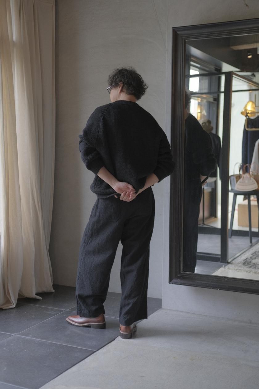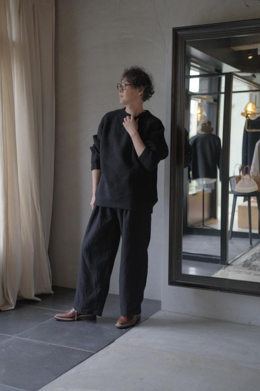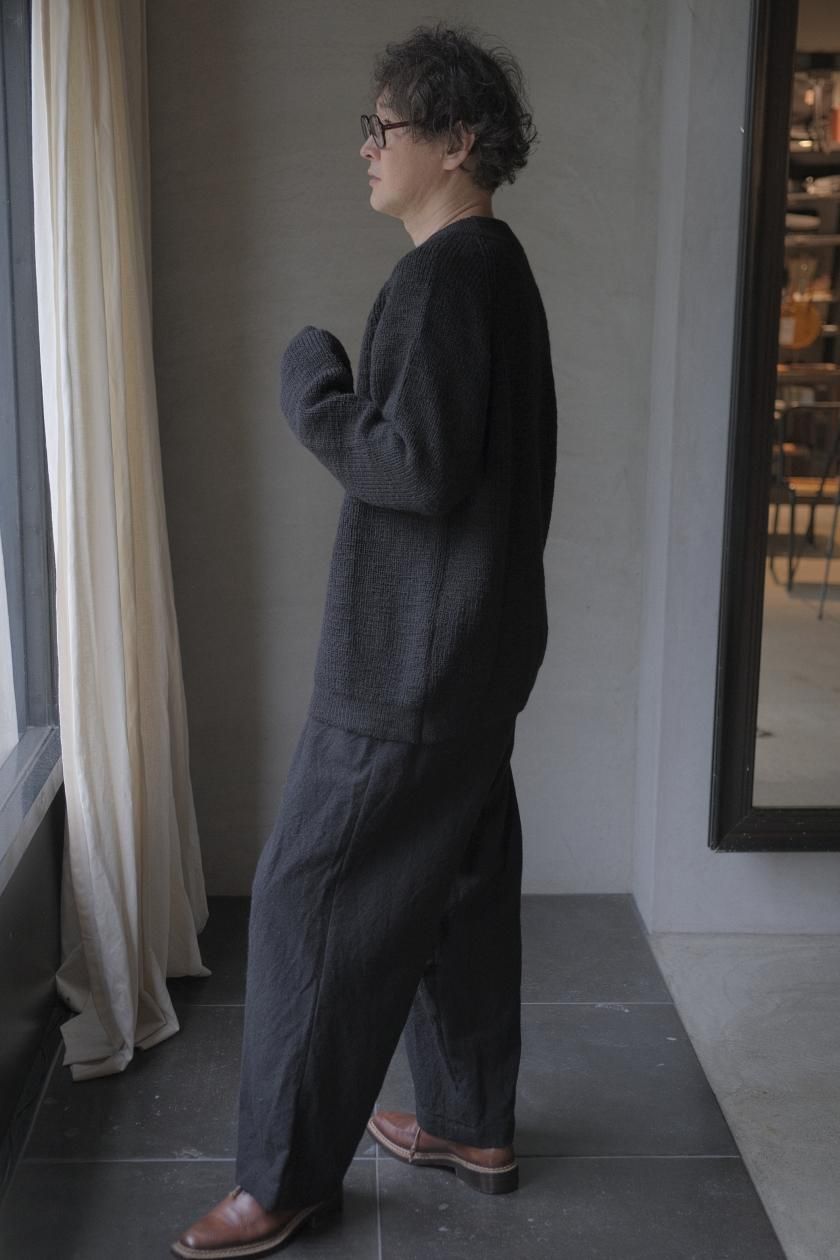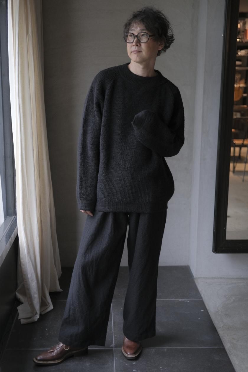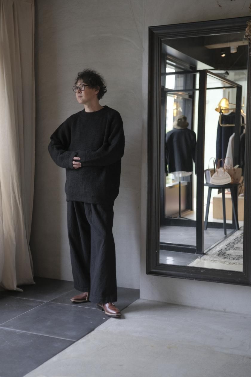 畦編み特有の立体的なボリュームを活かした、身幅にゆとりをもたせたシルエットです。インナーとしてはもちろん、アウターとして中に厚手のレイヤリングをしても窮屈さを感じさせず、秋冬の着こなしに柔軟に対応します。日常の道具としての機能性を意識しています。