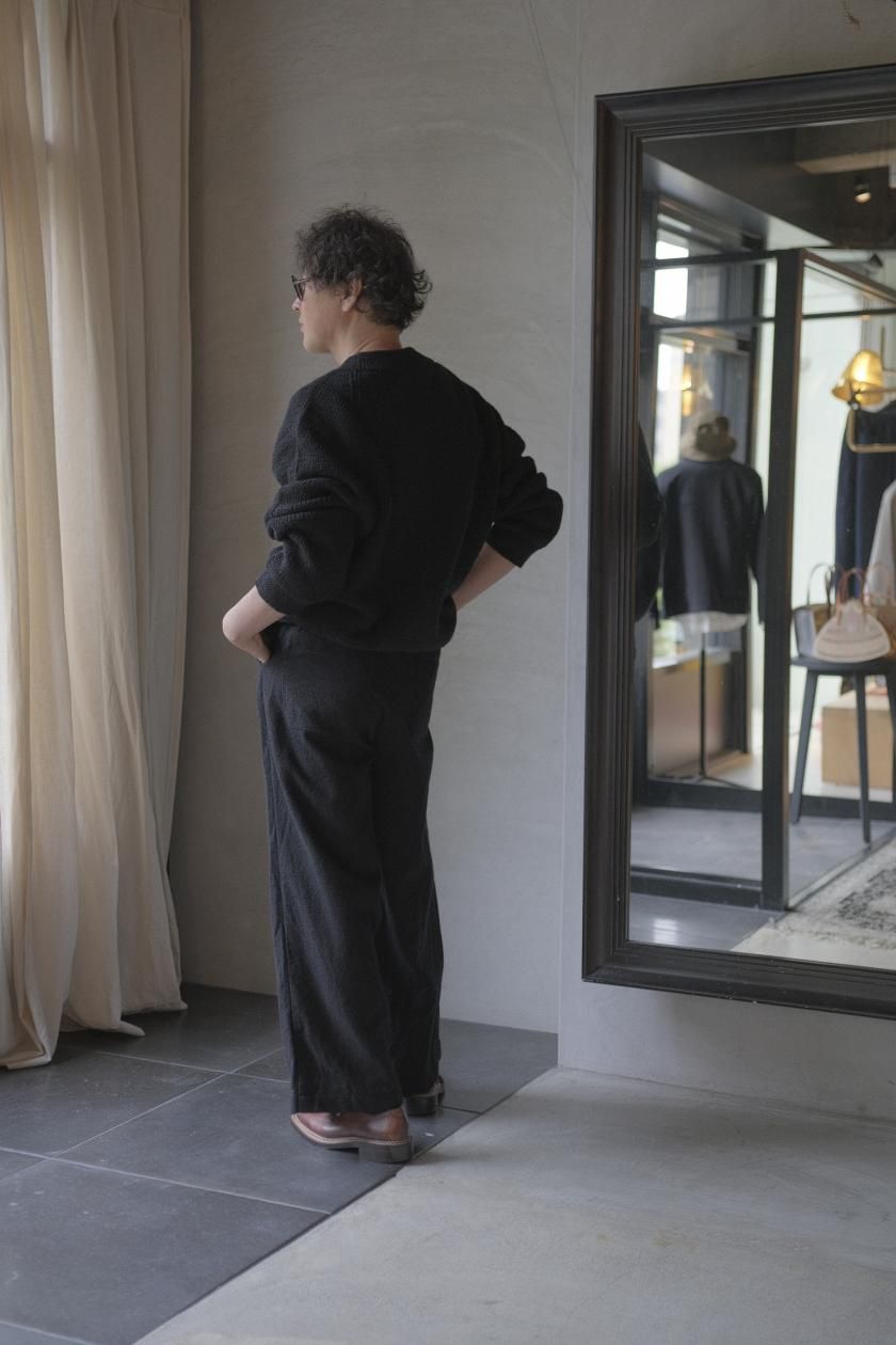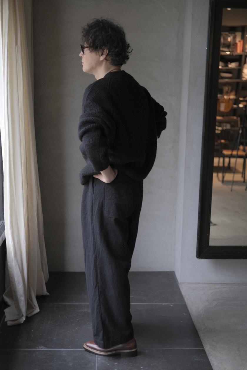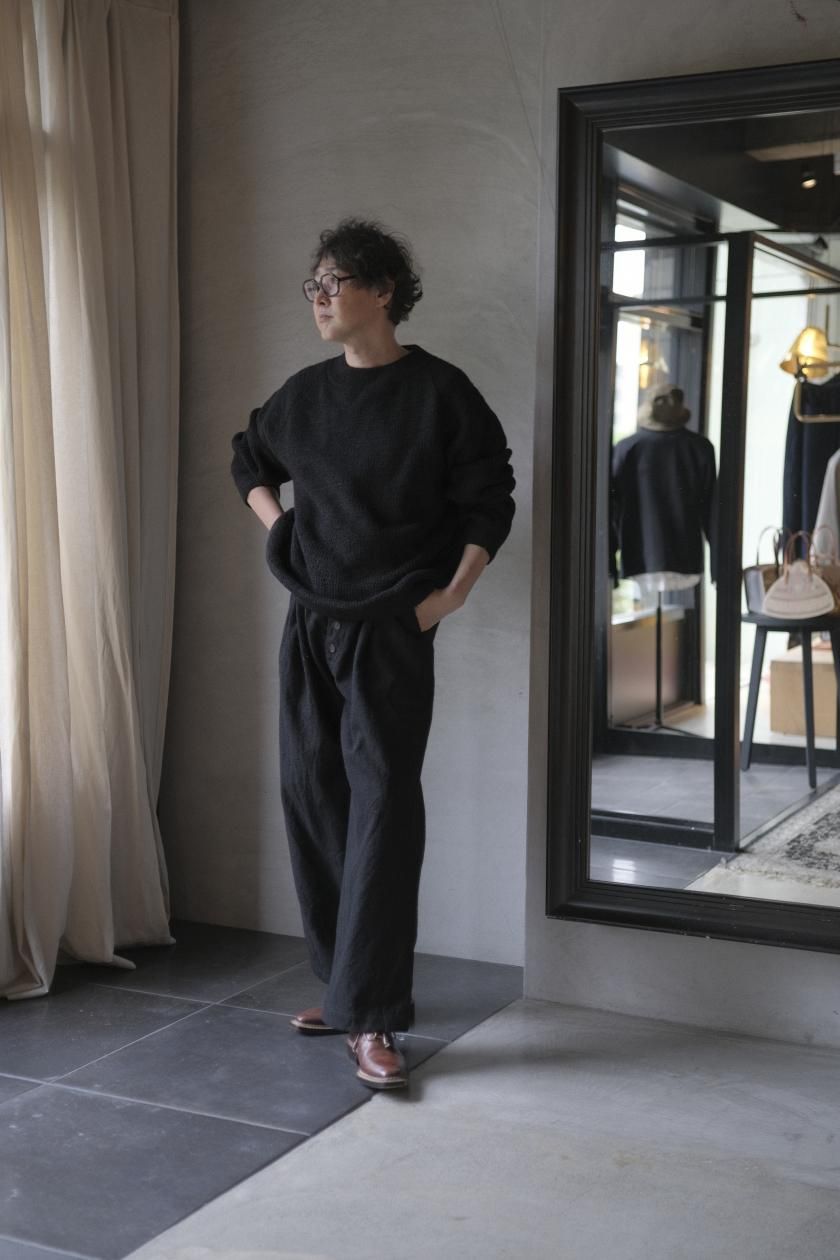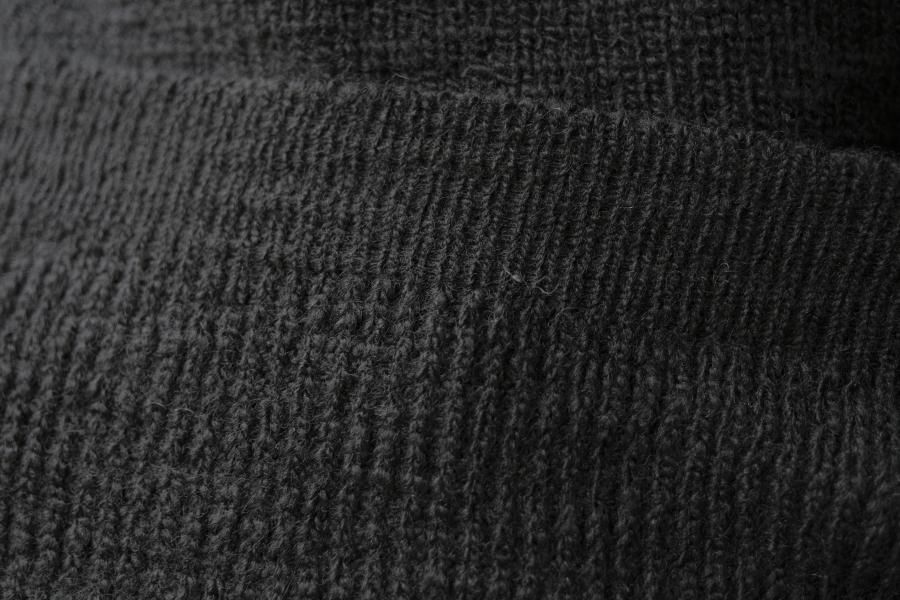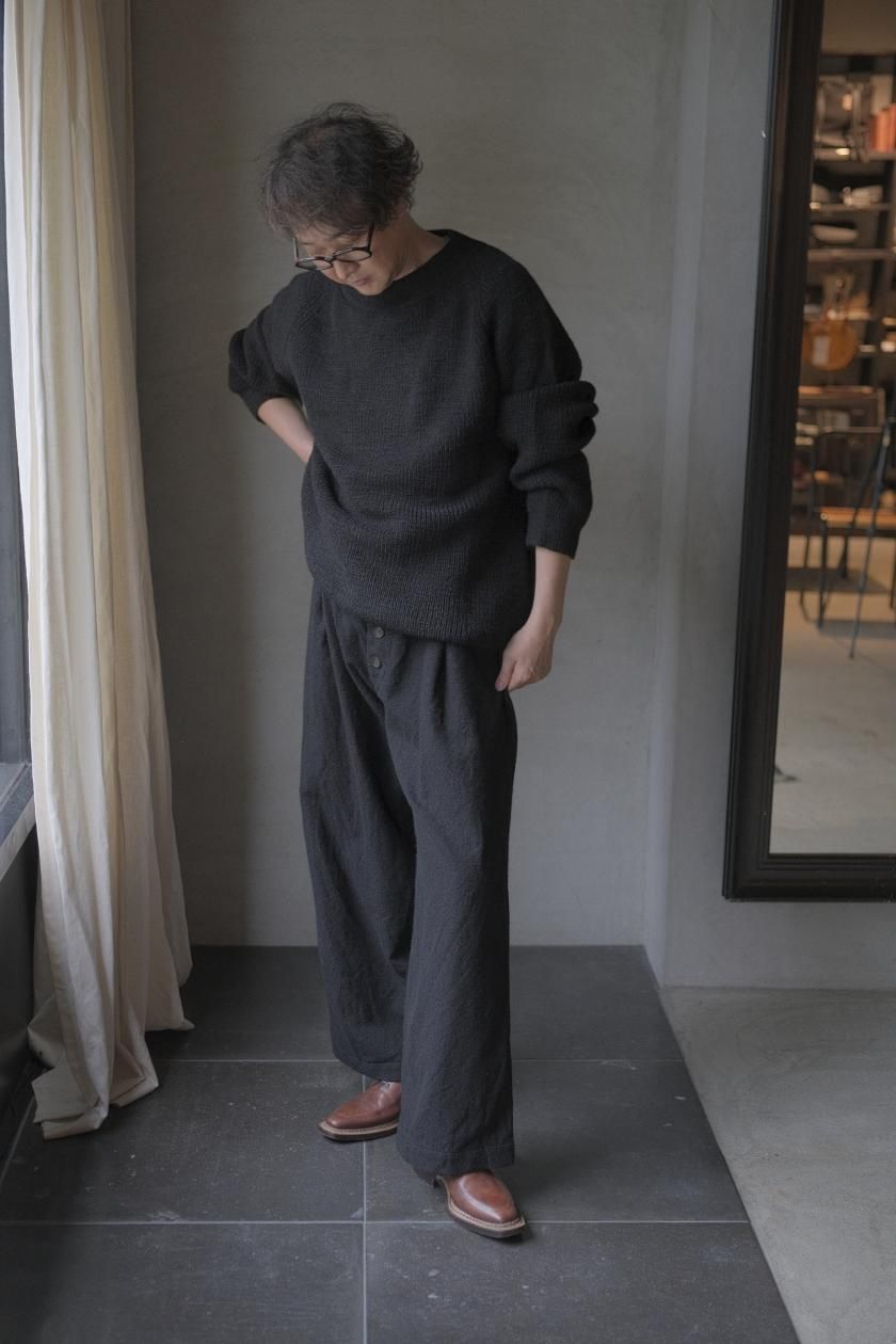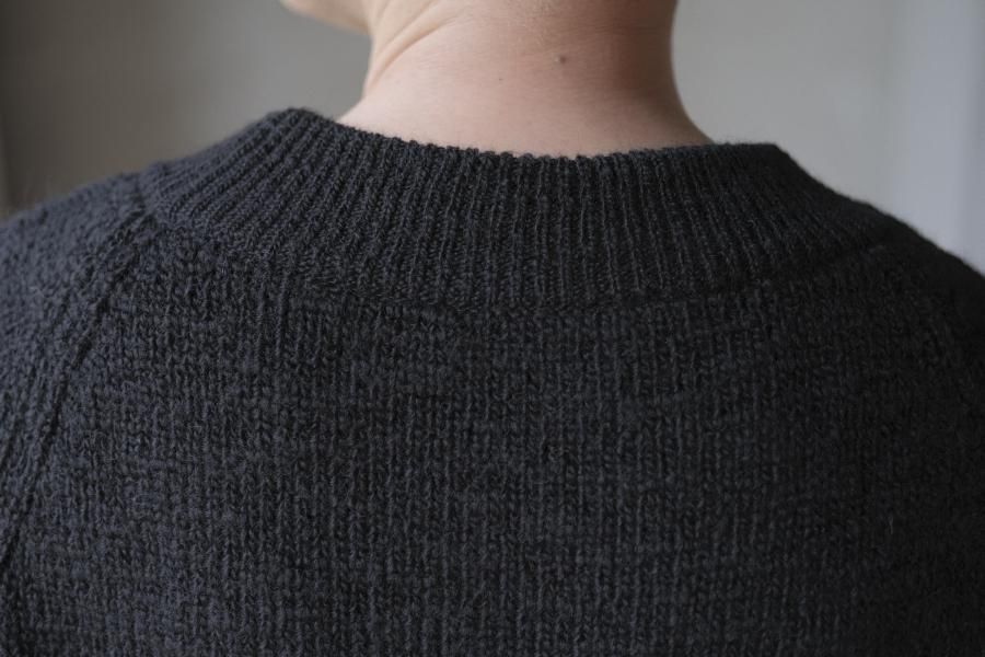 畦編み特有の立体的なボリュームを活かした、身幅にゆとりをもたせたシルエットです。インナーとしてはもちろん、アウターとして中に厚手のレイヤリングをしても窮屈さを感じさせず、秋冬の着こなしに柔軟に対応します。日常の道具としての機能性を意識しています。