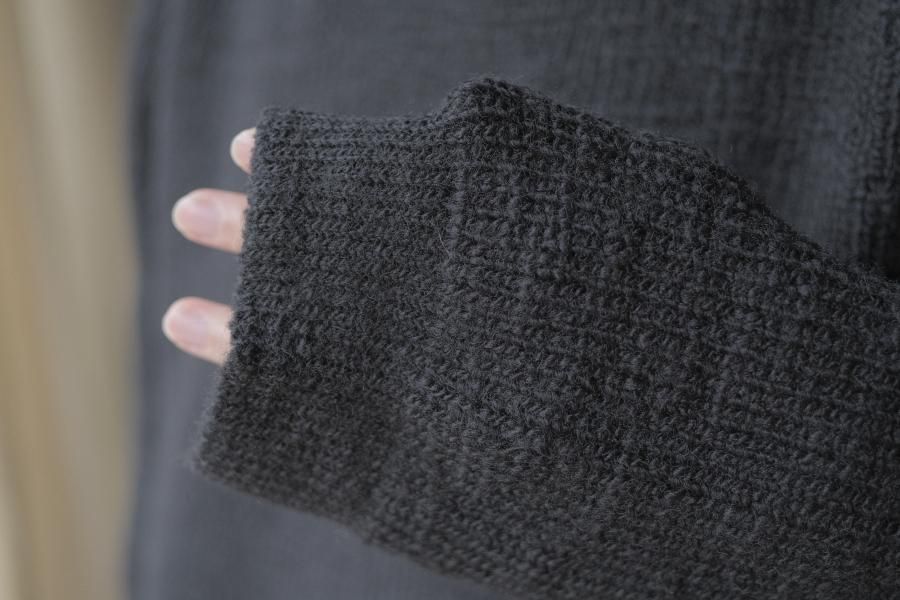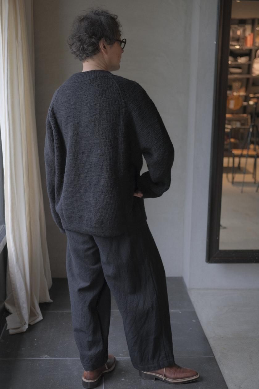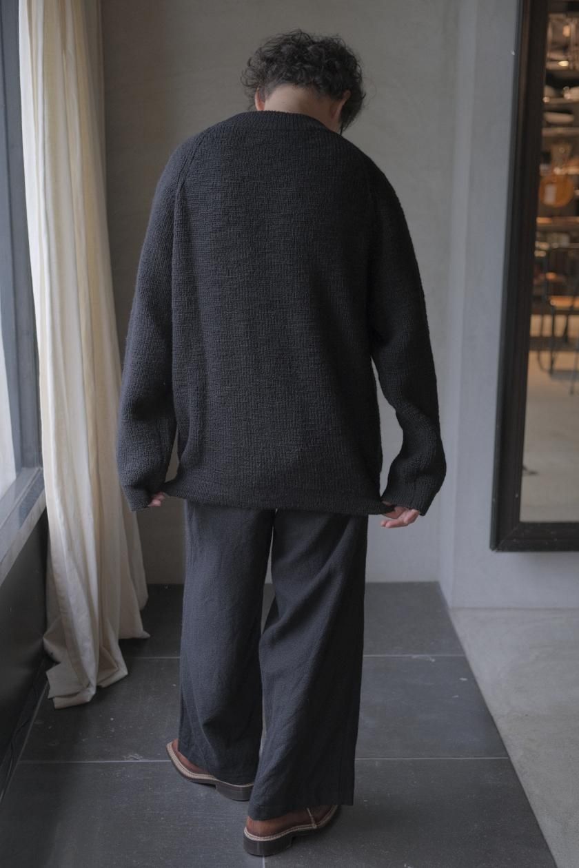 南米ウルグアイ産のノンミュールジングウールを太番手のスラブ糸に紡ぎ、リブ部分を除いて全体を畦編みで仕上げています。スラブ糸の嵩高性により、ざっくりとした表情ながら軽やかなボリュームを実現しています。ミュールジング(羊の臀部の皺に病原虫が付着するのを防ぐため、無麻酔で皮膚や肉の一部を切除する行為)を行わない原料を採用し、羊への負担を軽減しています。