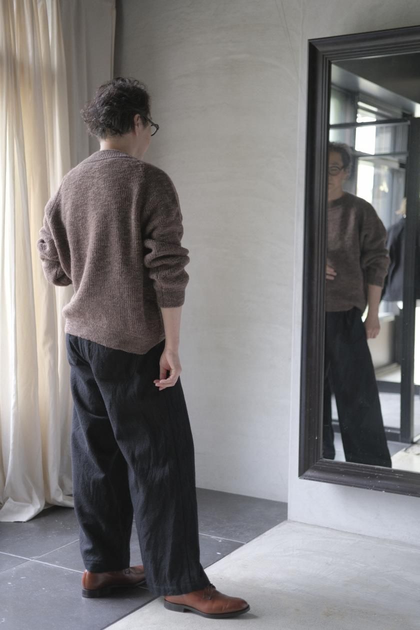 畦編み特有の立体的なボリュームを活かした、身幅にゆとりをもたせたシルエットです。インナーとしてはもちろん、アウターとして中に厚手のレイヤリングをしても窮屈さを感じさせず、秋冬の着こなしに柔軟に対応します。日常の道具としての機能性を意識しています。