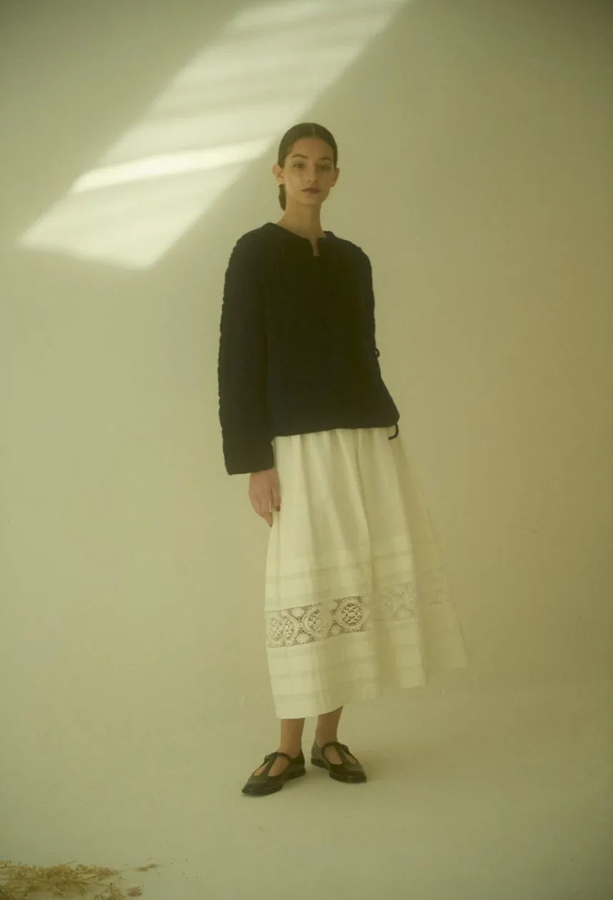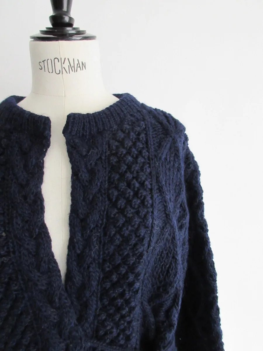 柔らかな肌触りの手紡ぎのアルパカ混糸を使用し 、オリジナルのアラン柄で編み上げています。