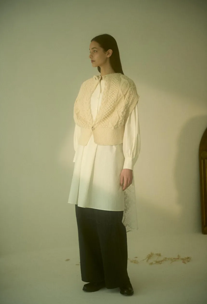 衿ぐりを後ろにずらす事で、ショ ート丈のV明きベストとしても着て頂けます。
