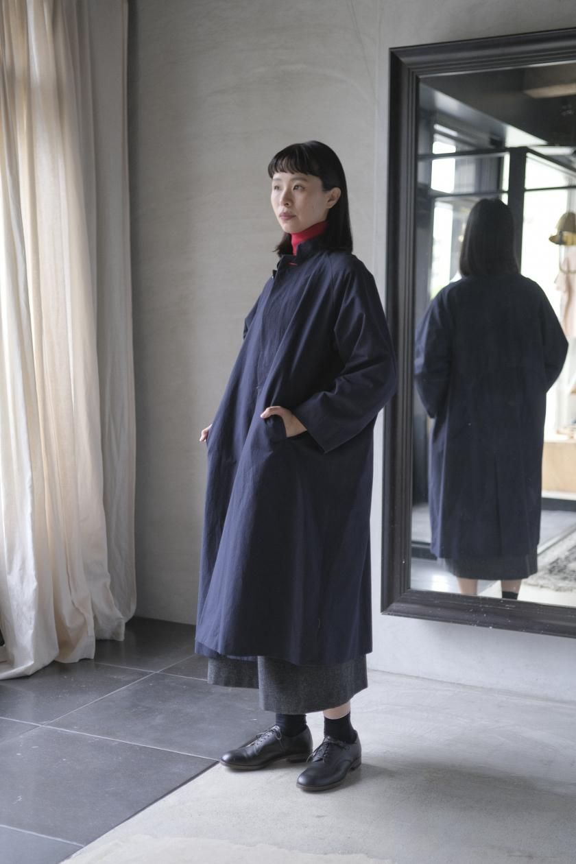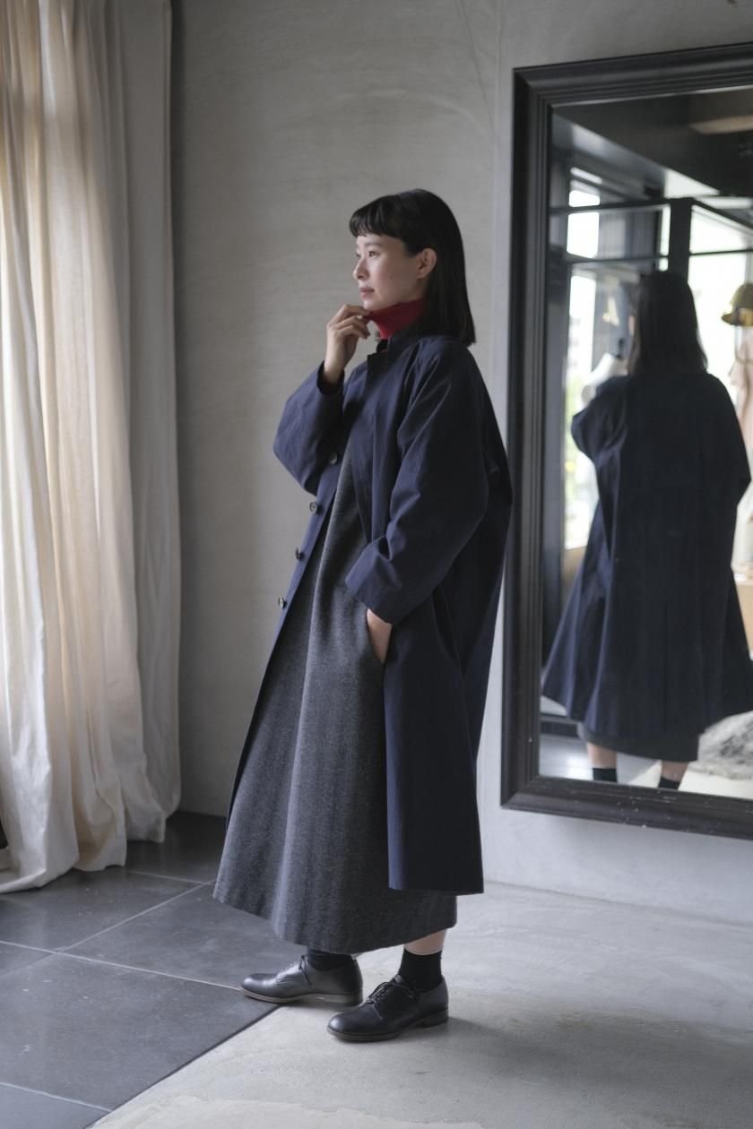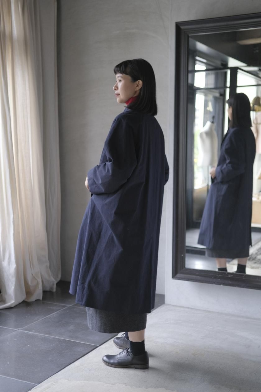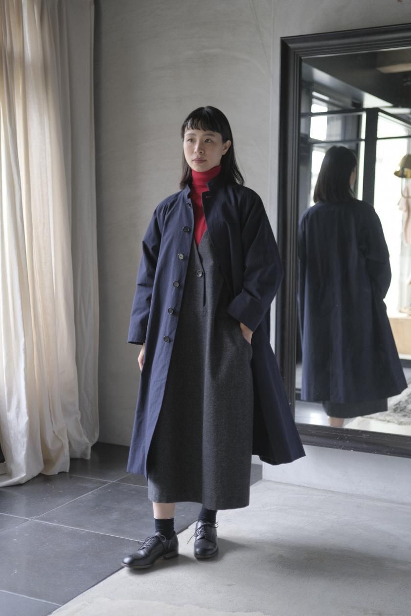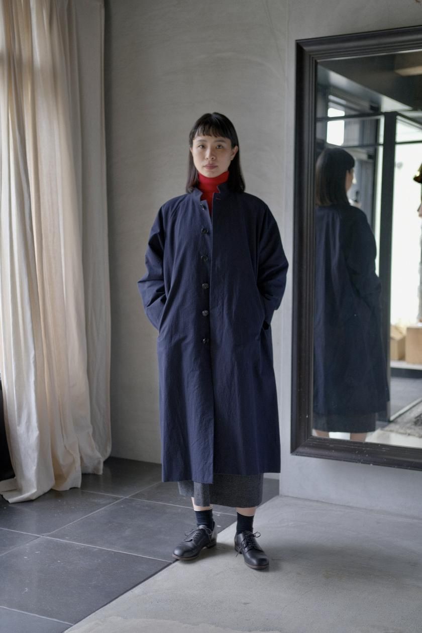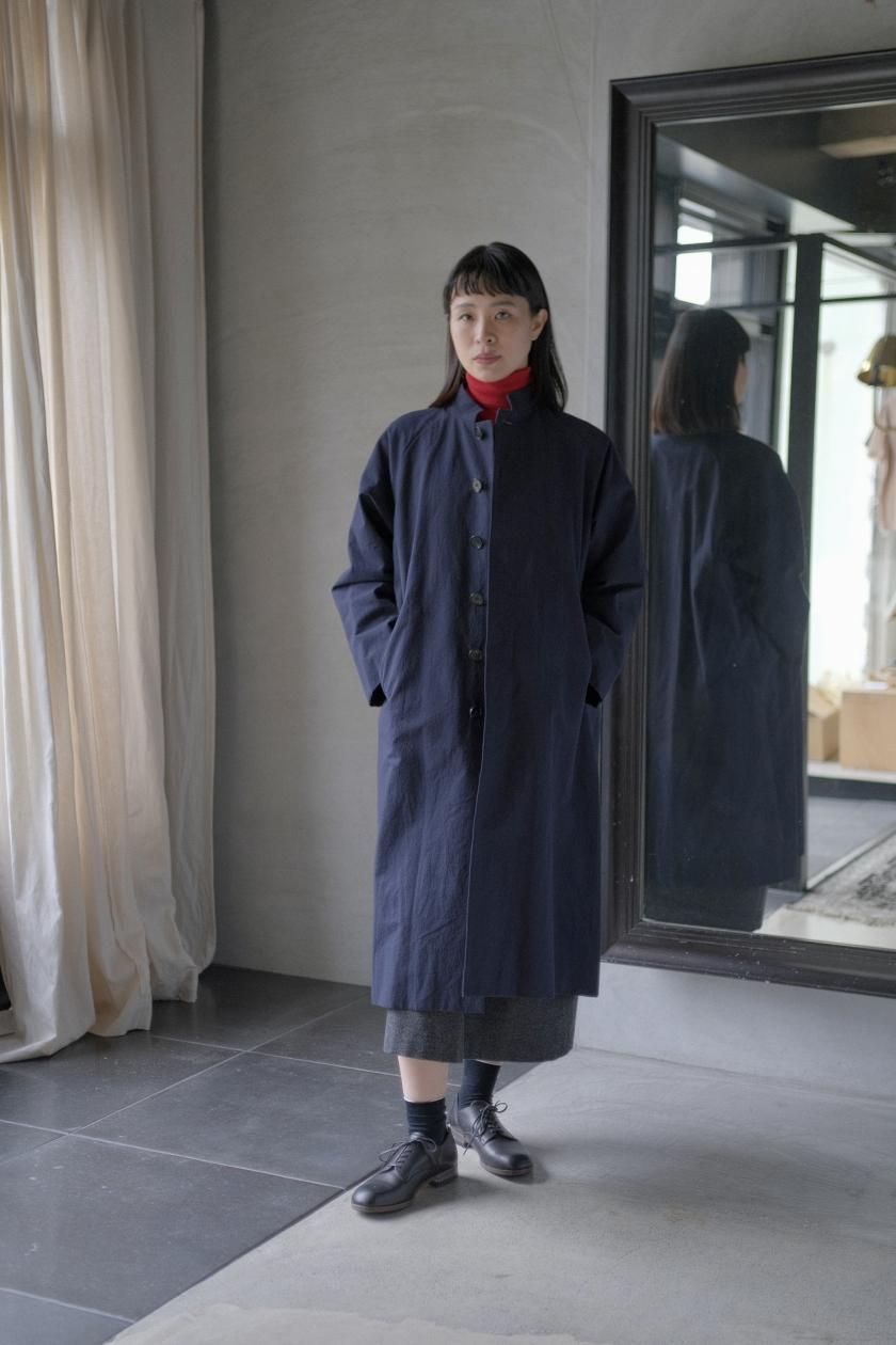 2022 a/wコレクションに初登場したコットンヘンプのスタンドカラーコート。2025 a/w は、新色「カーキ」が加わり、3色展開で登場します。