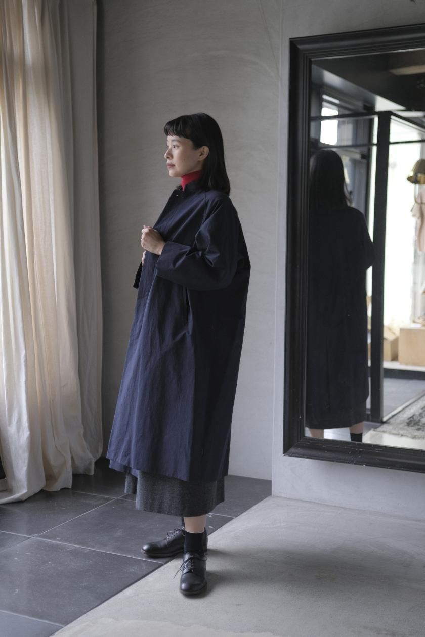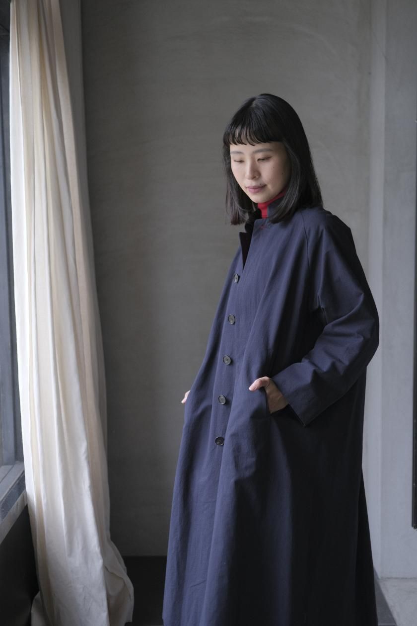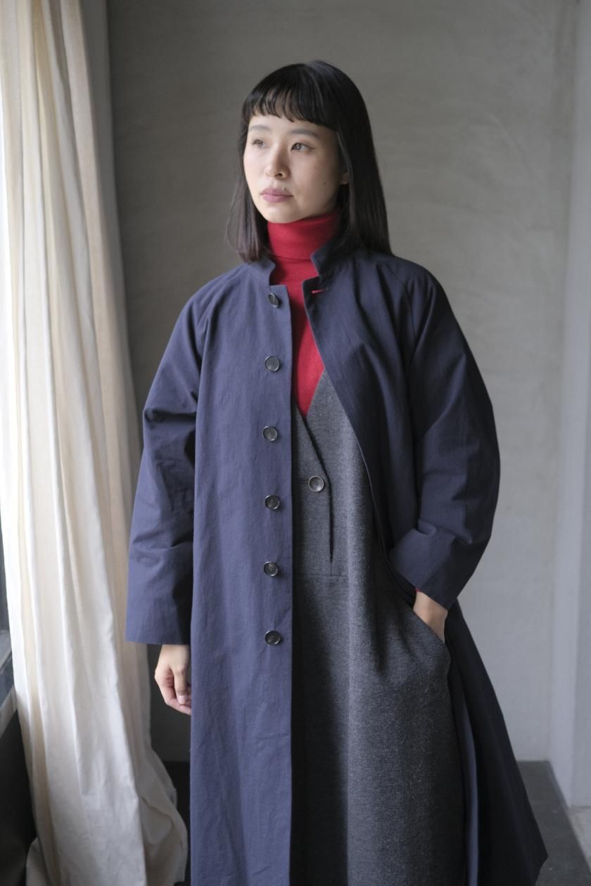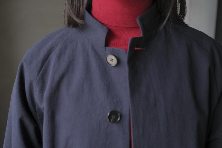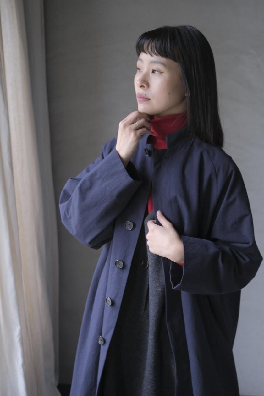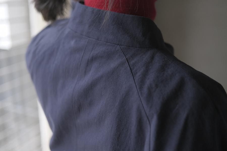 2022 a/wコレクションに初登場したコットンヘンプのスタンドカラーコート。2025 a/w は、新色「カーキ」が加わり、3色展開で登場します。