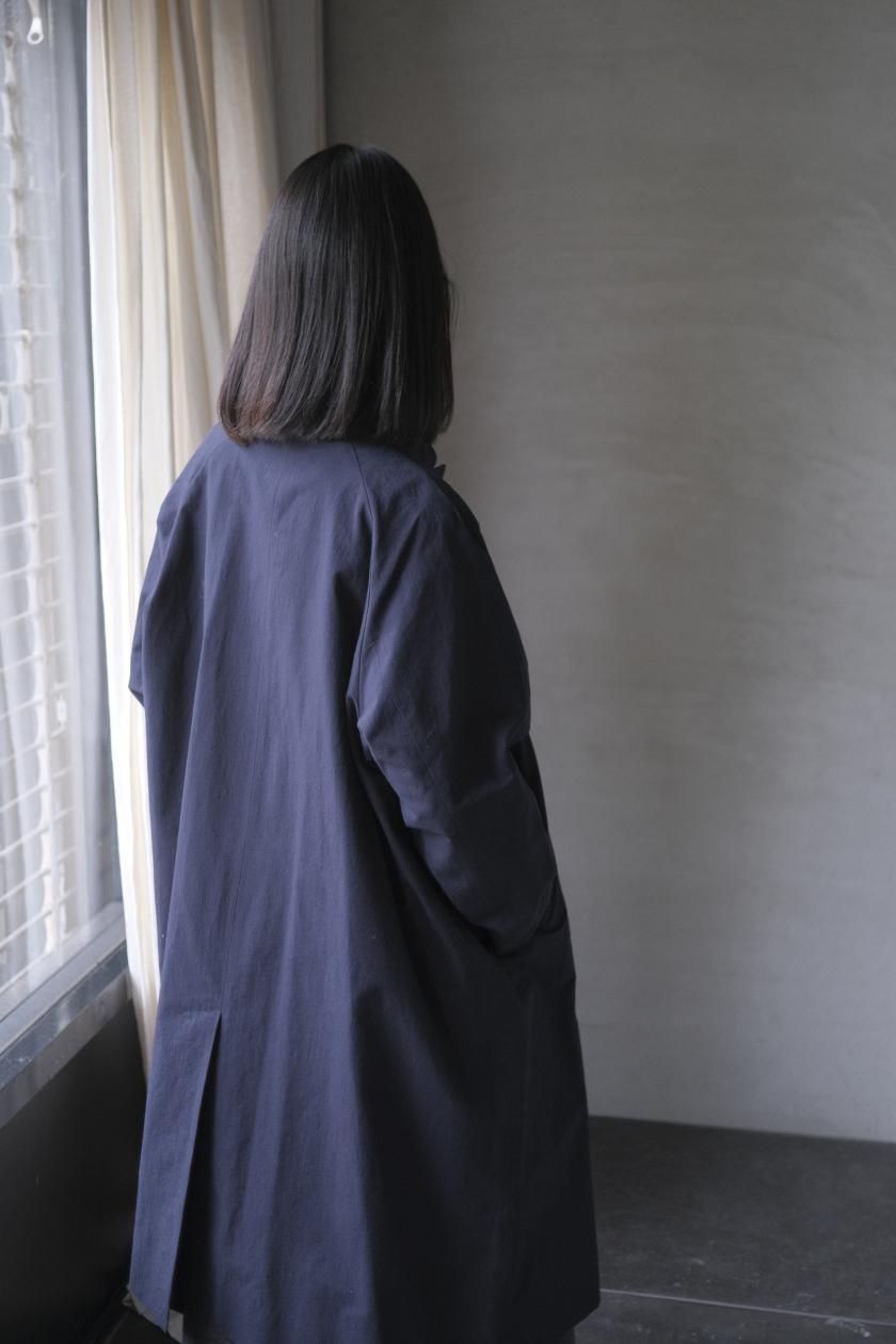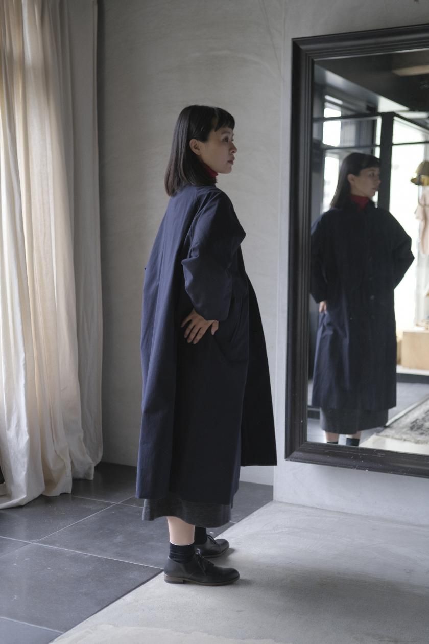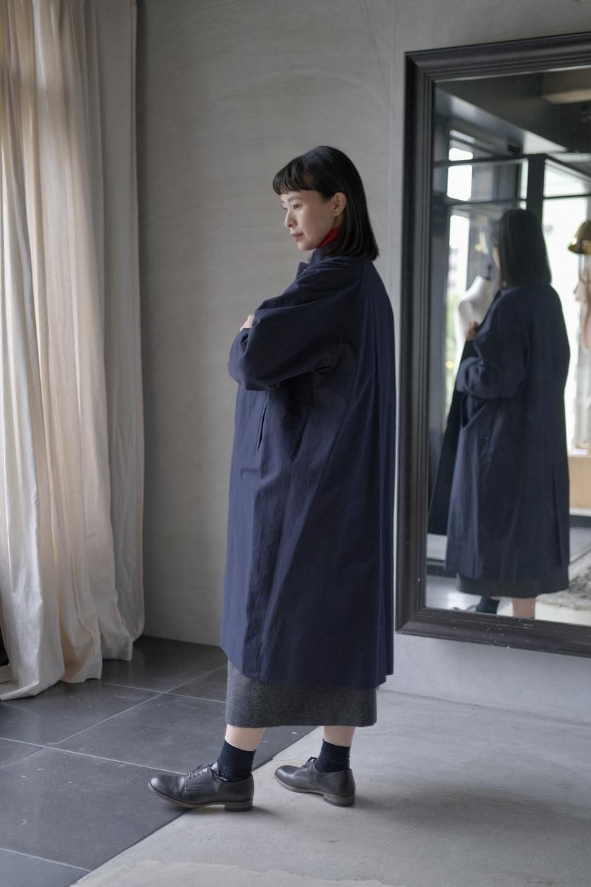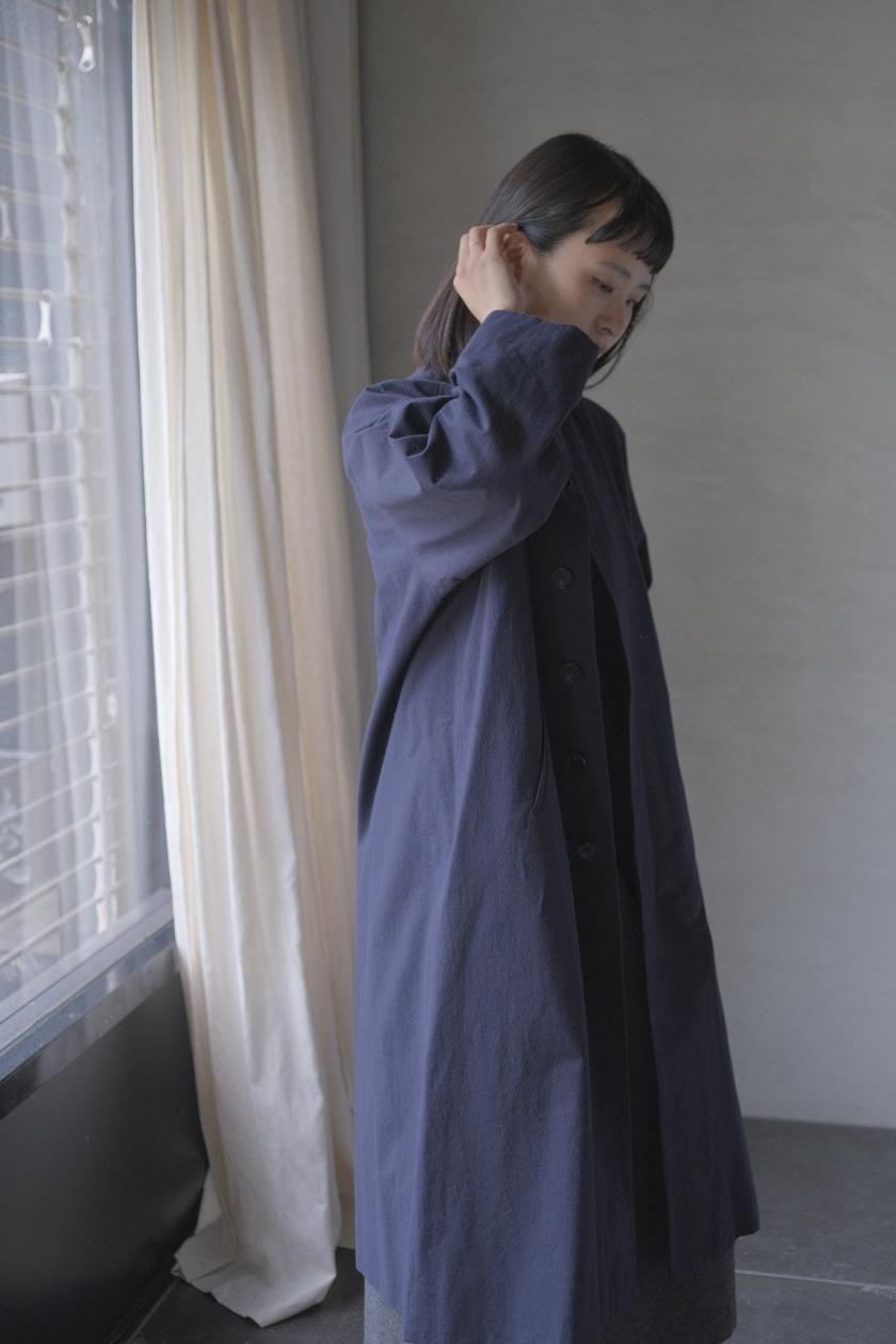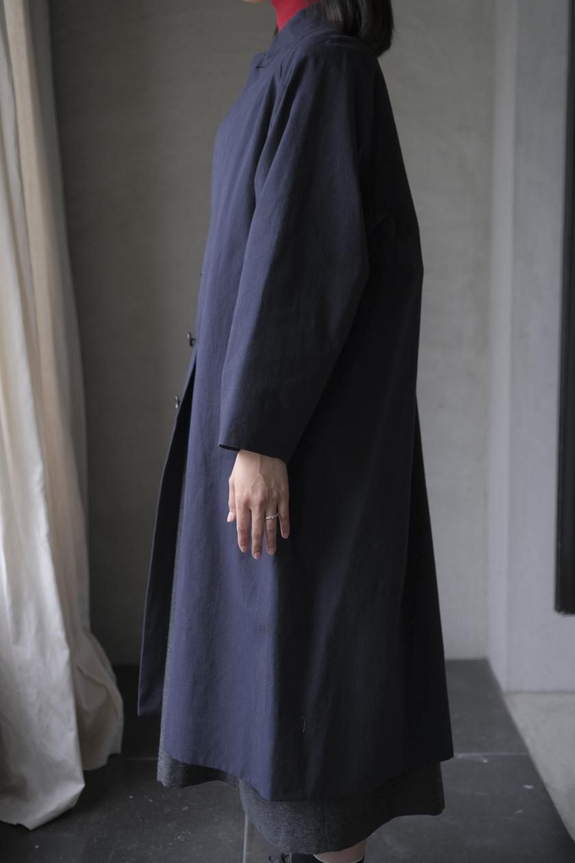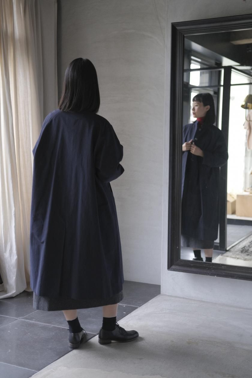 2022 a/wコレクションに初登場したコットンヘンプのスタンドカラーコート。2025 a/w は、新色「カーキ」が加わり、3色展開で登場します。