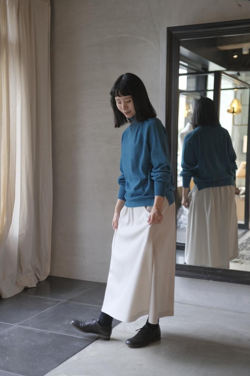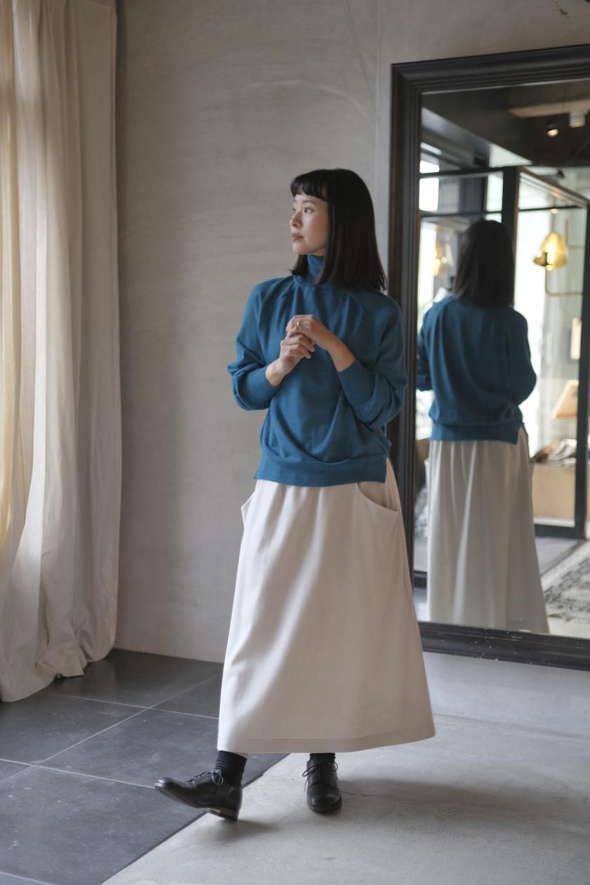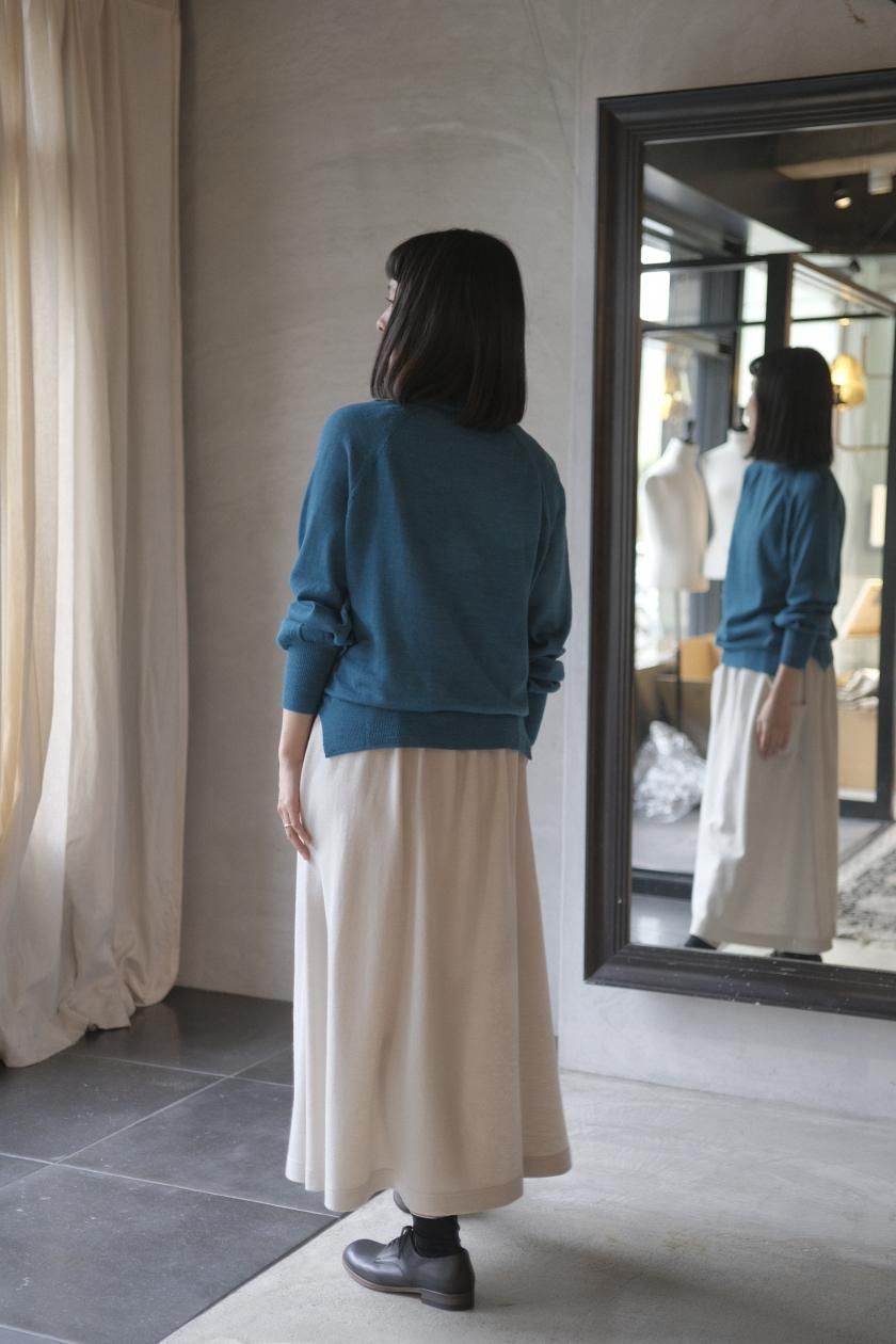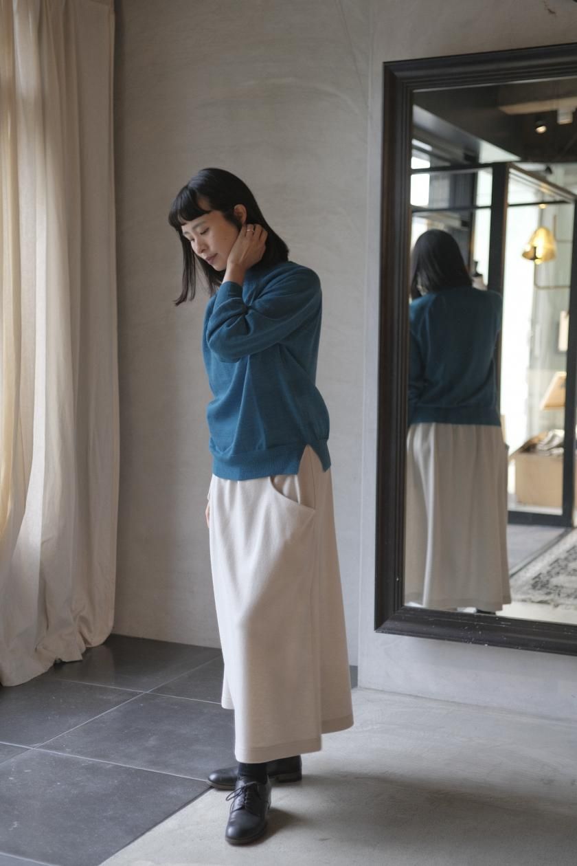 ネックはリブ幅や伸縮性、折り返したときのシルエット。ボディはゆったりとしつつも、女性らしい品のあるサイズ感。裾のリブはしぼらず、まっすぐで洗練されたライン。袖口のリブは長めで、ギャザーをよせて女性らしく、かわいらしく。