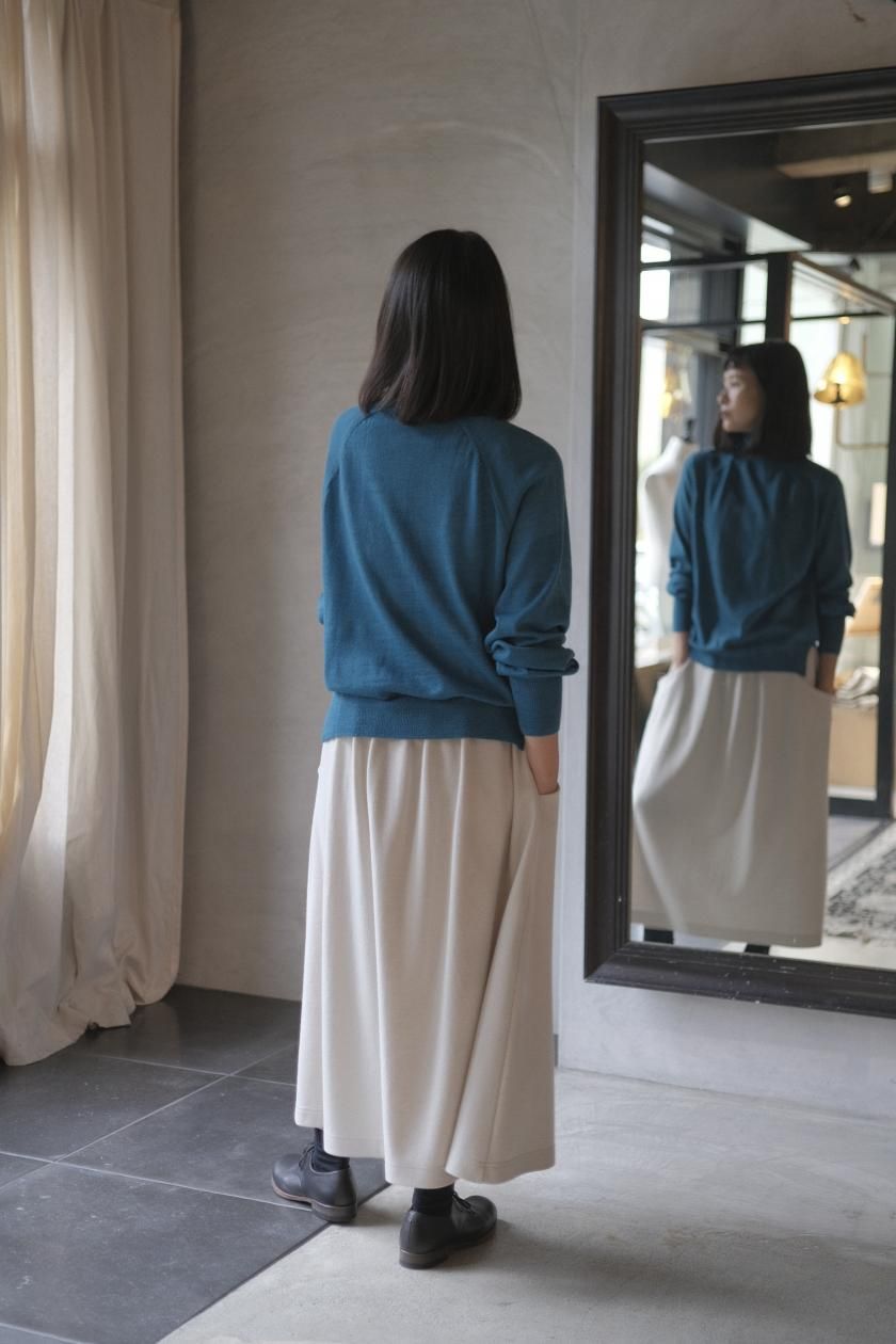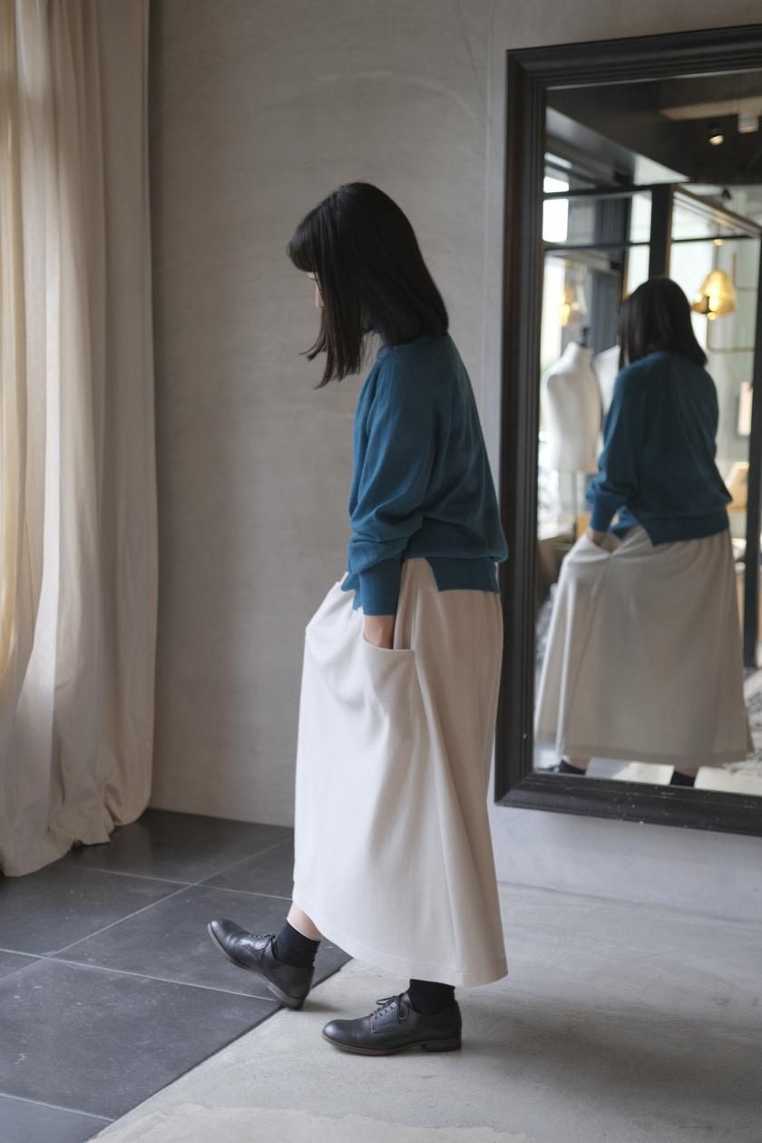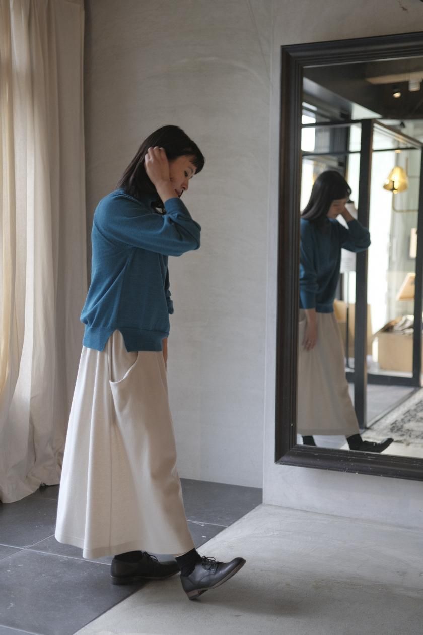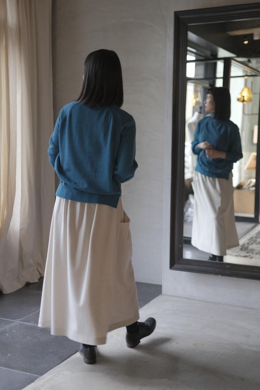 ネックはリブ幅や伸縮性、折り返したときのシルエット。ボディはゆったりとしつつも、女性らしい品のあるサイズ感。裾のリブはしぼらず、まっすぐで洗練されたライン。袖口のリブは長めで、ギャザーをよせて女性らしく、かわいらしく。