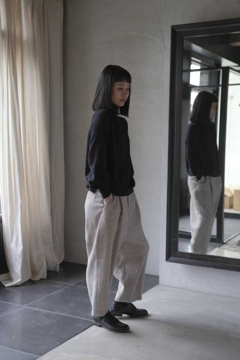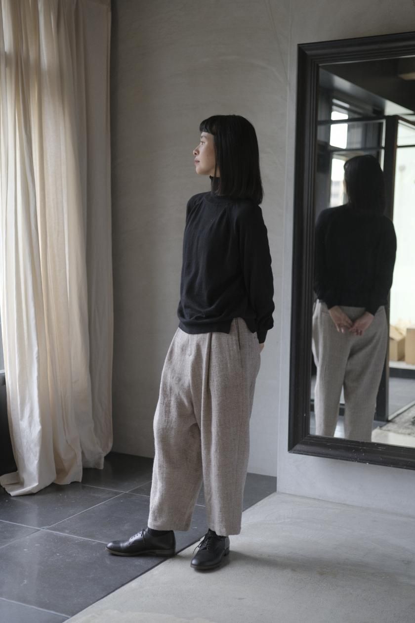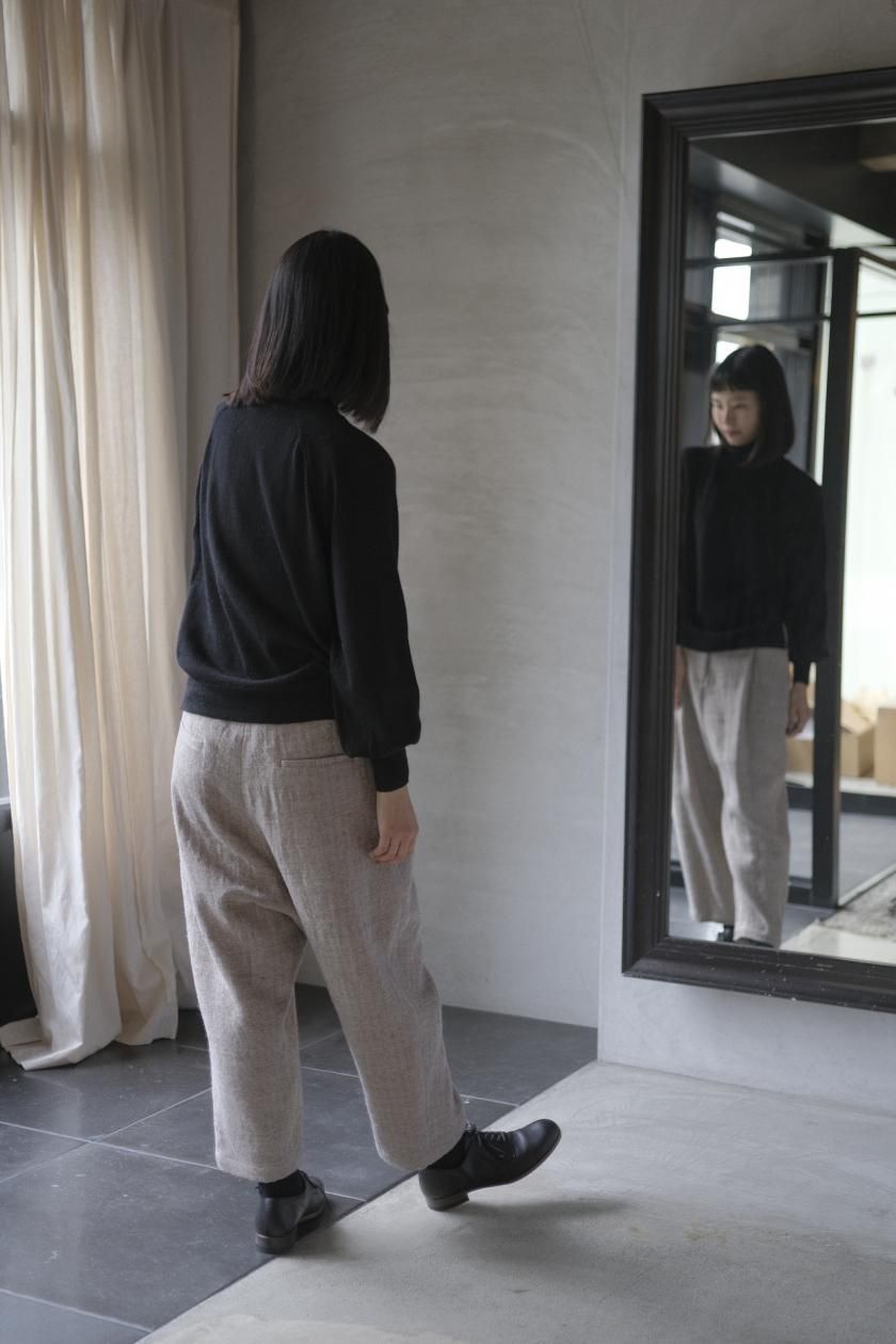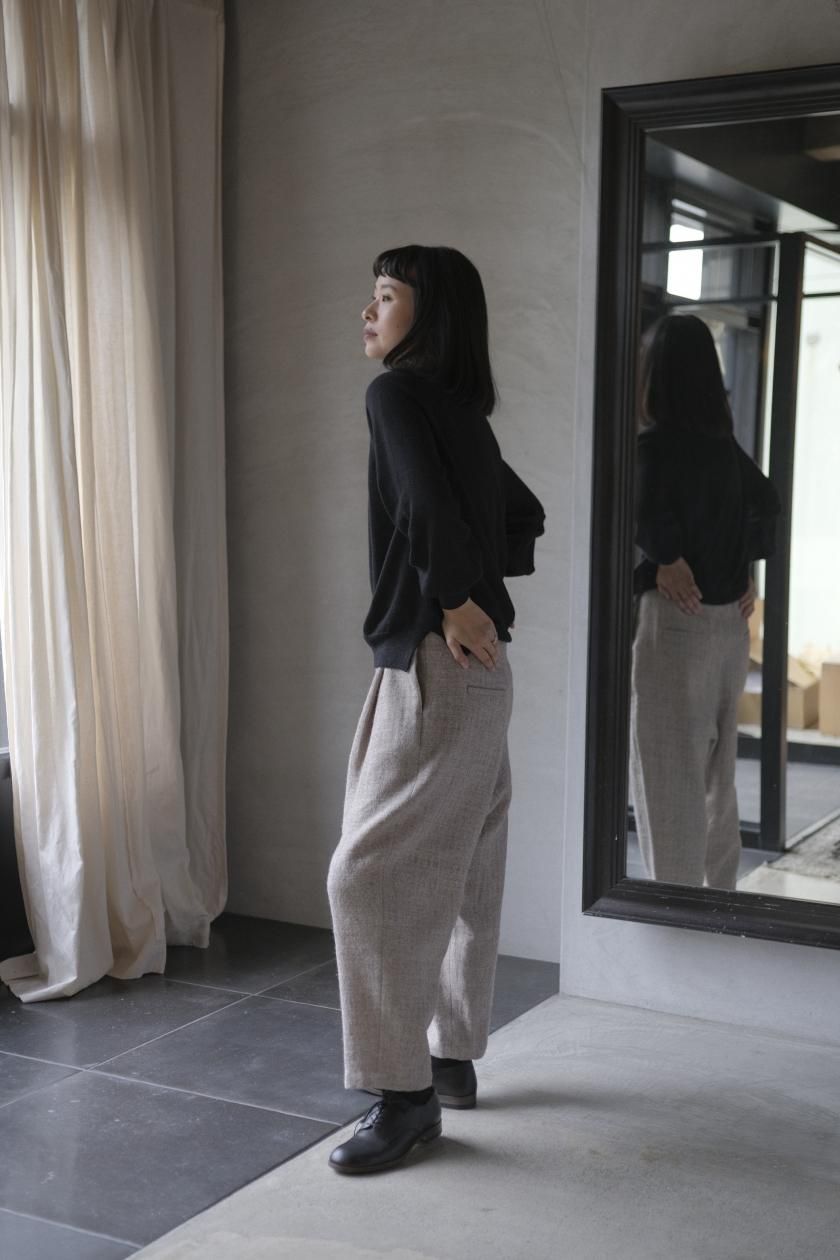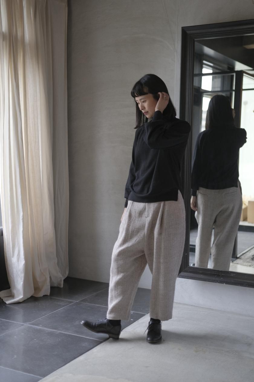 ネックはリブ幅や伸縮性、折り返したときのシルエット。ボディはゆったりとしつつも、女性らしい品のあるサイズ感。裾のリブはしぼらず、まっすぐで洗練されたライン。袖口のリブは長めで、ギャザーをよせて女性らしく、かわいらしく。
