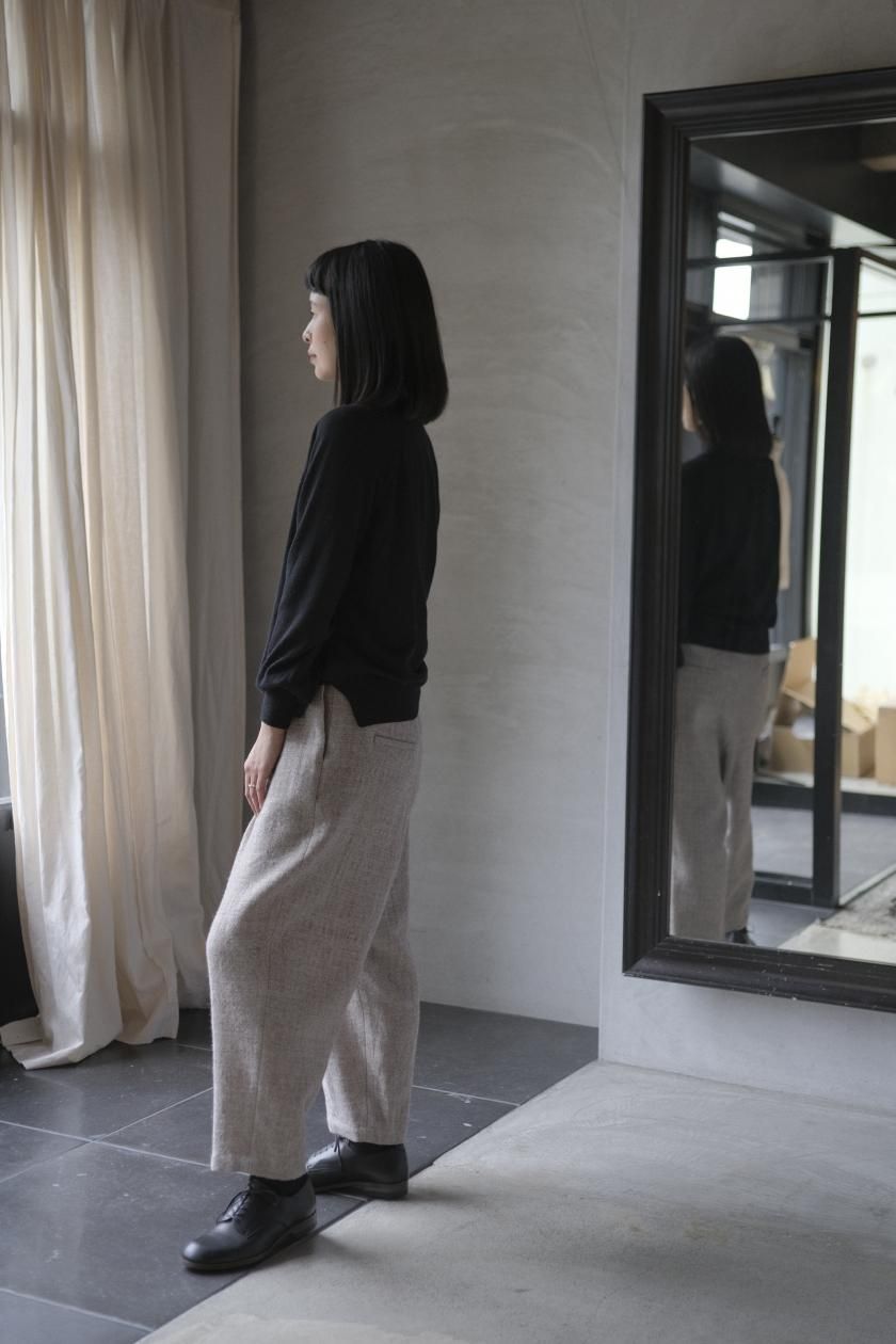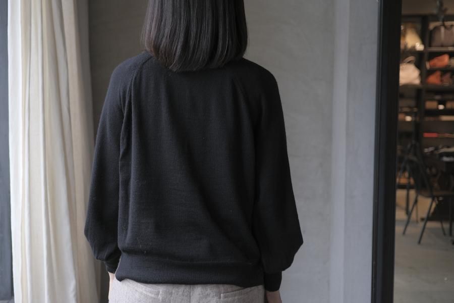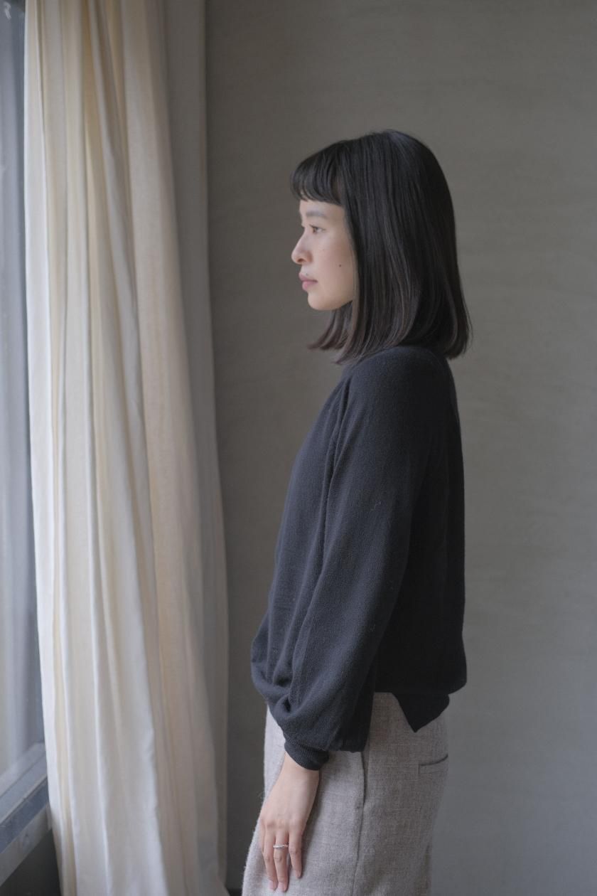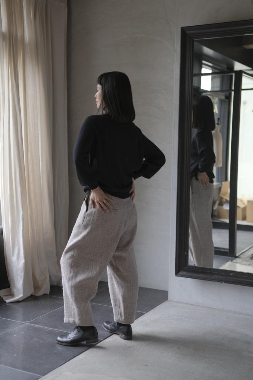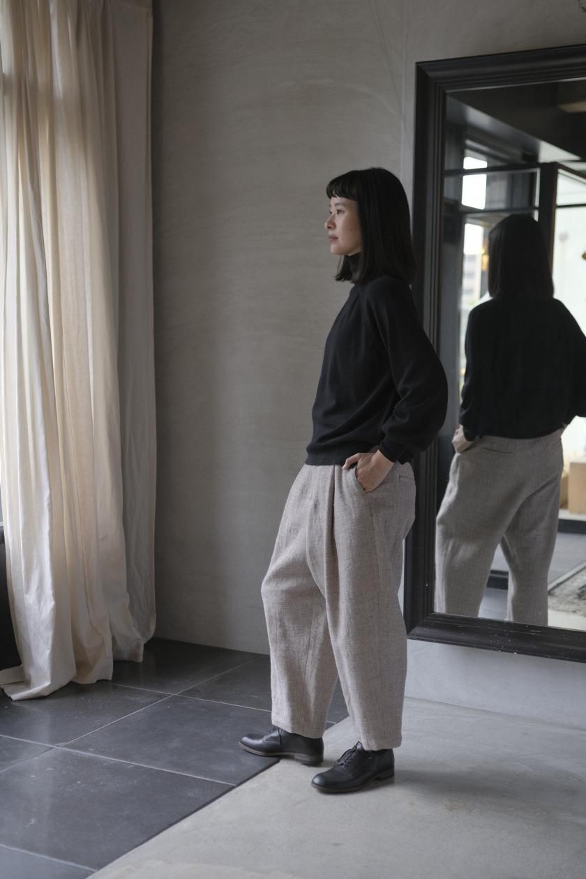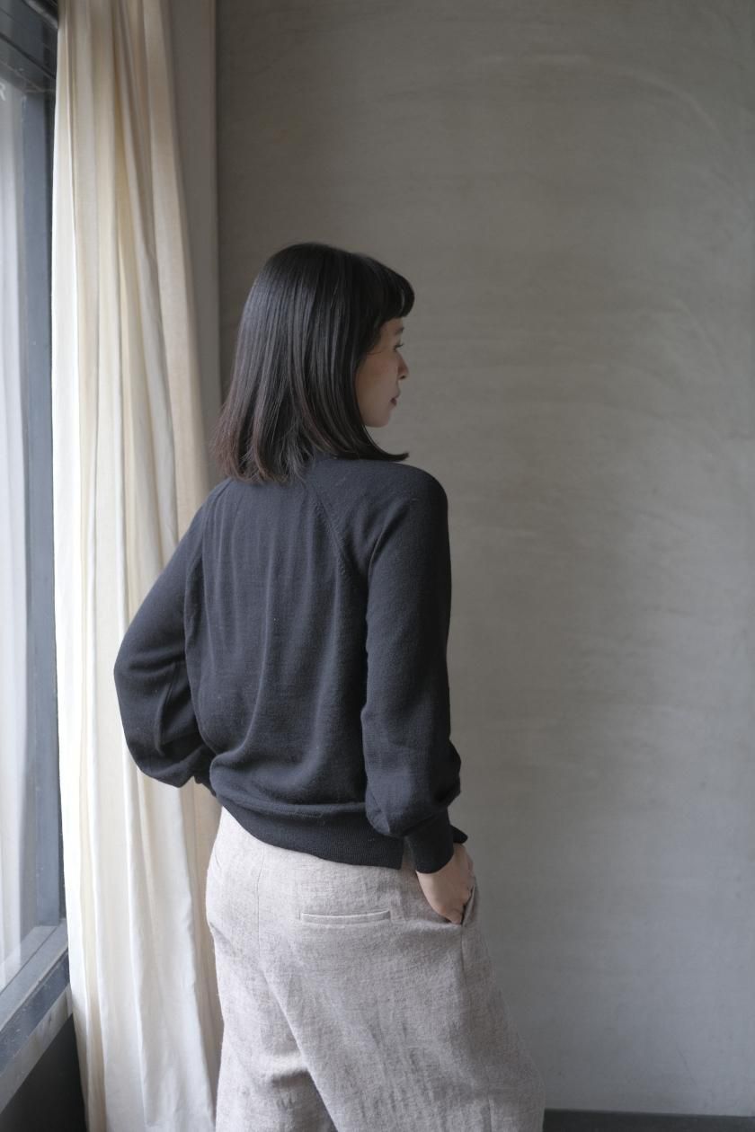 ネックはリブ幅や伸縮性、折り返したときのシルエット。ボディはゆったりとしつつも、女性らしい品のあるサイズ感。裾のリブはしぼらず、まっすぐで洗練されたライン。袖口のリブは長めで、ギャザーをよせて女性らしく、かわいらしく。