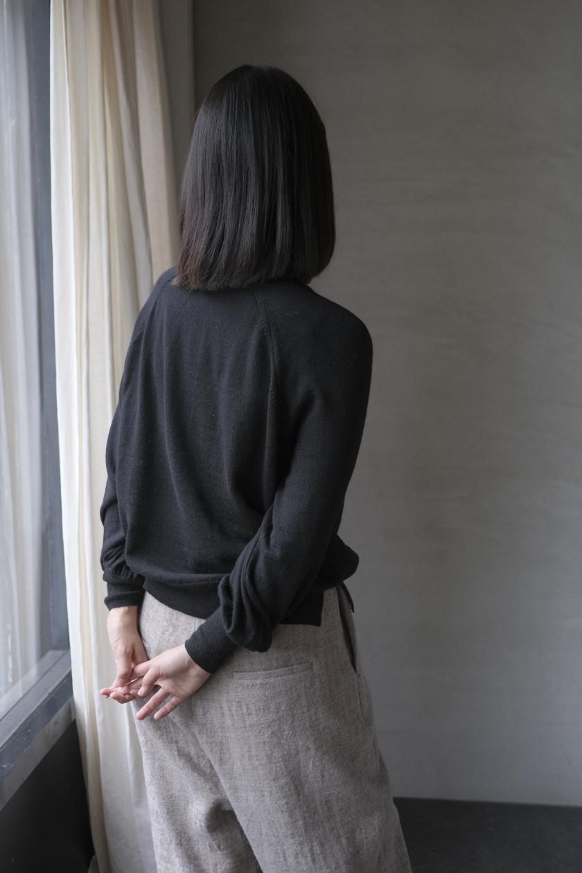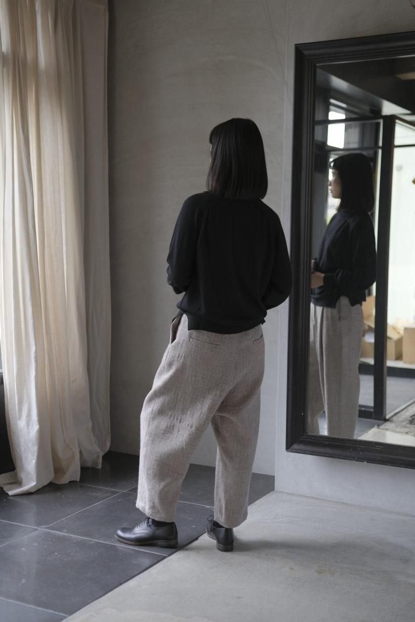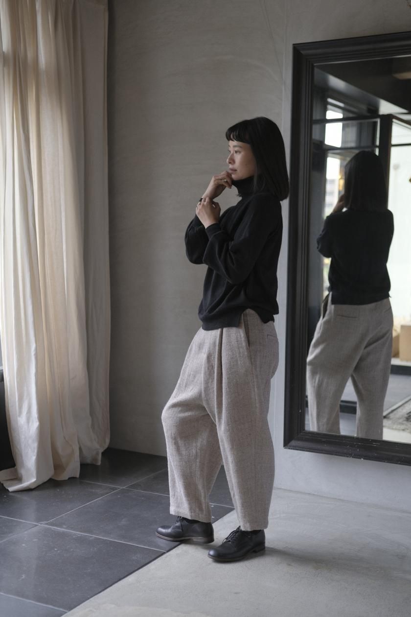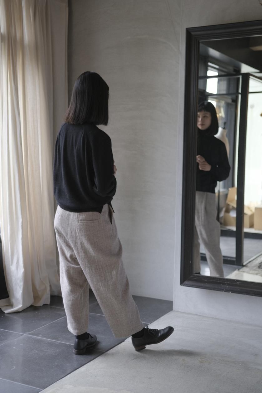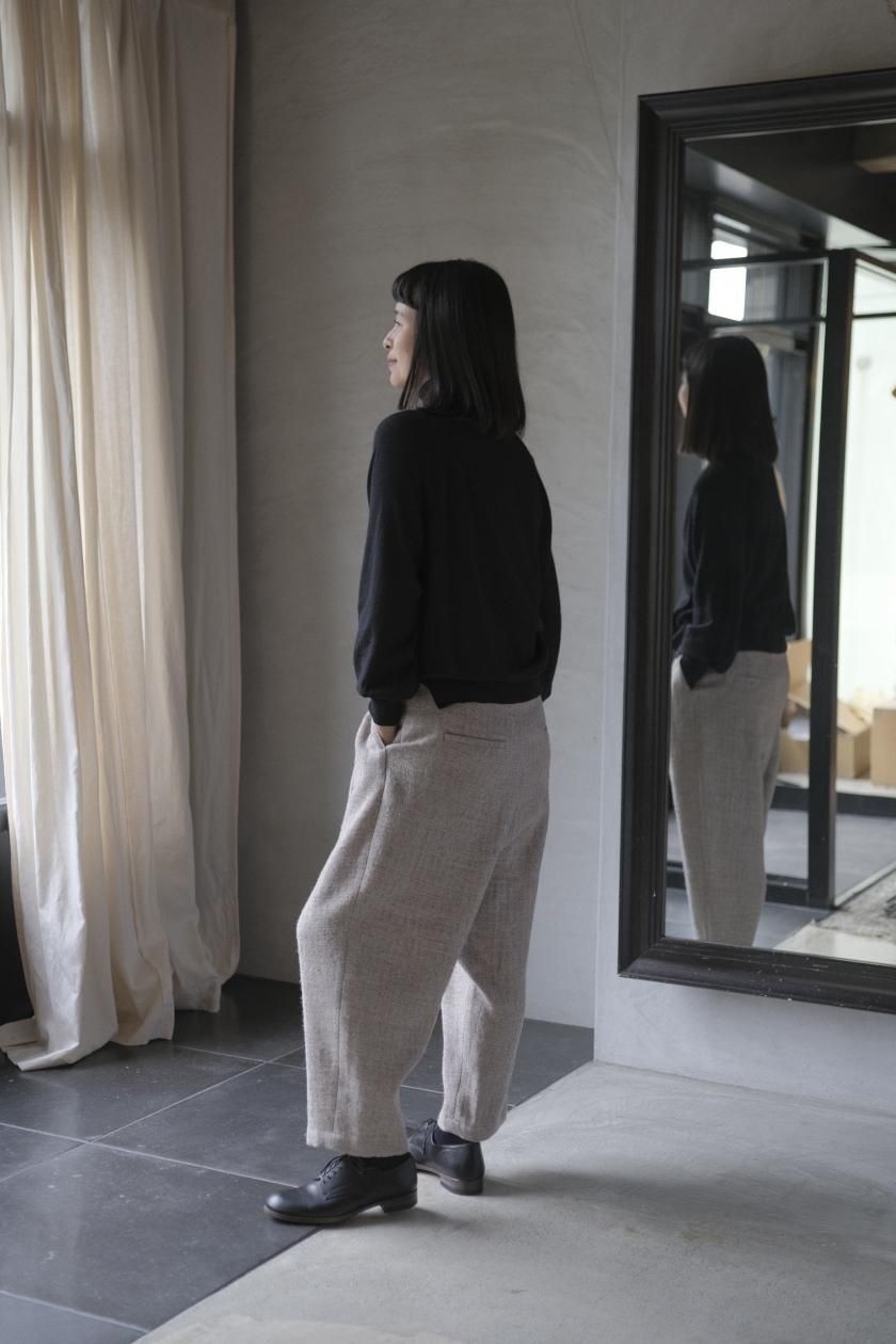 ネックはリブ幅や伸縮性、折り返したときのシルエット。ボディはゆったりとしつつも、女性らしい品のあるサイズ感。裾のリブはしぼらず、まっすぐで洗練されたライン。袖口のリブは長めで、ギャザーをよせて女性らしく、かわいらしく。