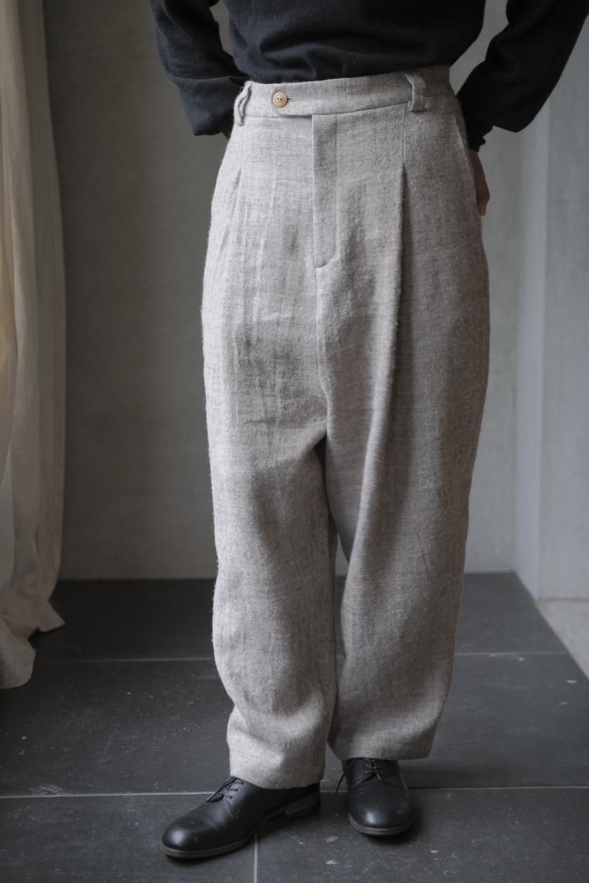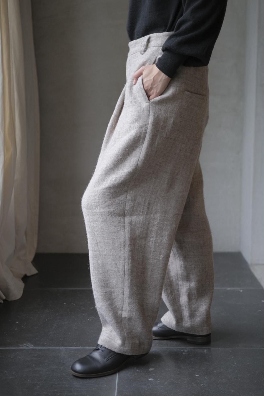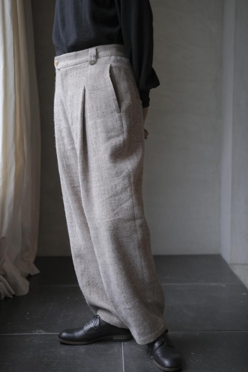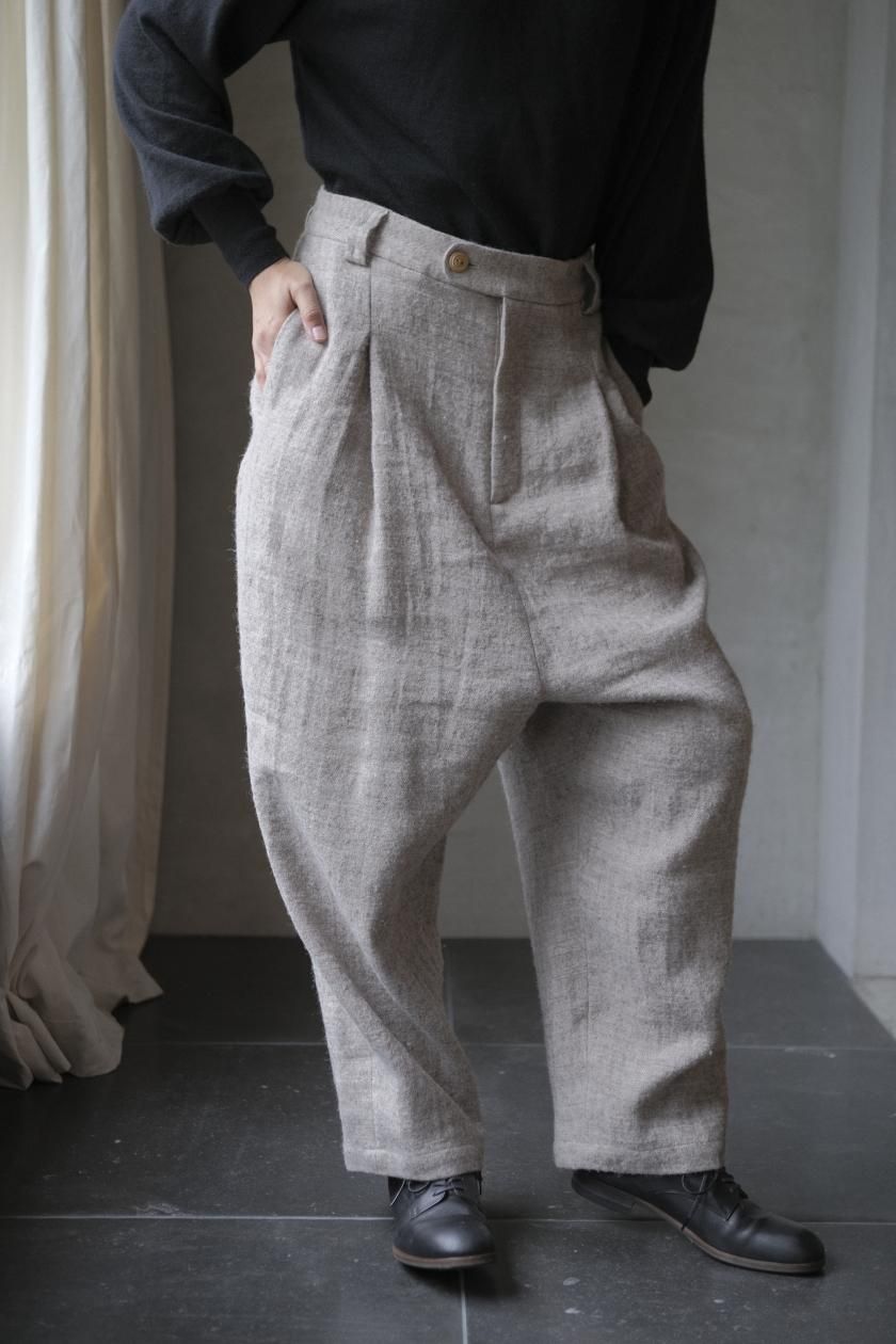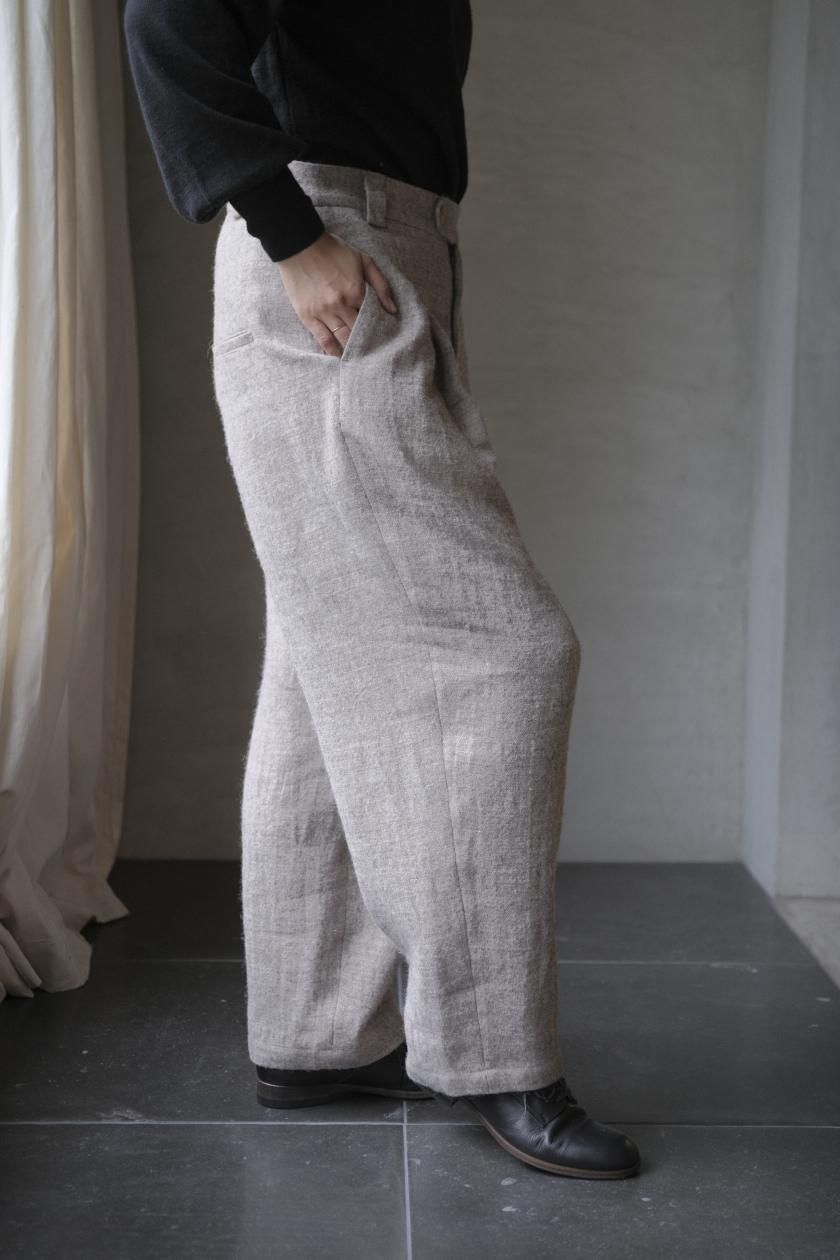 股上が長く、深めのタックが入った、ほどよいサルエル感があるタックワイドパンツを、ざっくりとしたナチュラルなルックスとふくらみのあるシェットランドウールリネンでつくりました。
