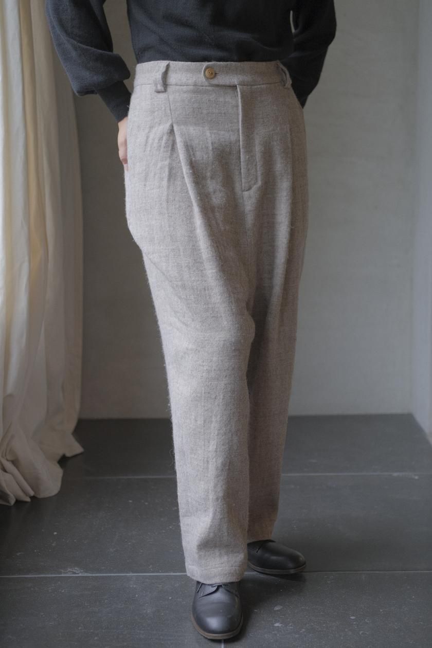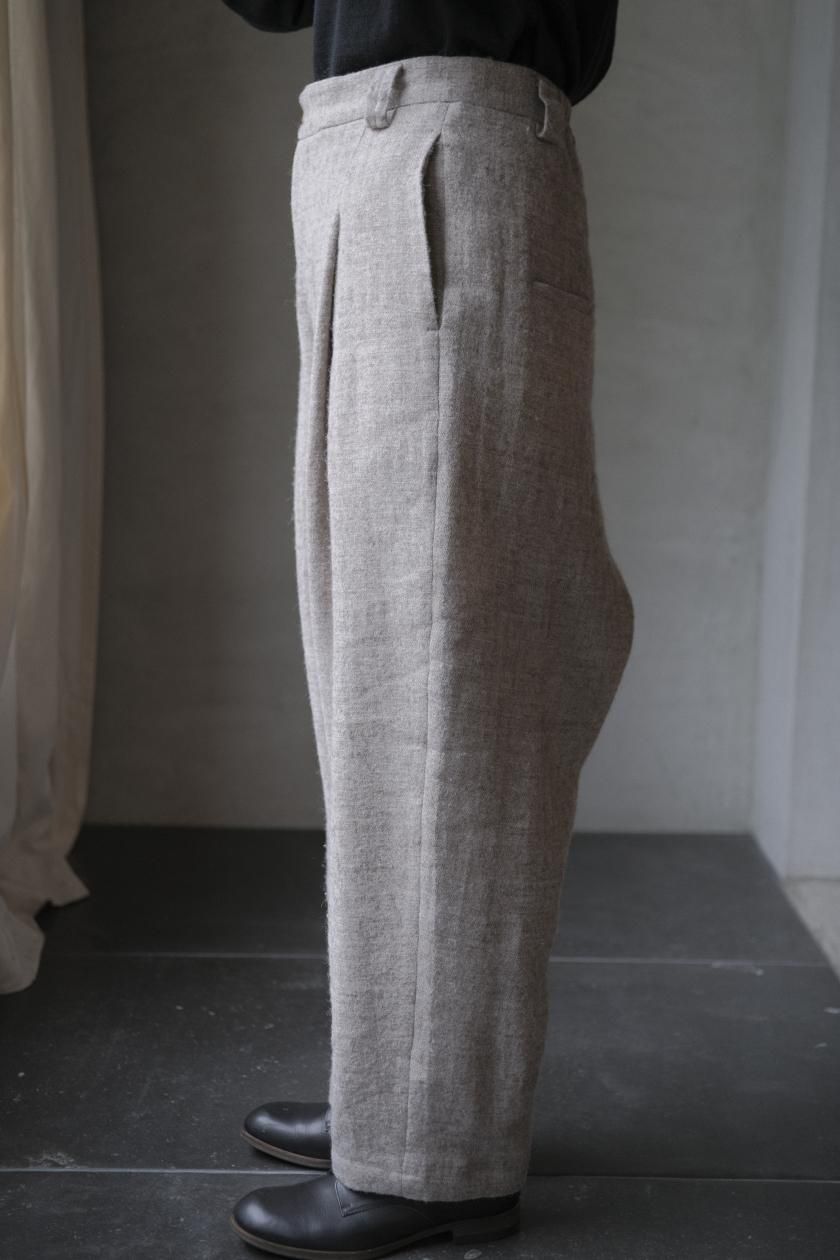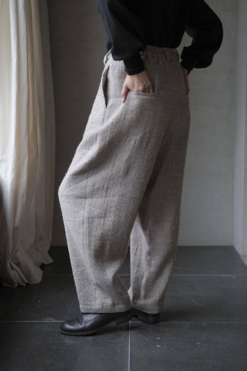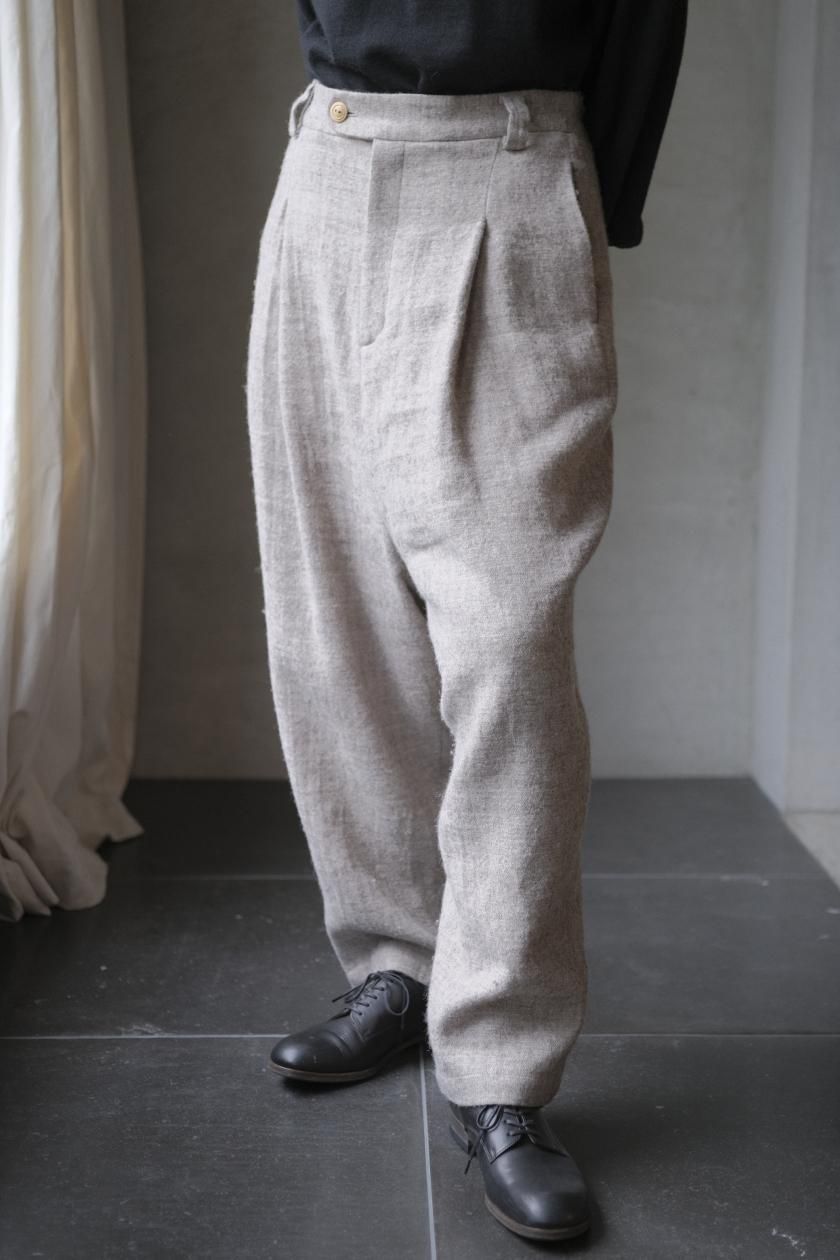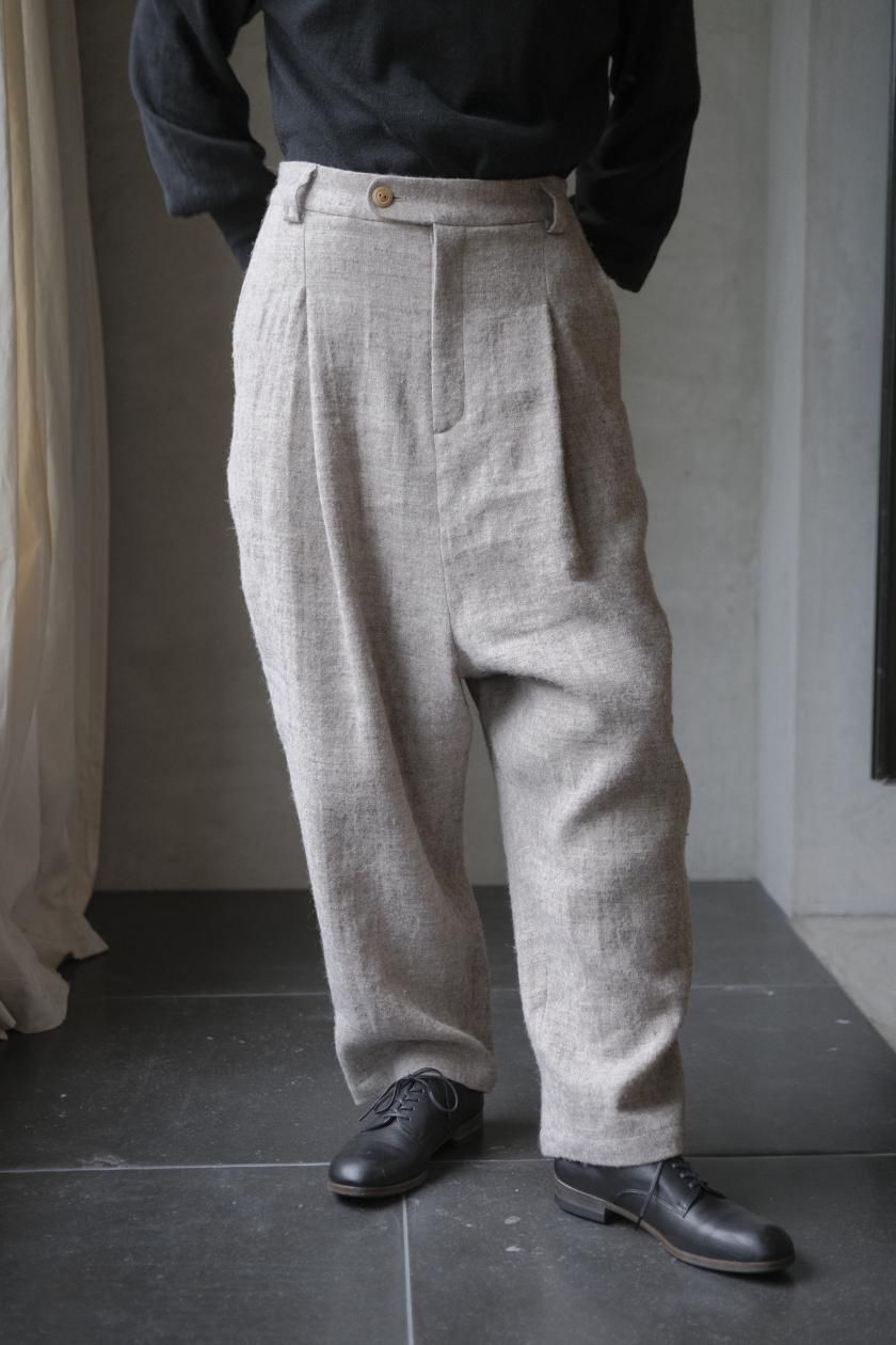 股上が長く、深めのタックが入った、ほどよいサルエル感があるタックワイドパンツを、ざっくりとしたナチュラルなルックスとふくらみのあるシェットランドウールリネンでつくりました。