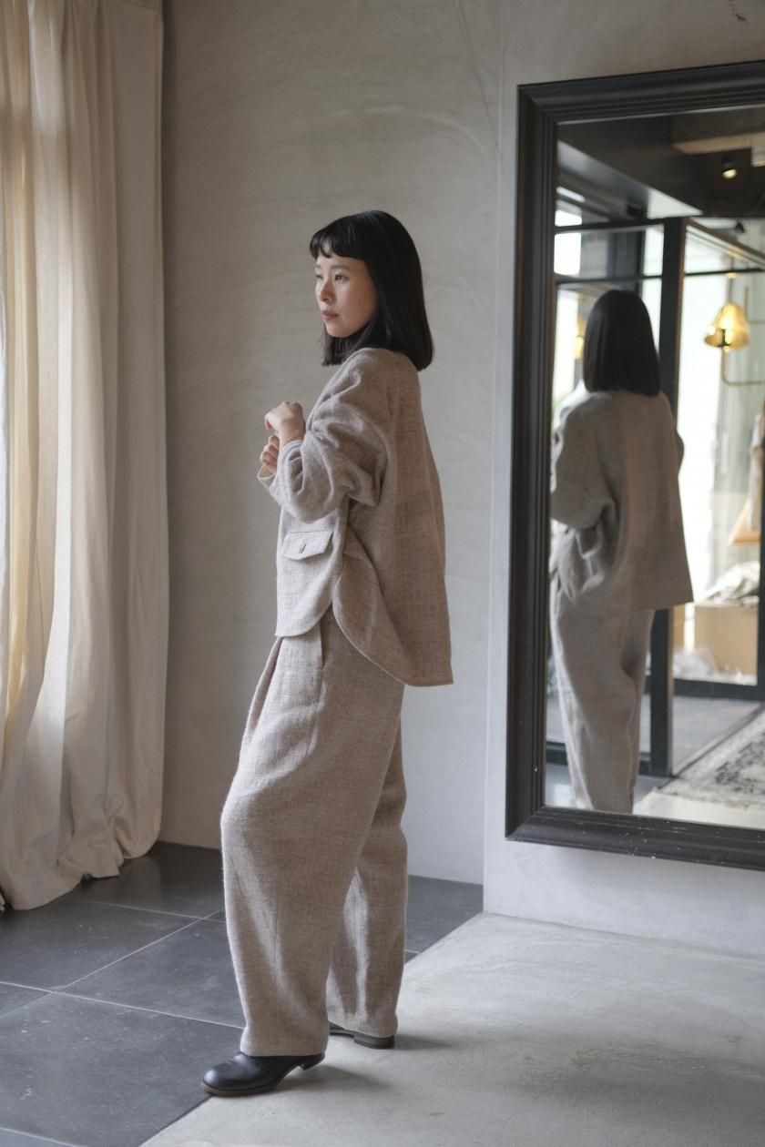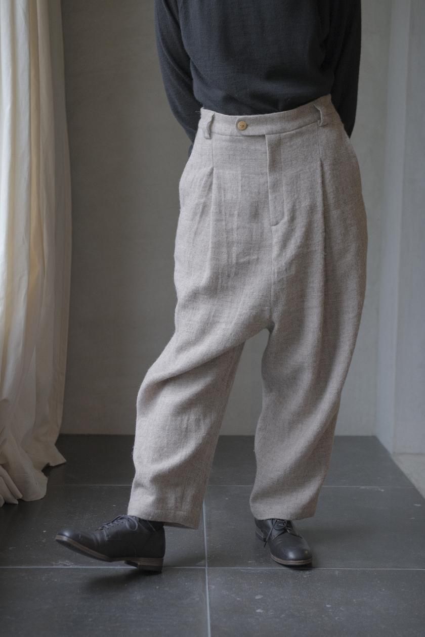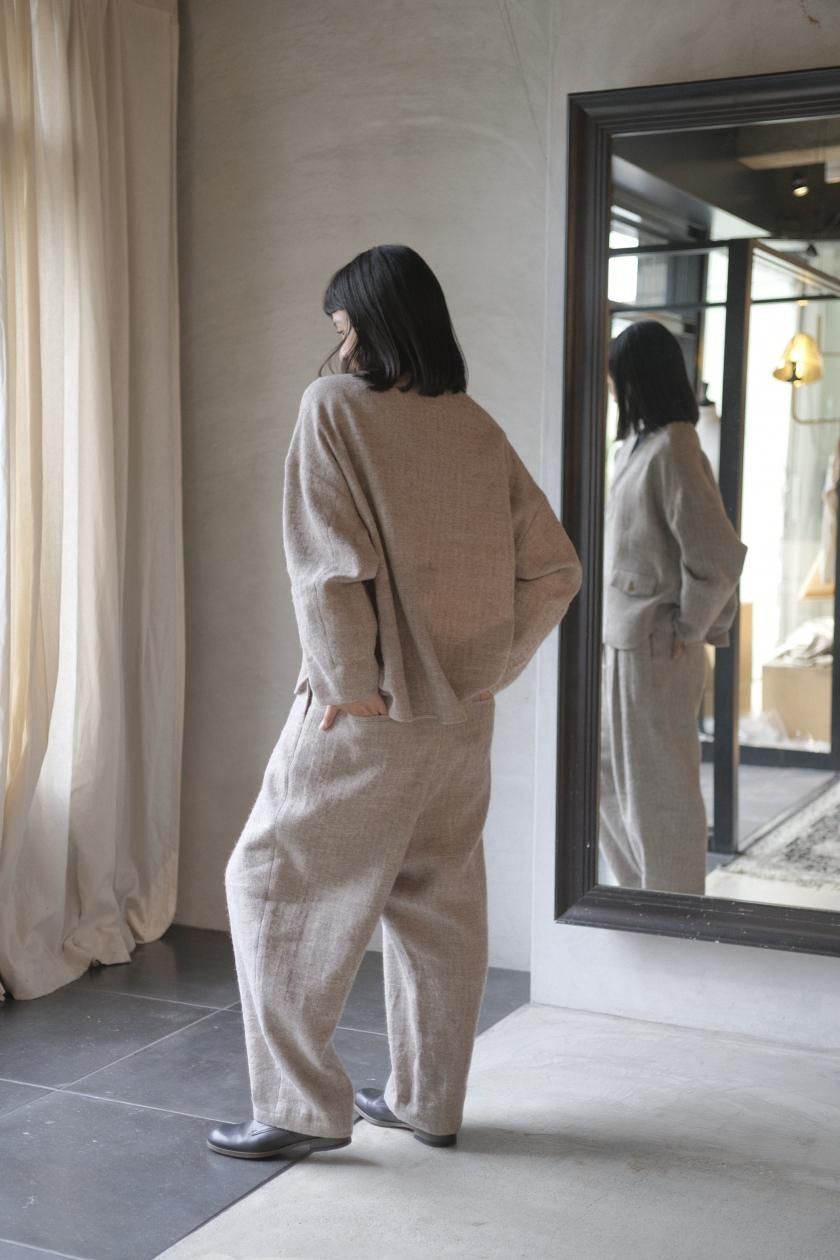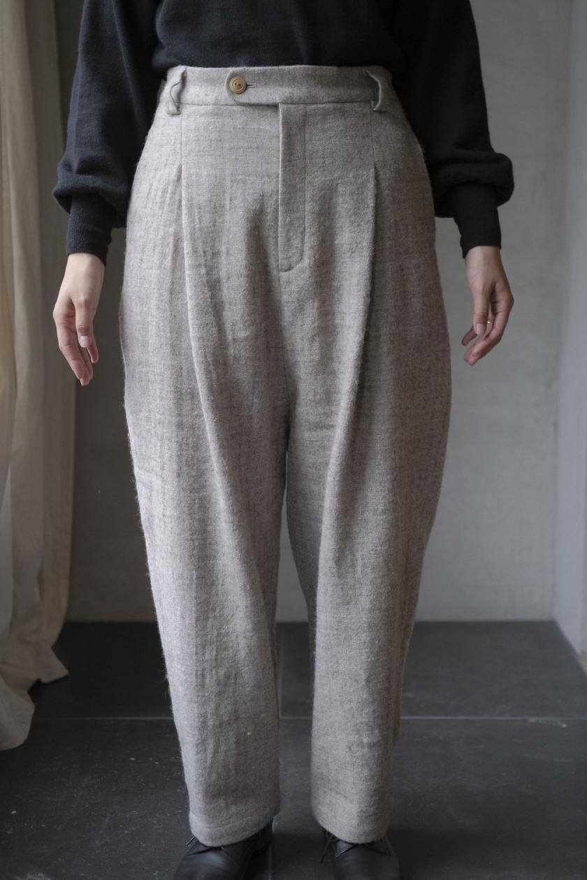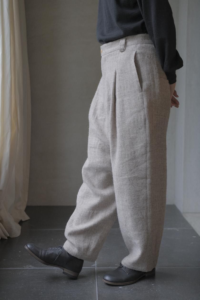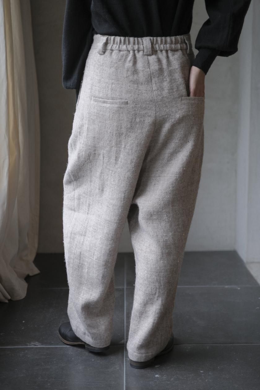 股上が長く、深めのタックが入った、ほどよいサルエル感があるタックワイドパンツを、ざっくりとしたナチュラルなルックスとふくらみのあるシェットランドウールリネンでつくりました。