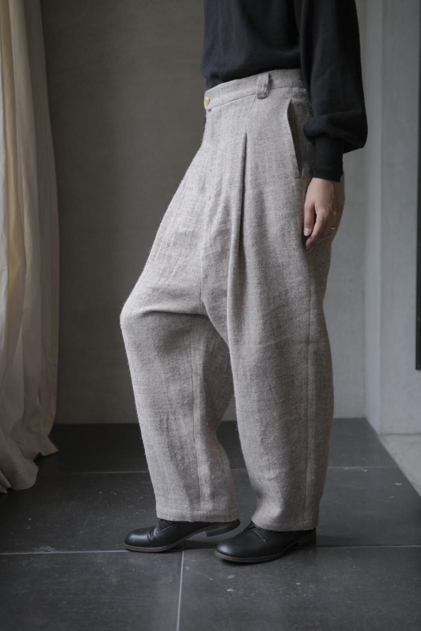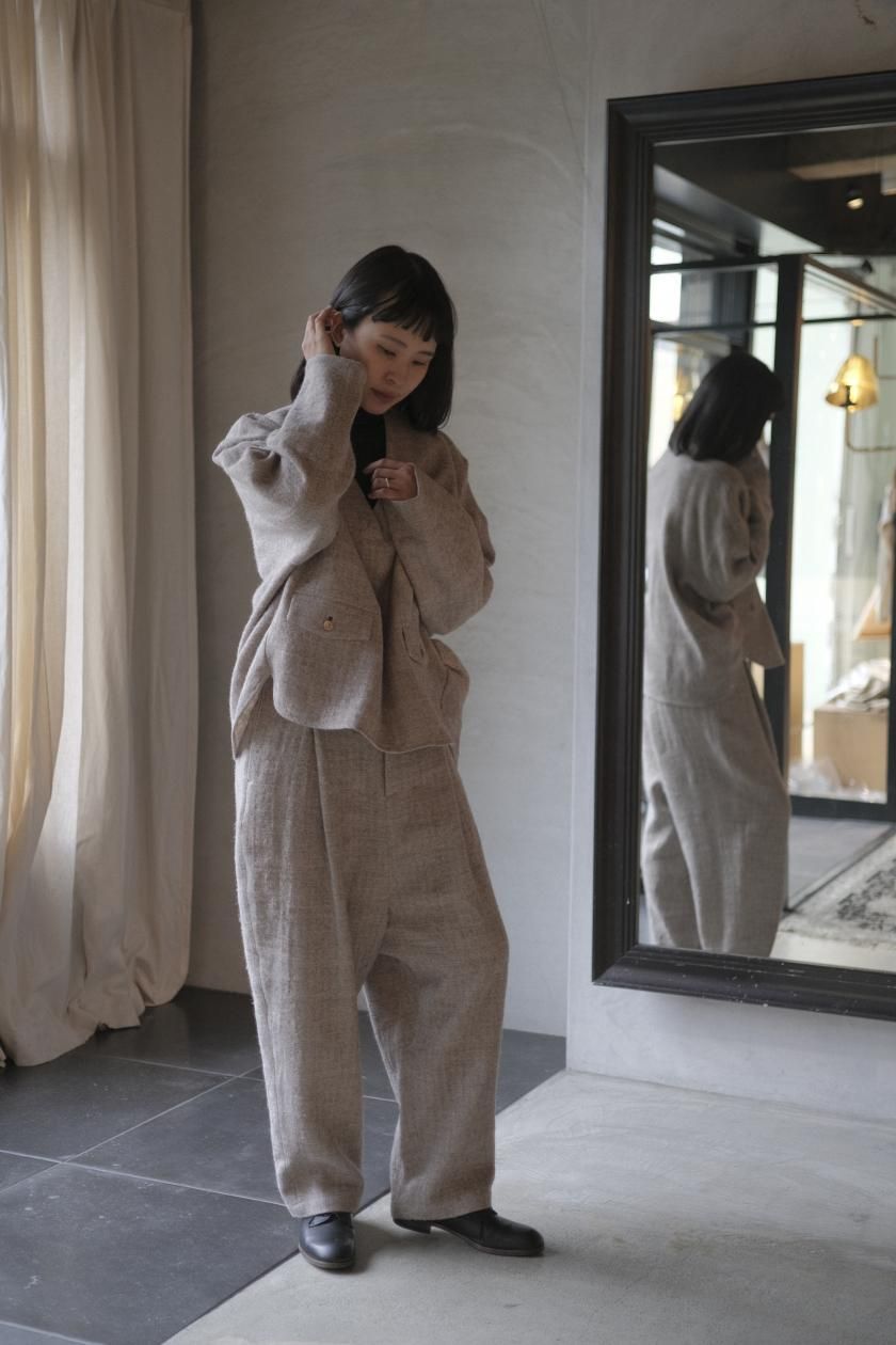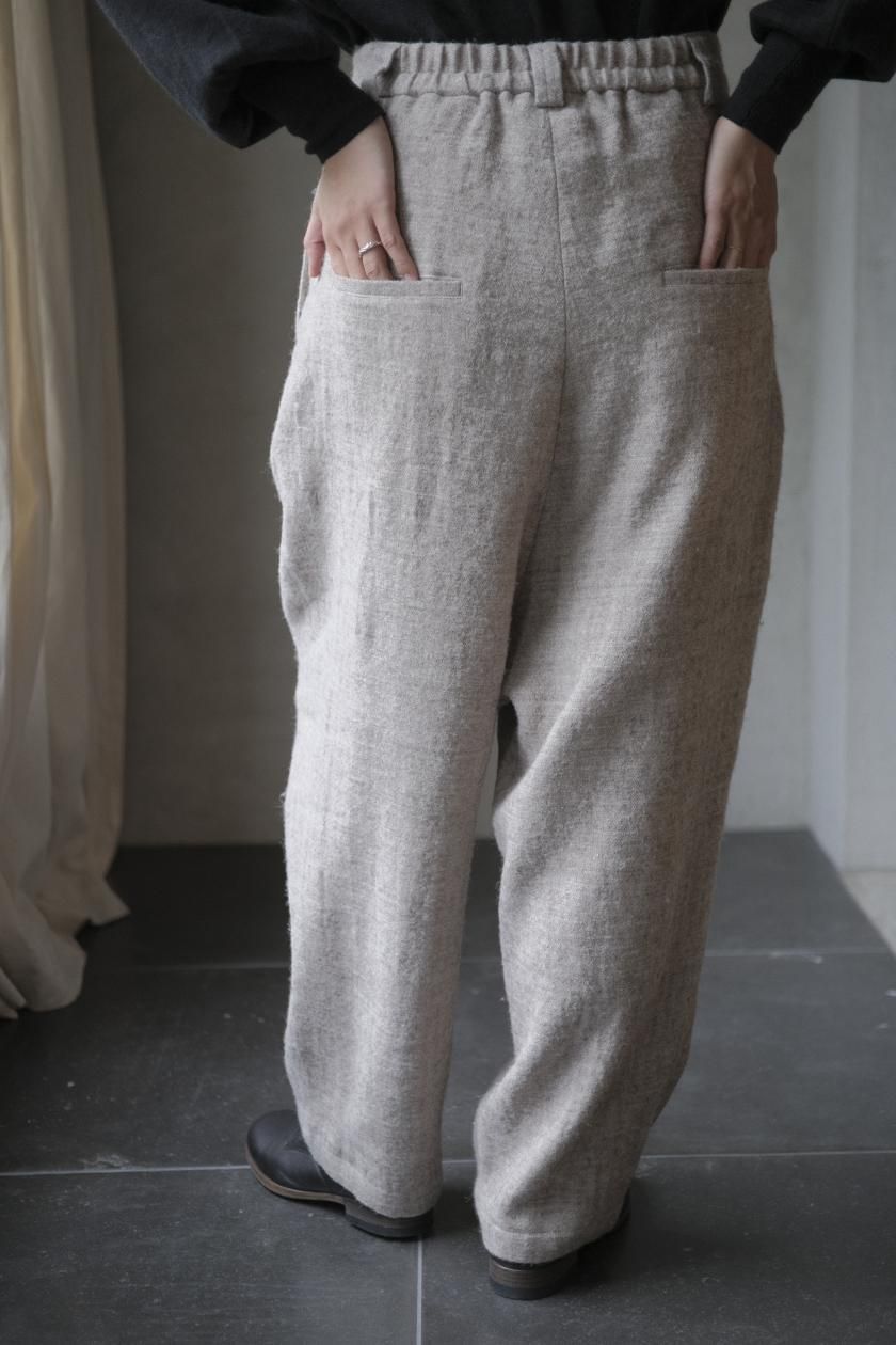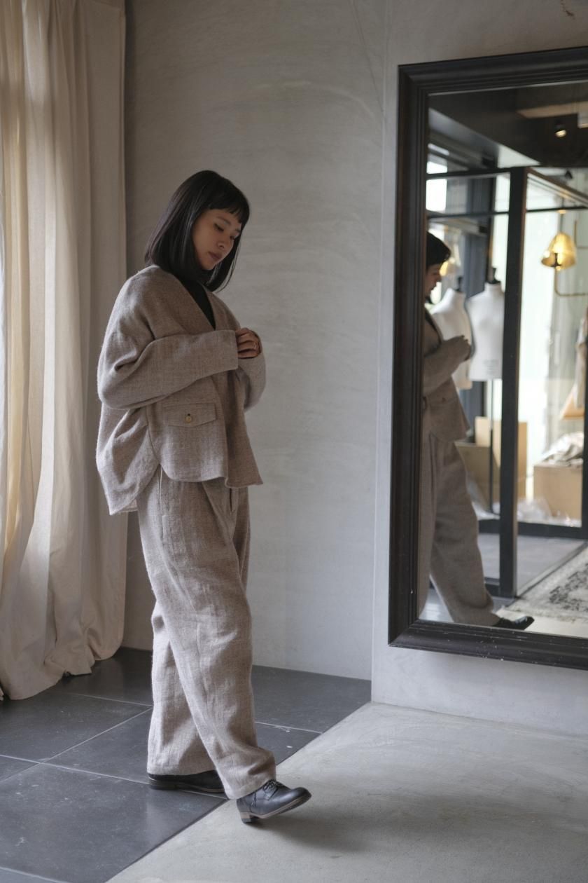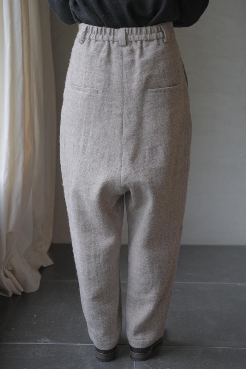 股上が長く、深めのタックが入った、ほどよいサルエル感があるタックワイドパンツを、ざっくりとしたナチュラルなルックスとふくらみのあるシェットランドウールリネンでつくりました。