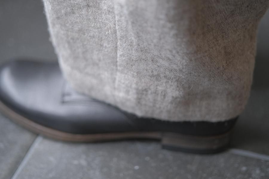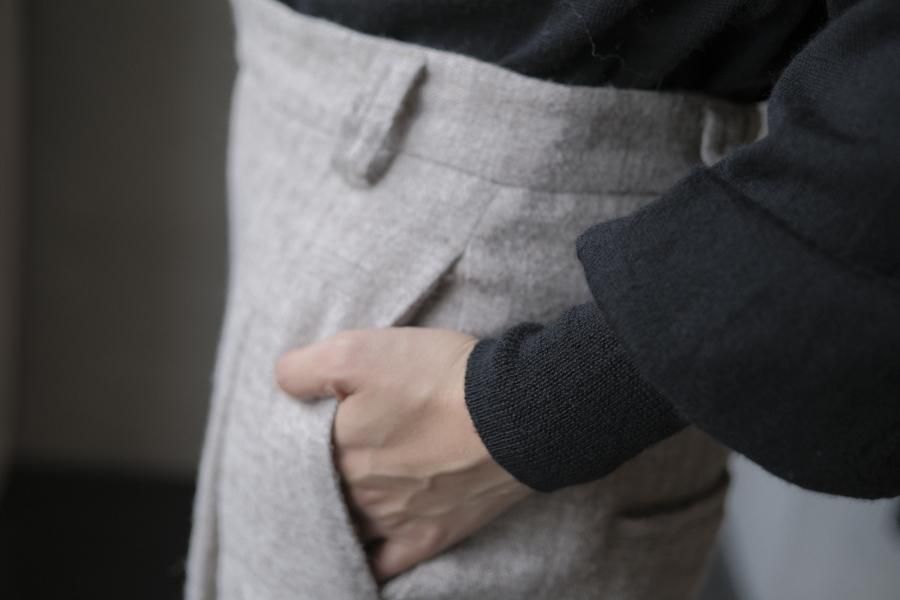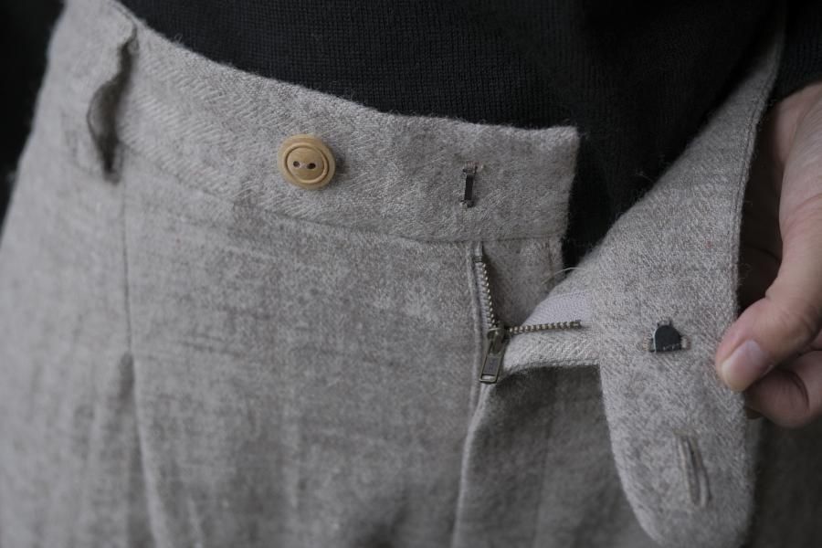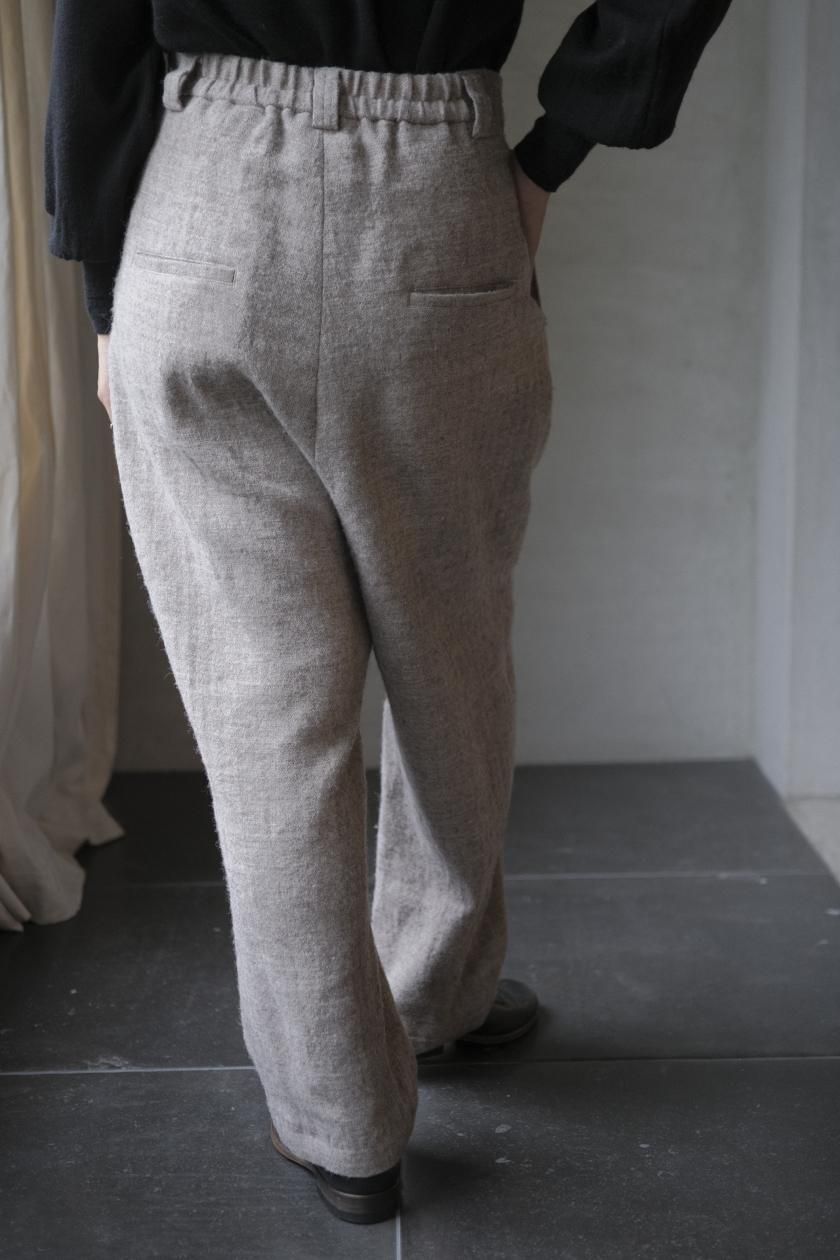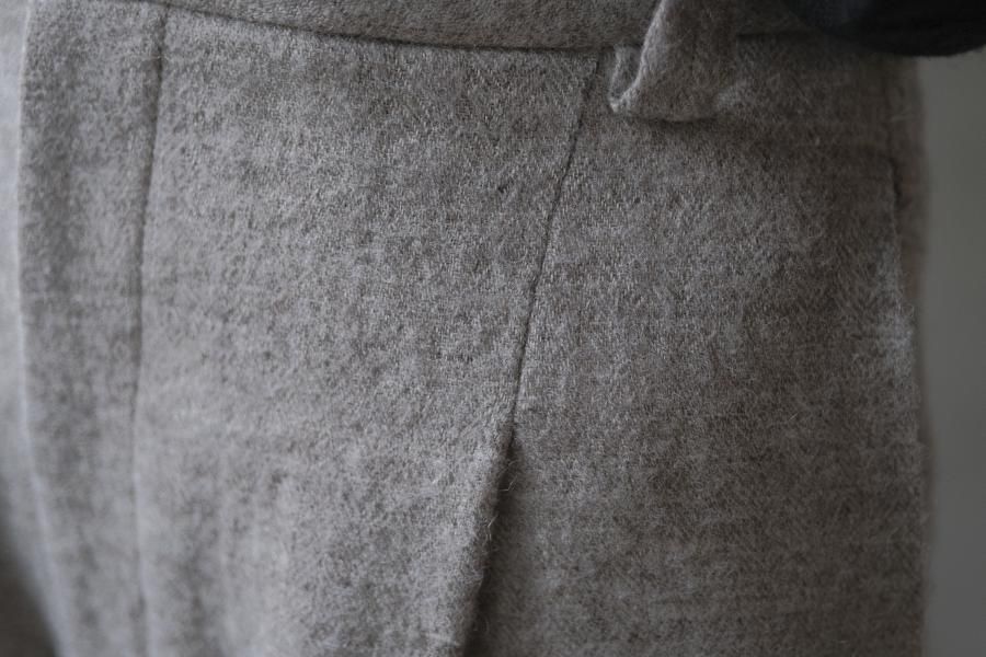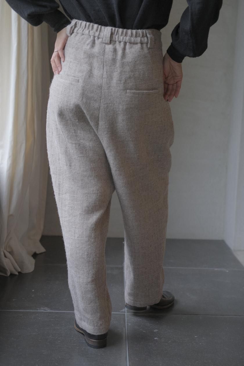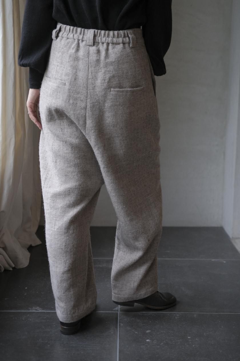 股上が長く、深めのタックが入った、ほどよいサルエル感があるタックワイドパンツを、ざっくりとしたナチュラルなルックスとふくらみのあるシェットランドウールリネンでつくりました。