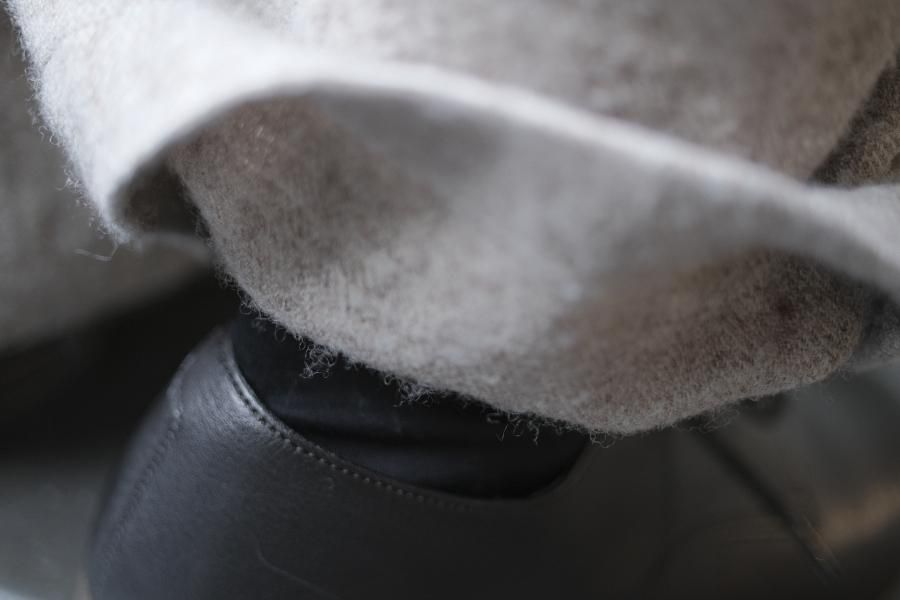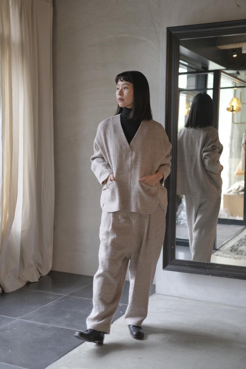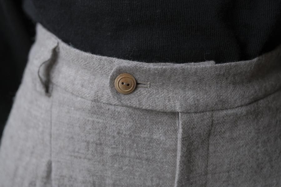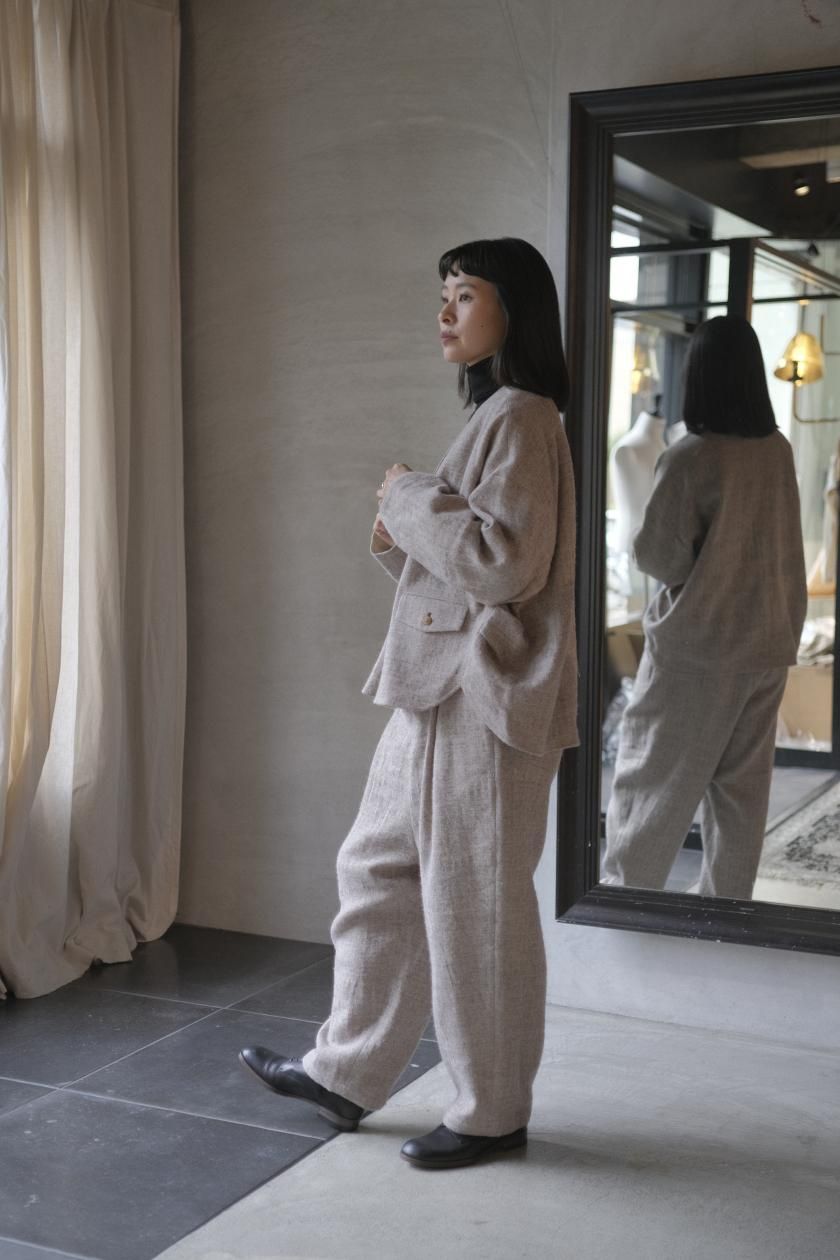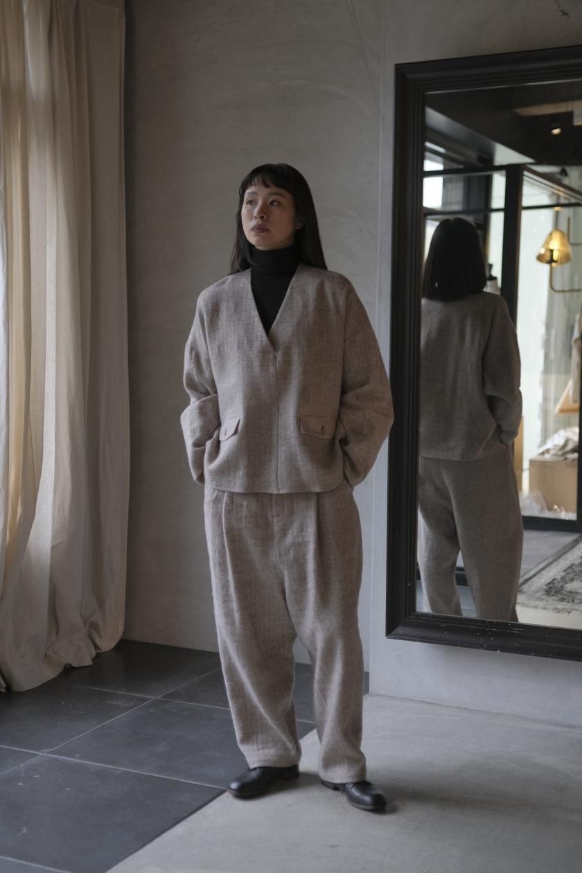 ・使用している生地は、経糸に25番手のノルマンディリネン、緯糸に14番手のシェットランドウールを使用した混紡糸。荒々しさと柔らかさが共存するシェットランドウールリネンのヘリンボーン生地です。