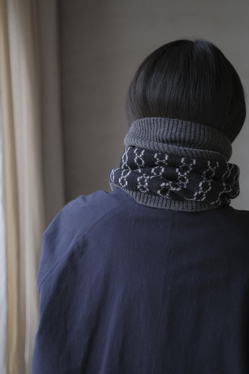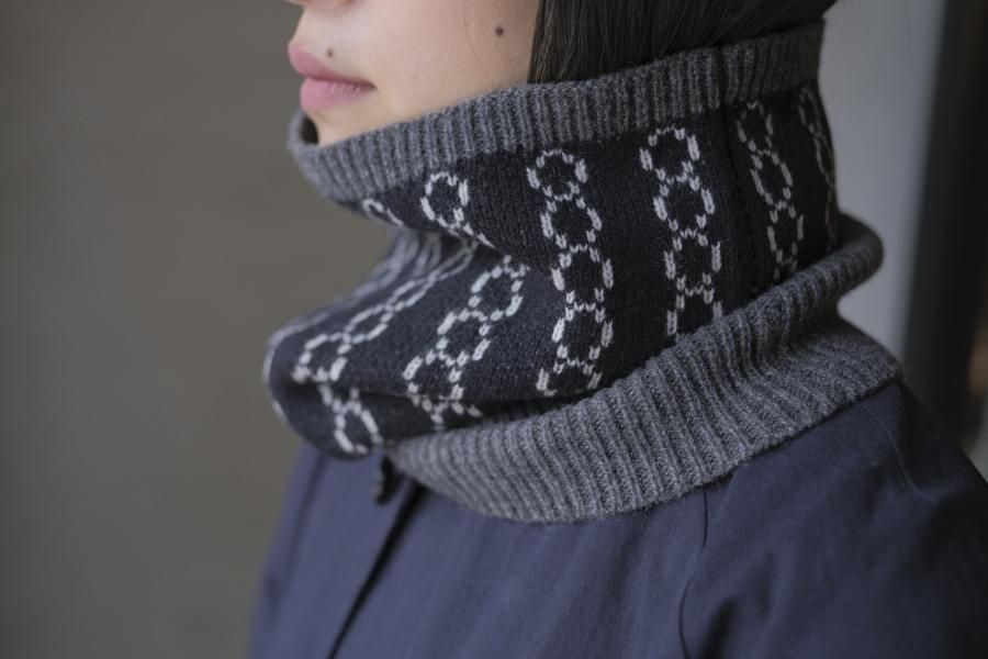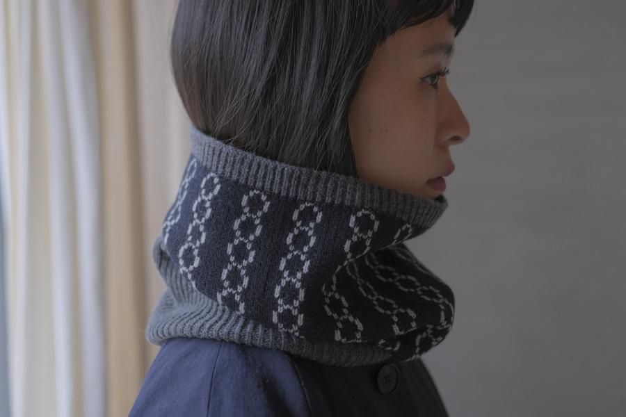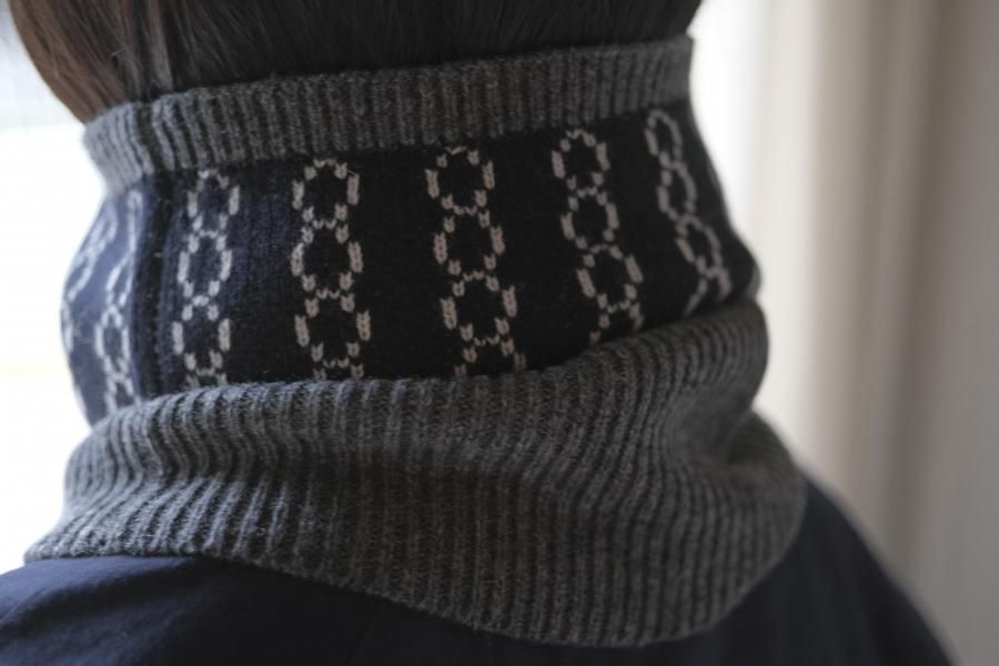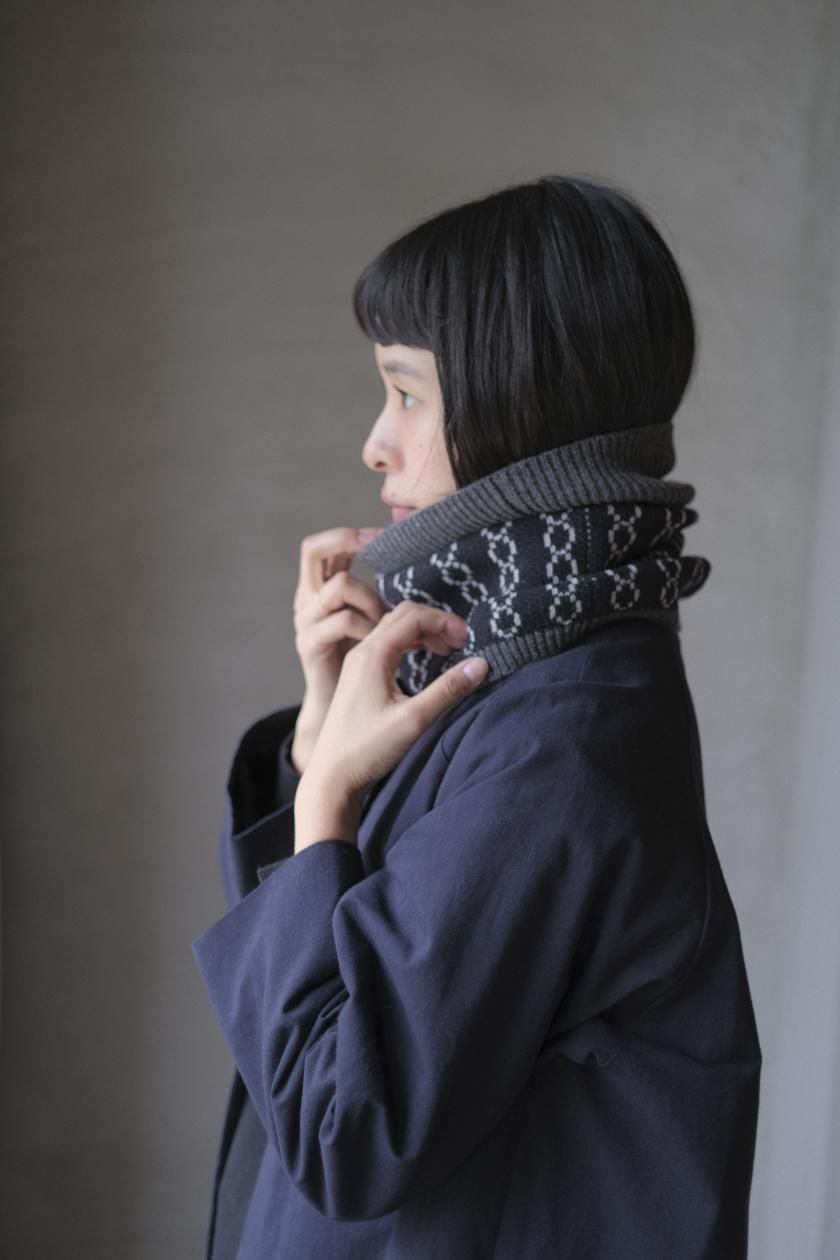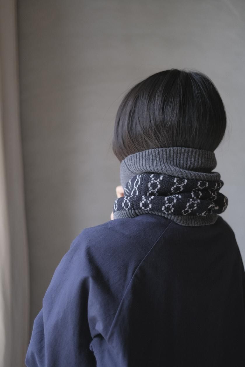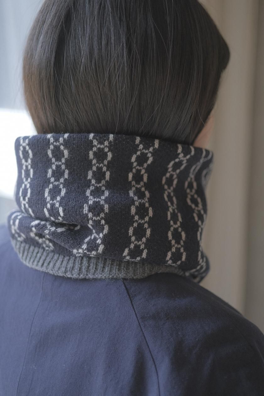 ・リブとジャガードの境目をふたつ折にして、首からかぶる仕様のかわいい防寒アイテムです。