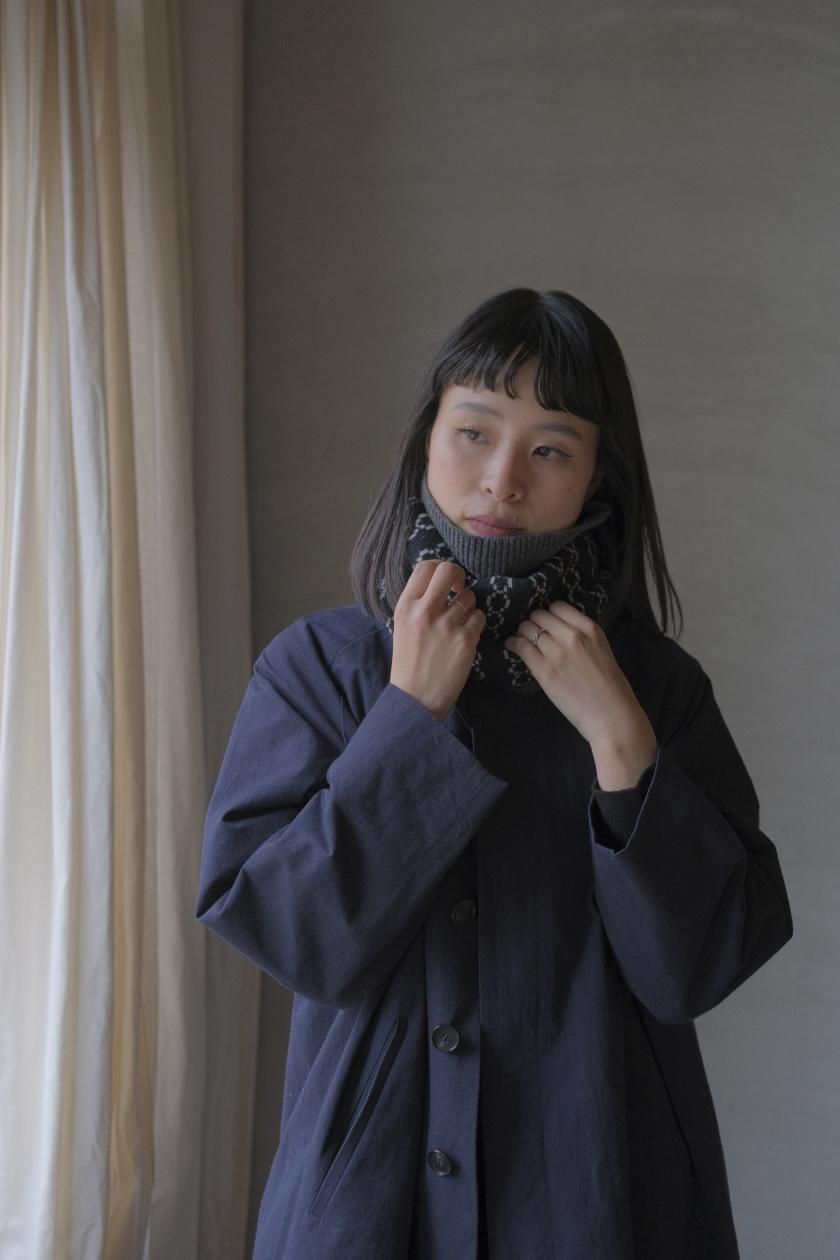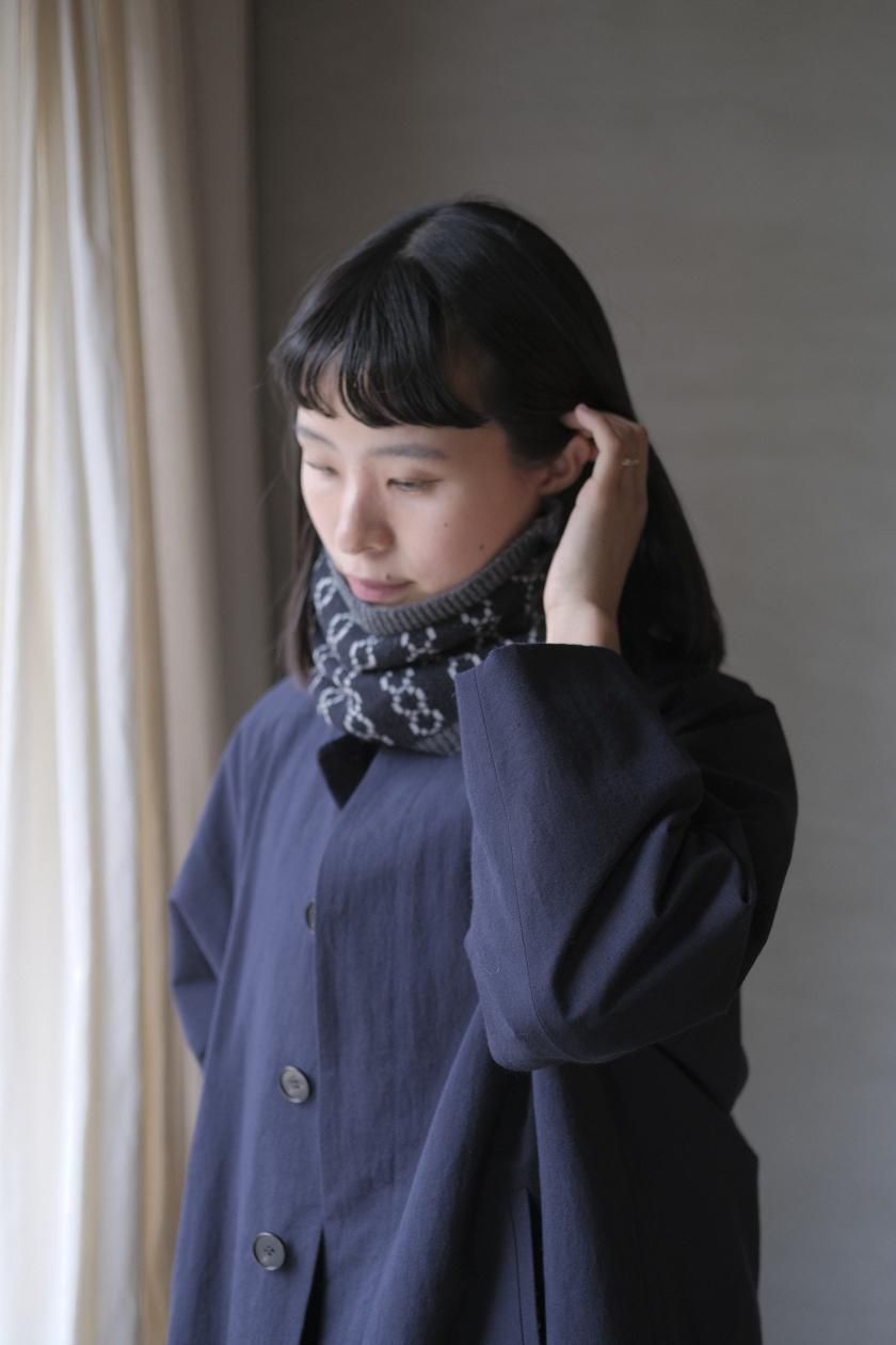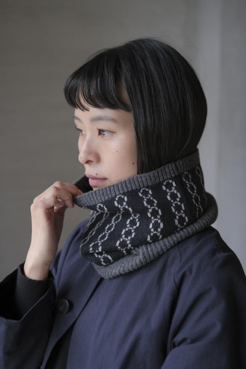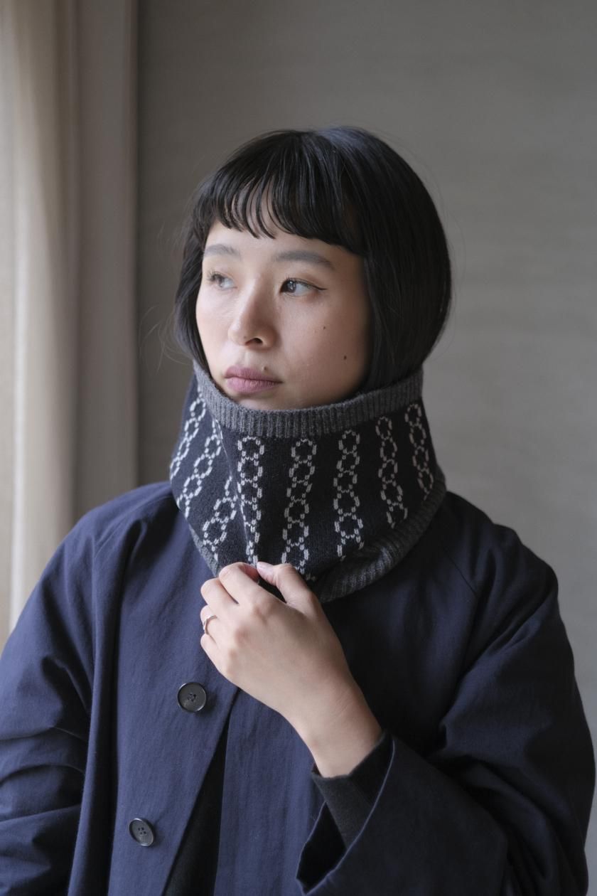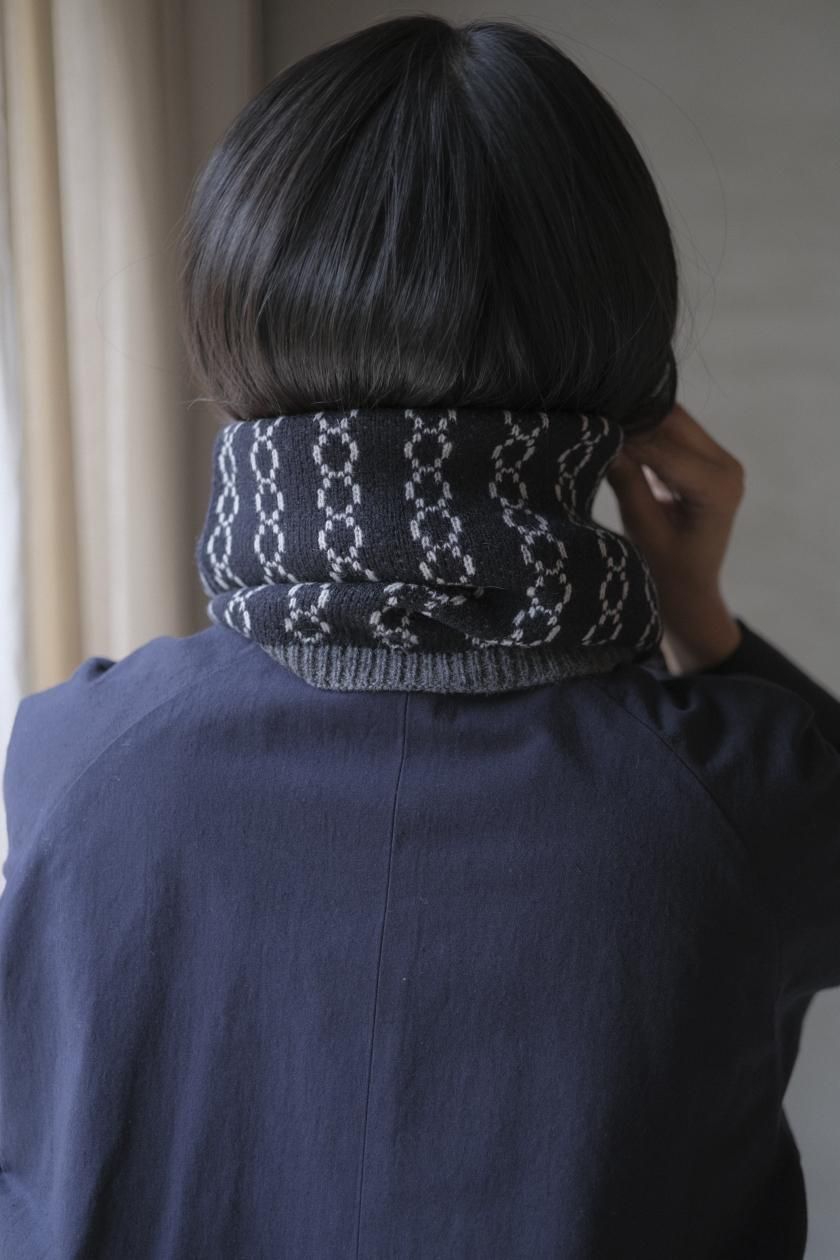 ・リブとジャガードの境目をふたつ折にして、首からかぶる仕様のかわいい防寒アイテムです。